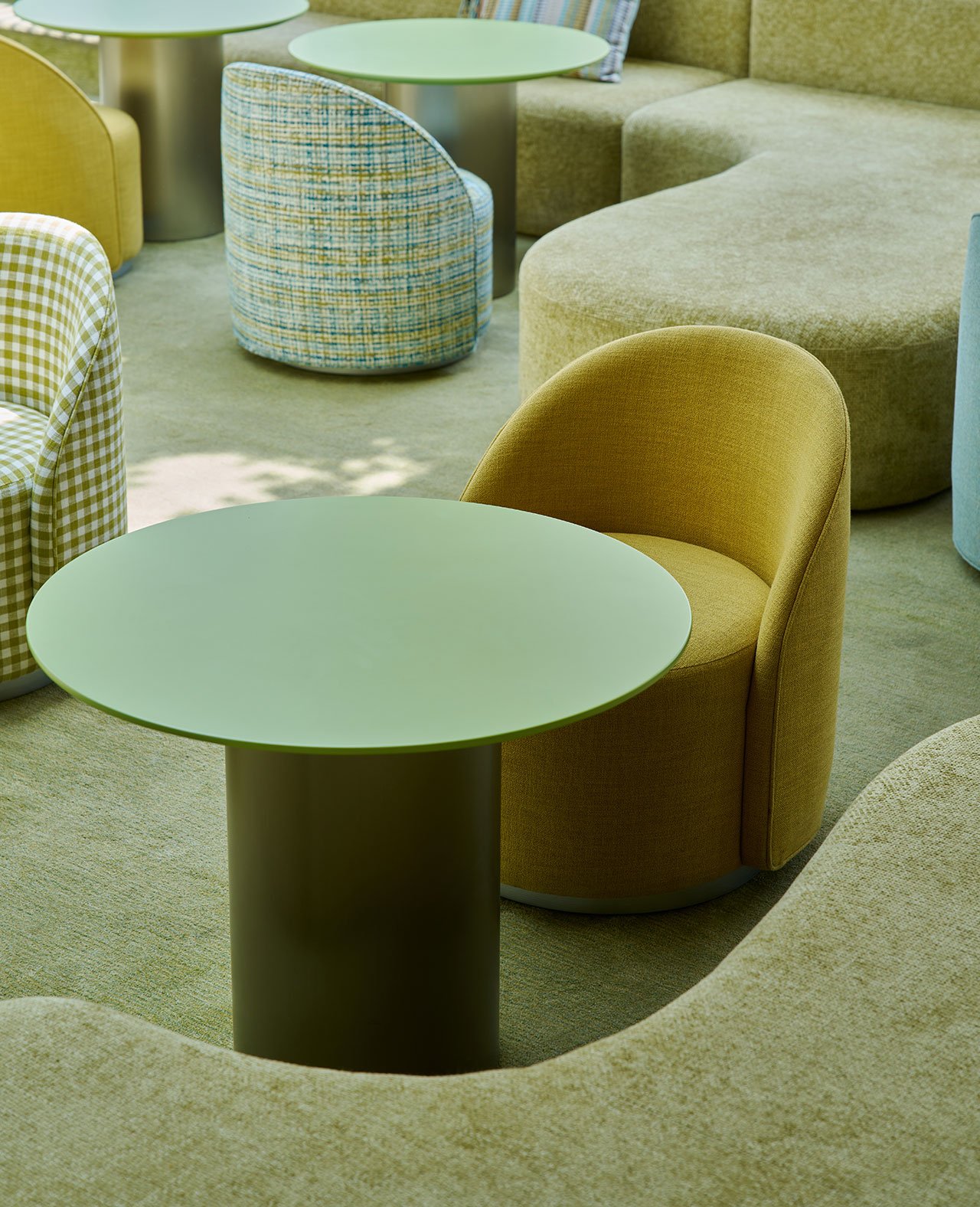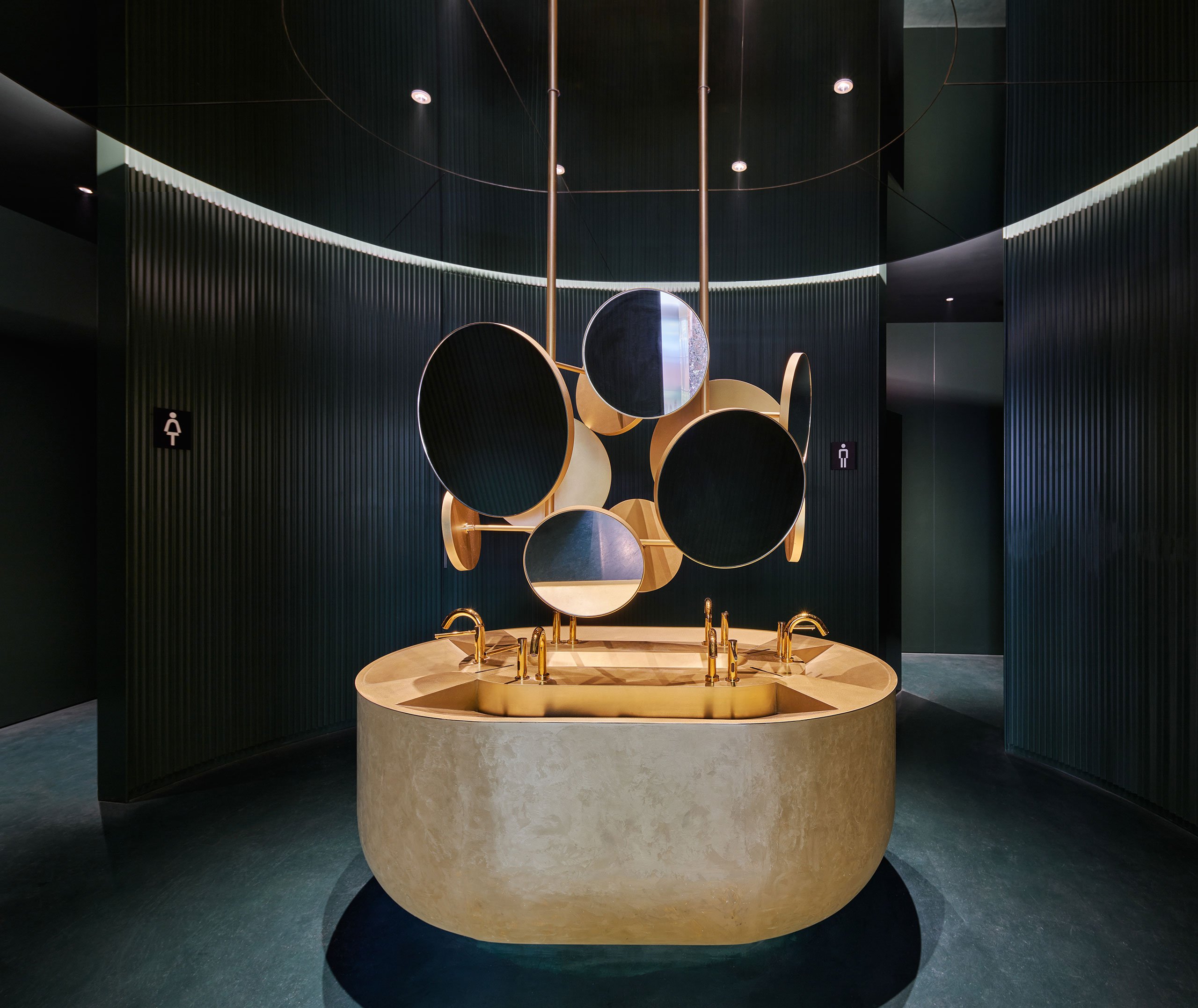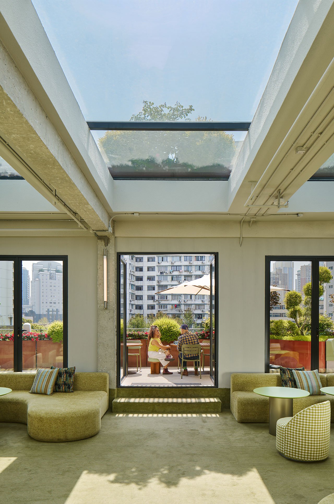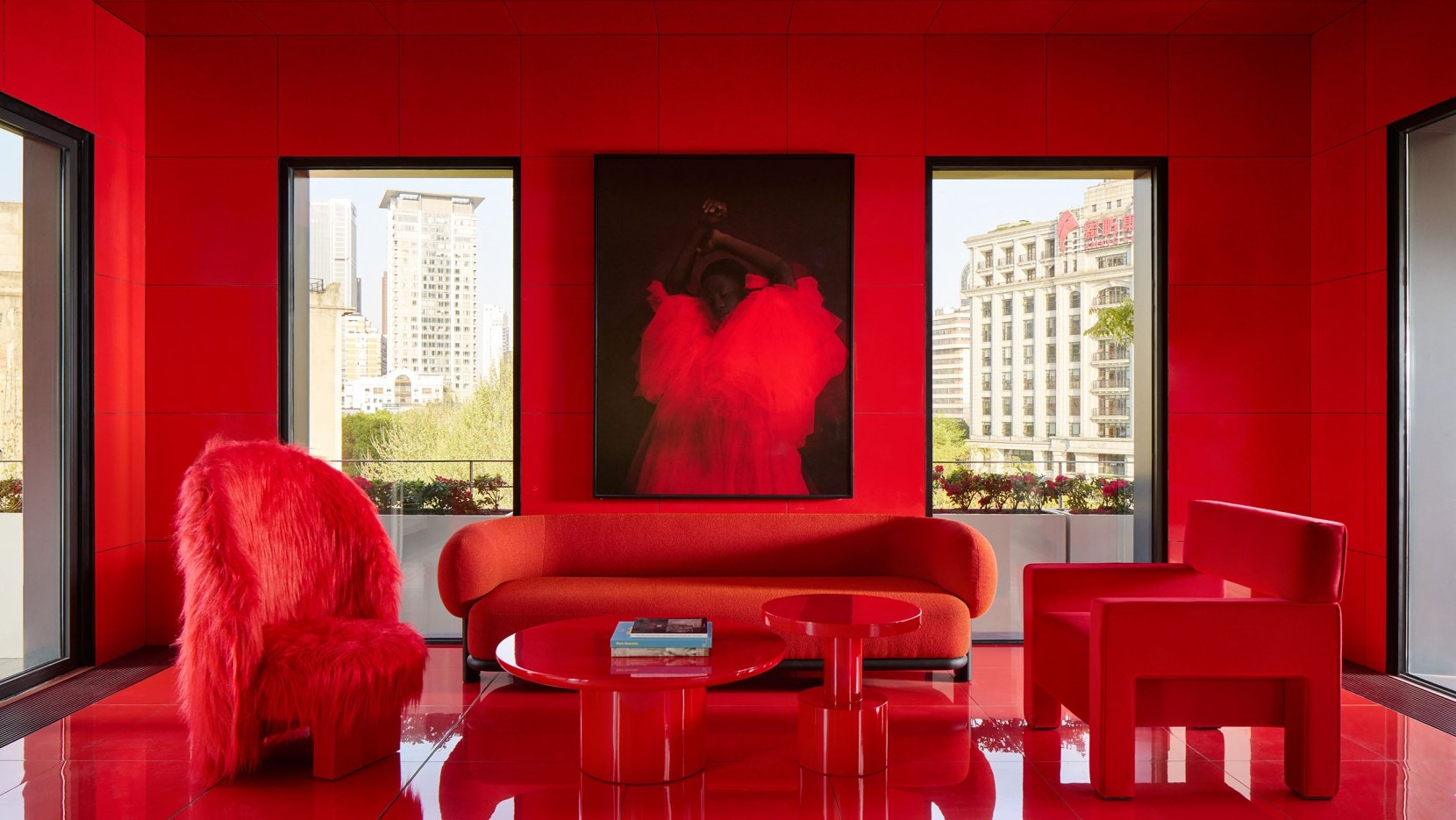 Conceived as a futuristic vision of a traditional garden room, the top floor blends indoor and outdoor spaces, including a vast terrace offering panoramic views of the city. Housing a convivial bar and lounge, this is an ideal place to relax after visiting the exhibitions and share the experience with friends. Exposed concrete walls can also be found here, in this case juxtaposed with plush fabrics, vibrant green and yellow tones, and curvaceous forms courtesy of playfully designed furnishings. Finally, a VIP room boldly swathed from floor to ceiling in red tones further underscores the entire scheme and its overall objective to create a unique and memorable experience.