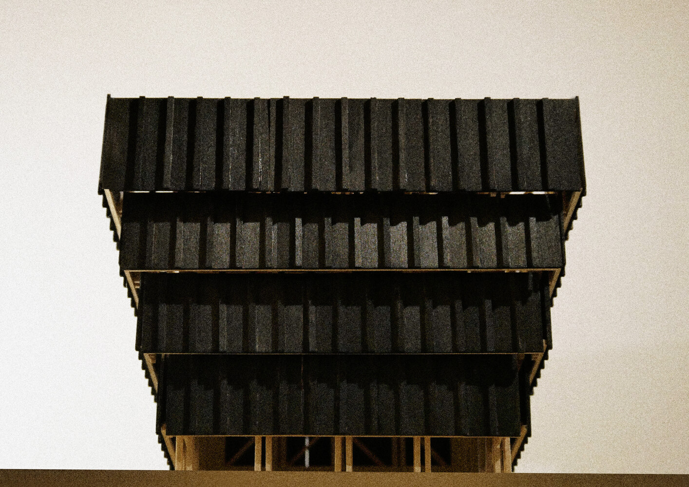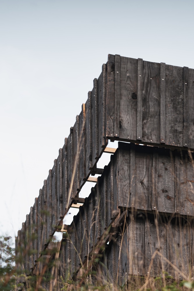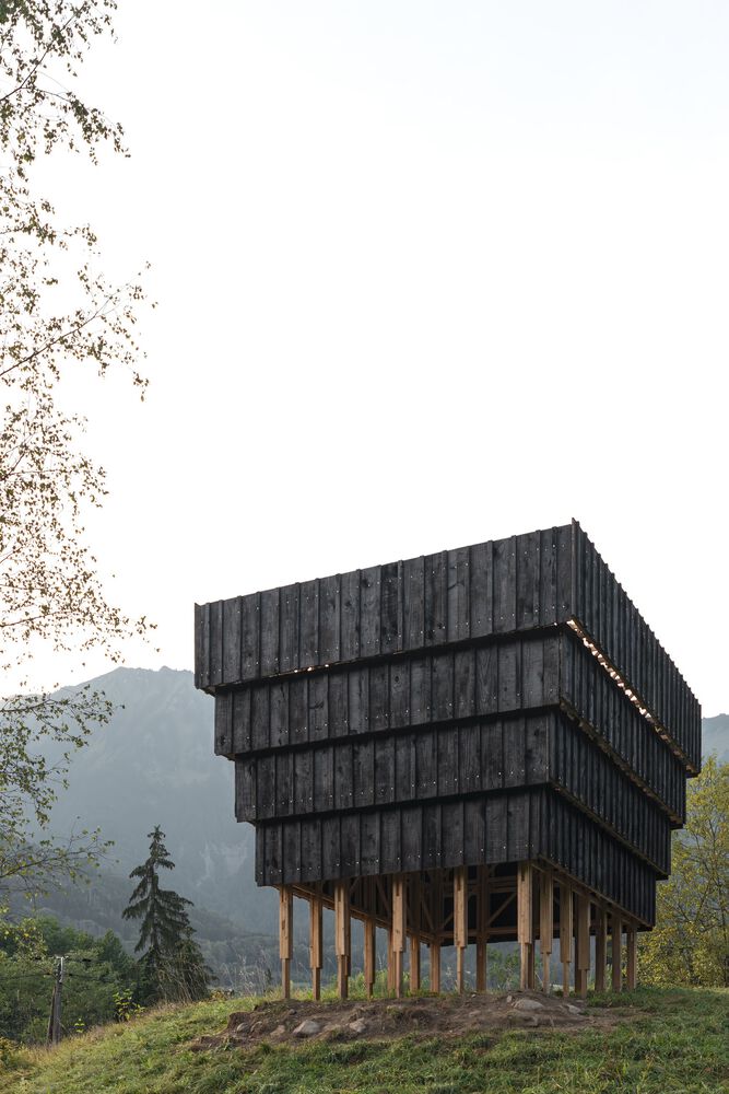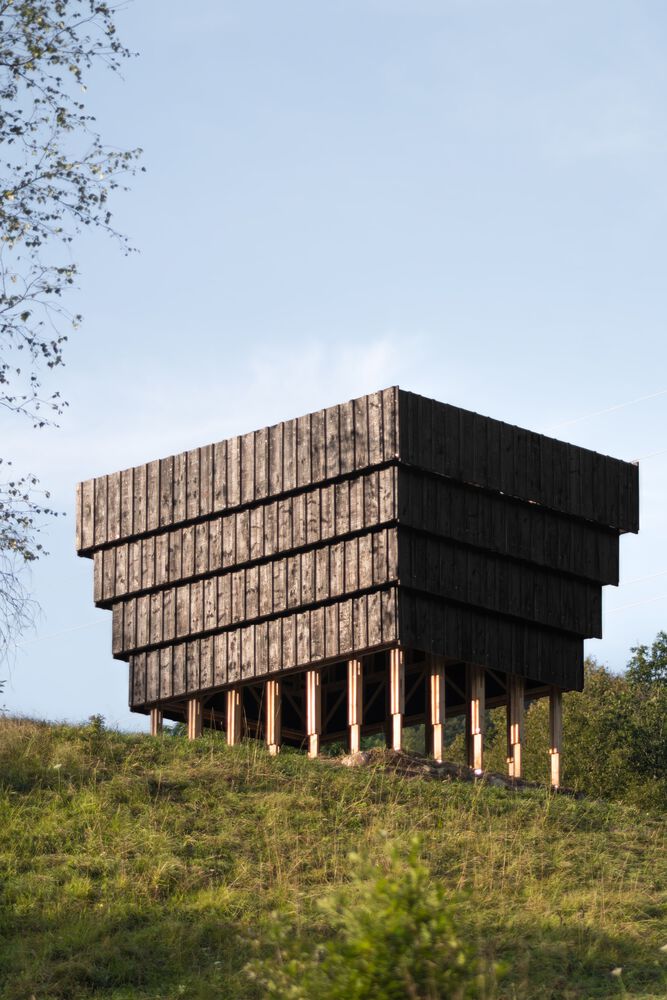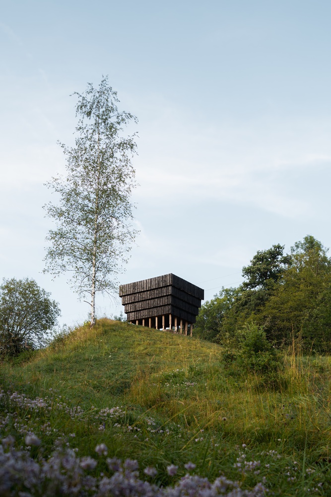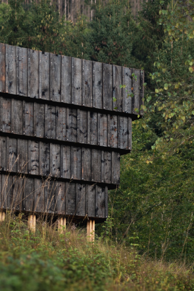 핵심 개념: 불에 탄 나무와 빛의 상호작용을 통한 자연과의 교감. 이 오두막은 과거 탄광 지역에서 채굴된 갈탄과 그 지역의 어두운 자연 풍경에서 영감을 받았다. 탄화된 목재를 통해 탄광 지역의 역사를 상징하며, 빛과 그림자의 상호작용을 디자인에 통합했다.