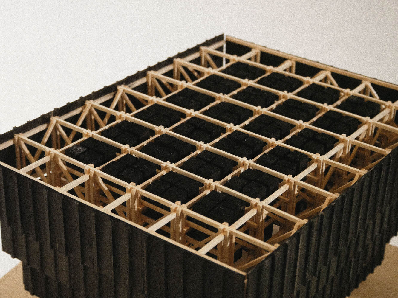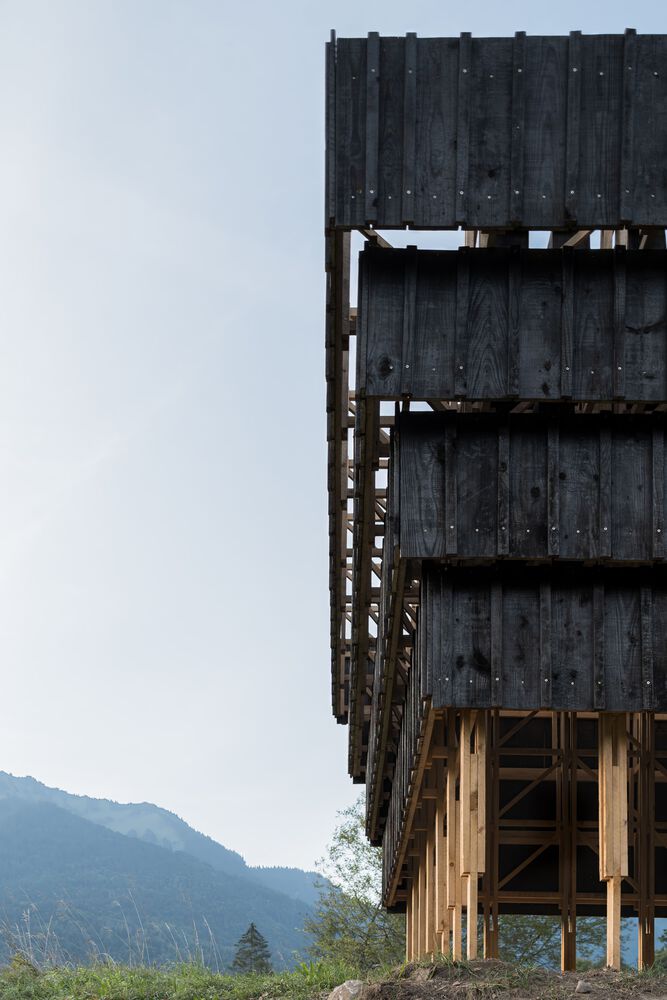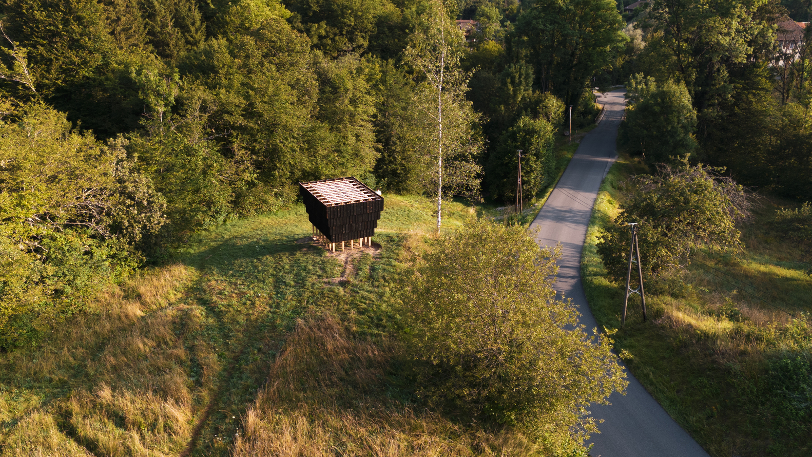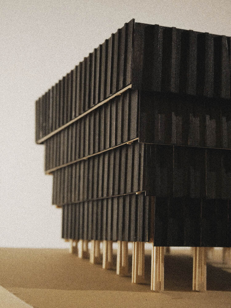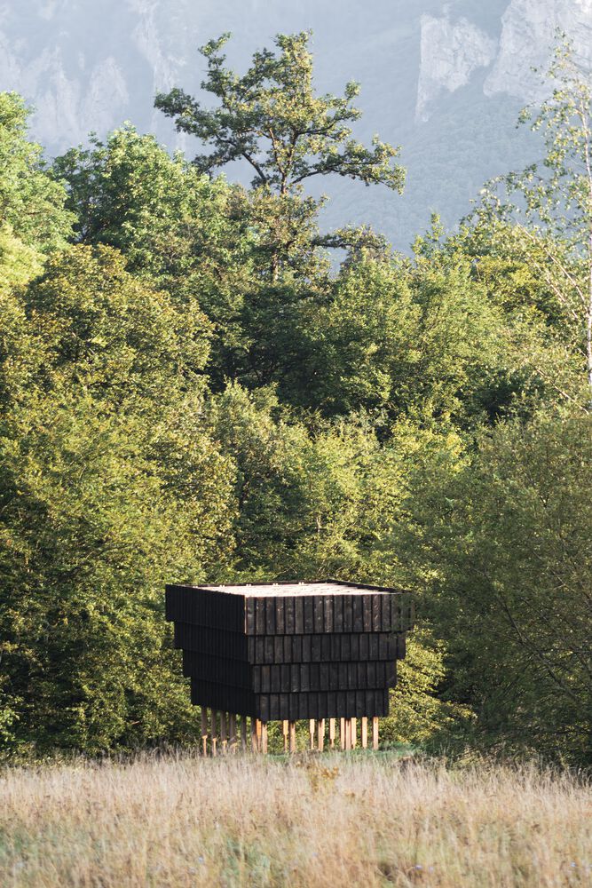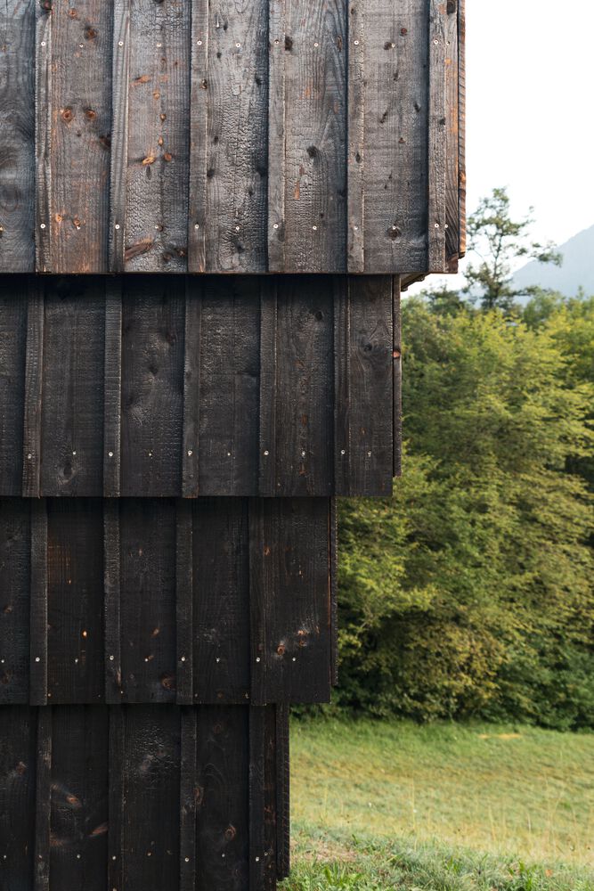 핵심 개념: 불에 탄 나무와 빛의 상호작용을 통한 자연과의 교감. 이 오두막은 과거 탄광 지역에서 채굴된 갈탄과 그 지역의 어두운 자연 풍경에서 영감을 받았다. 탄화된 목재를 통해 탄광 지역의 역사를 상징하며, 빛과 그림자의 상호작용을 디자인에 통합했다.