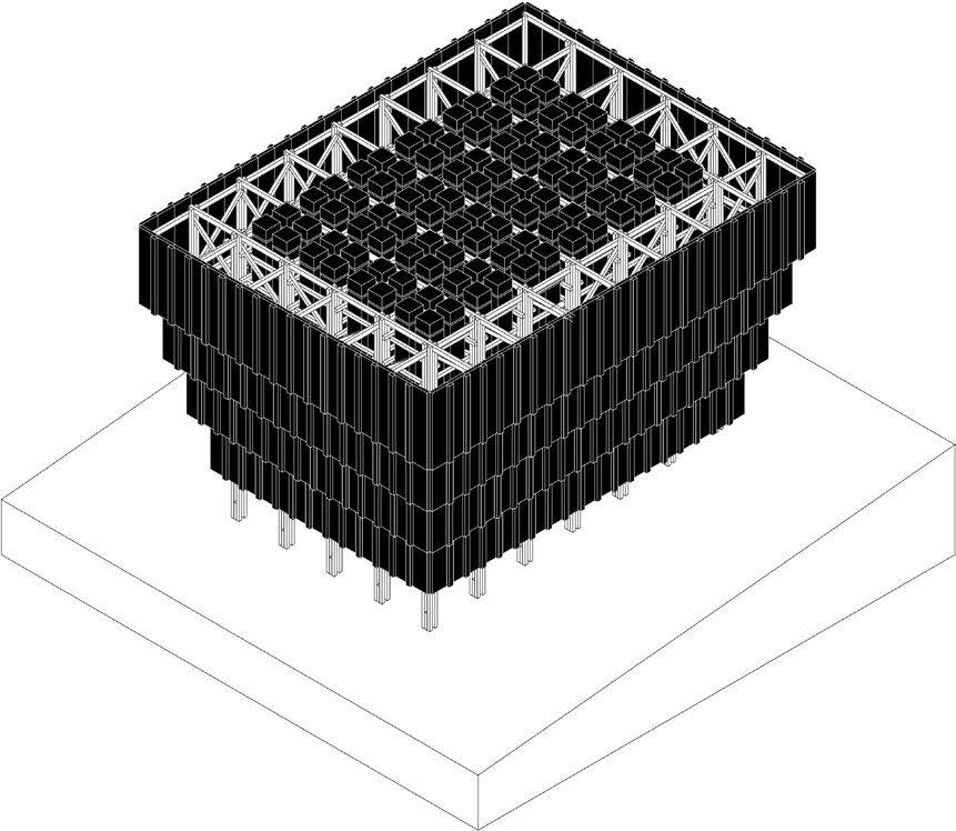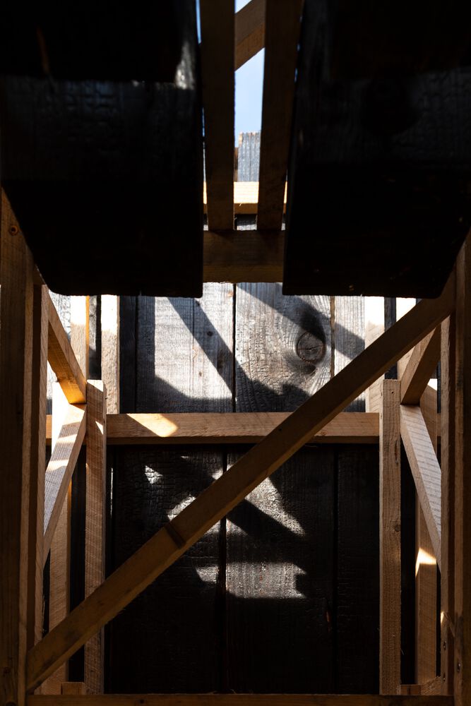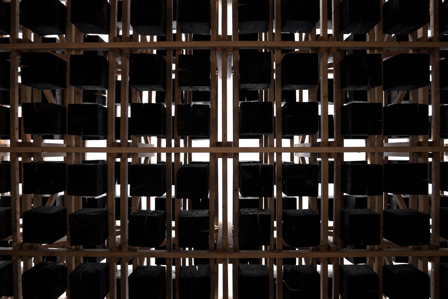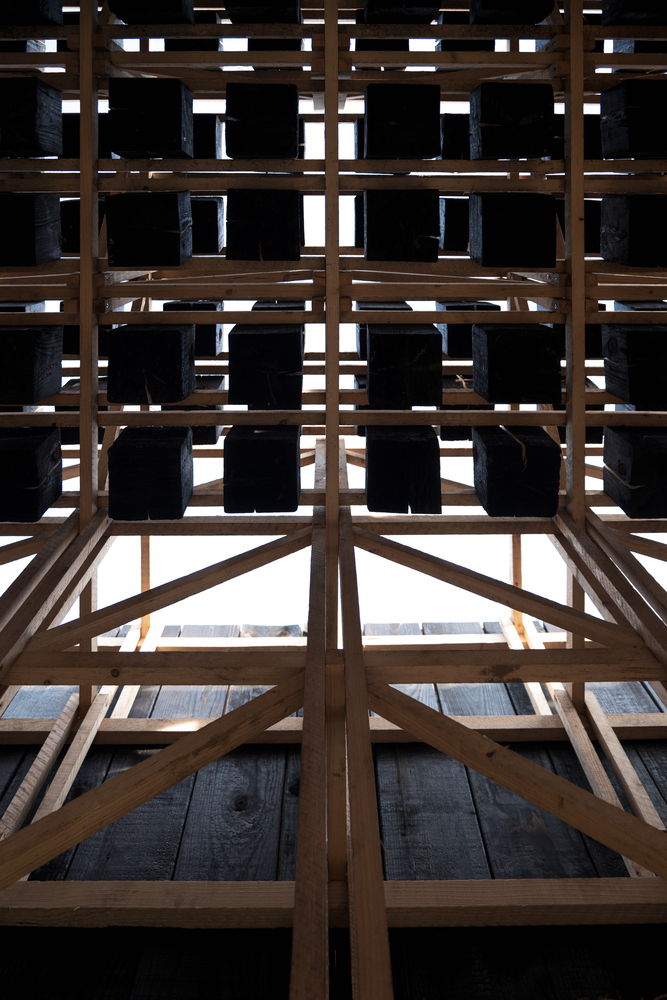 디자인 특징: 오두막의 외벽은 탄화된 목재로 덮여 있으며, 이 목재는 내부로 들어오는 빛을 제어하며 특별한 패턴을 형성한다. 빛과 그림자의 상호작용은 이 오두막의 설계에서 중요한 요소로, 방문자가 내부로 들어가면서 그들이 느끼는 경험을 크게 좌우한다. 자연재료 사용과 함께 기둥들이 구조적 안정성을 유지하면서, 시각적으로도 조화를 이룬다.
