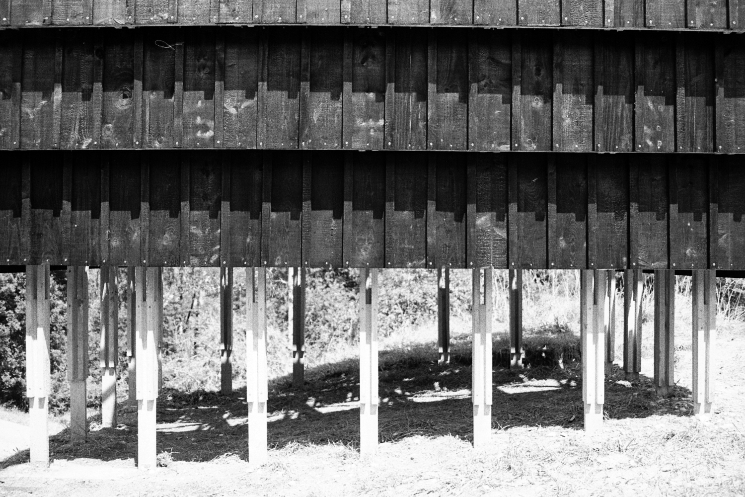 In the distance, the hiker sees a black mass. Across the expanse, the sun no longer reigns, and the wooden cabin becomes the focal point. The light and the hiker attempt to penetrate the object, disrupting their respective rituals. The cabin seems to invite them in, yet it hinders their progress. The light struggles to enter the fossil of the old mine. It has slipped between the charred wooden blocks, reminiscent of the lignite ore once mined just a few hundred meters away.