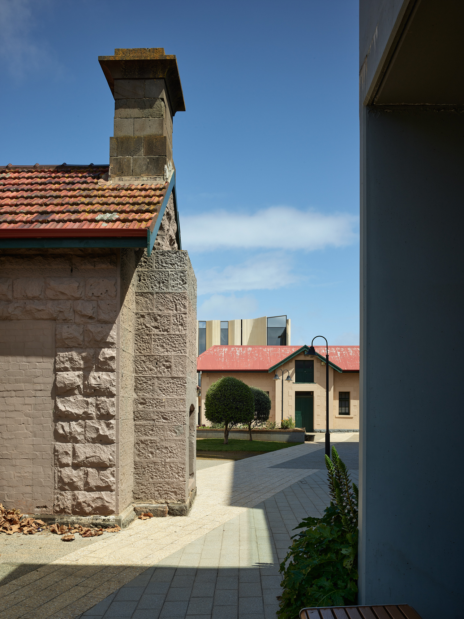 The vaulting contemporary form borrows from the palette of the original structure it adjoins; expanses of cream interspersed with long charcoal lines creating just enough continuity for the two to harmonise while still allowing the new form to shine. This is also evident in the original in-ternal rendered-brick walls of the Orderly Room, which are left exposed as a majestic reminder of the persisting history of the building. The glass link joining the two buildings opens at both sides, serving as a passageway for students crossing the campus. Glass is used generously at all three levels, washing the shared spaces in natural light and offering views over Warrnambool township and the wild Southern Ocean.
