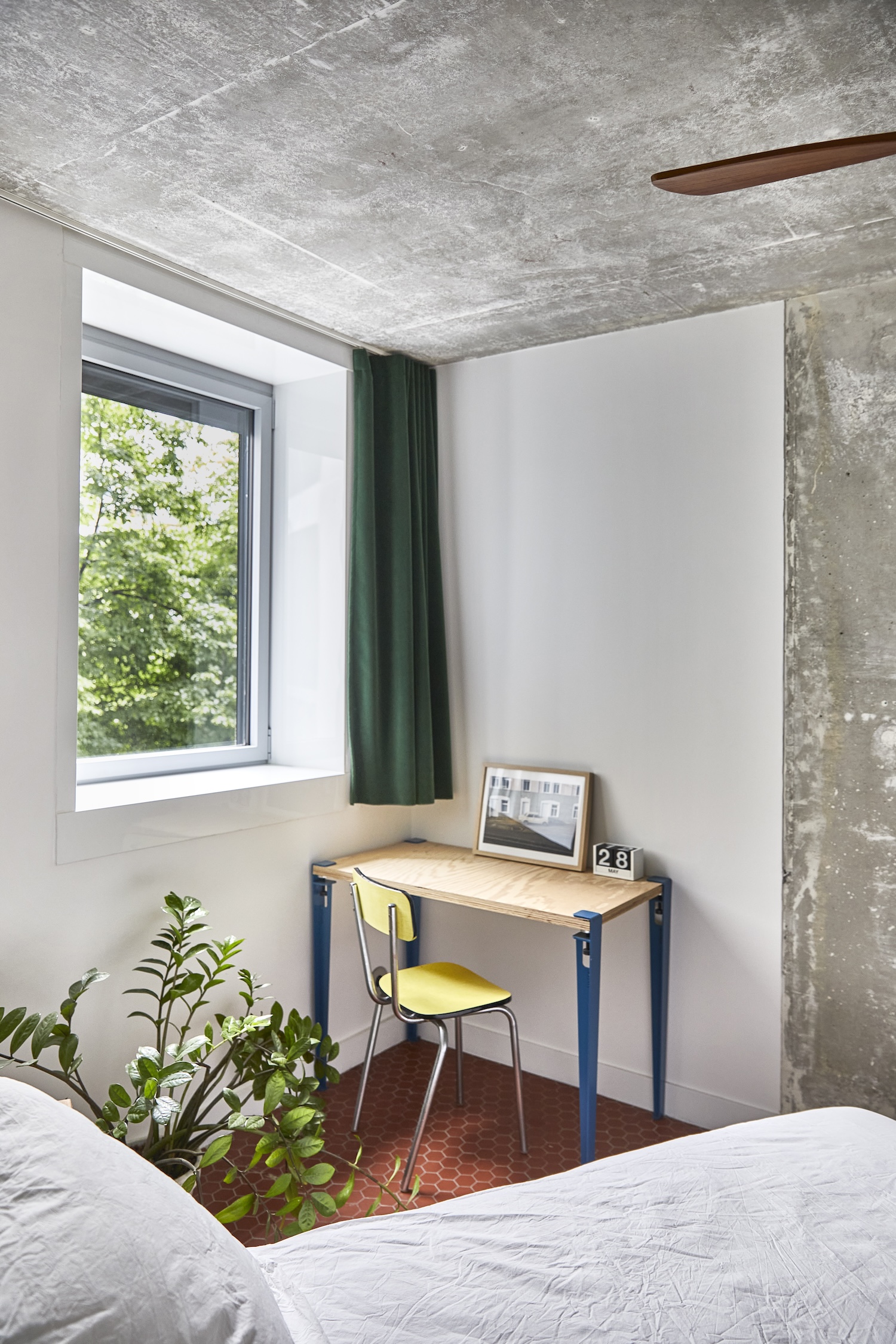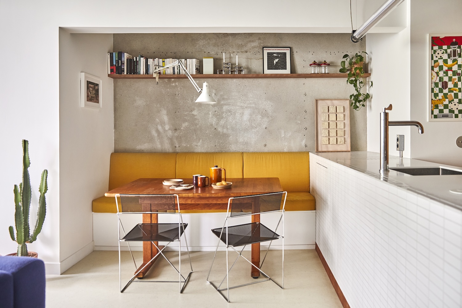 Tour Cantate 아파트는 주방과 거실을 통합하여 넓고 개방된 공간을 형성했습니다. 원래 폐쇄적이었던 주방이 거실과 자연스럽게 연결되면서 새로운 침실을 만들어냈습니다. 주방은 타일로 마감된 큰 카운터 뒤에 숨겨져 있습니다. 이는 깔끔하고 간결한 미니멀리즘 디자인을 강화합니다. 거울이 장착된 피벗 도어는 자전거 보관과 세탁 시설을 숨기면서도 공간감을 더해줍니다.