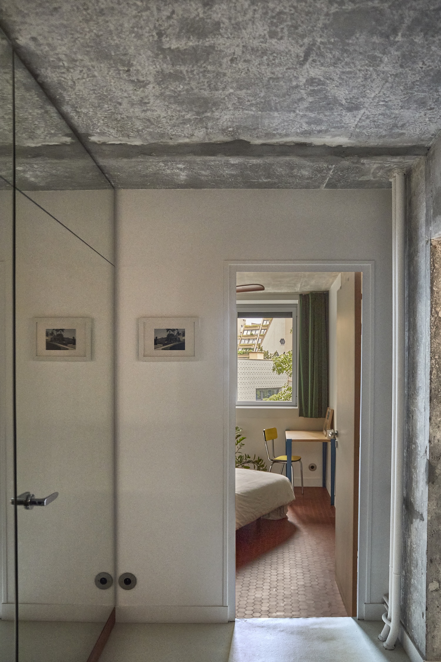Tour Cantate is a minimalist apartment located in Paris, France, designed by Augure Studio. Nestled within the prestigious Cantate Tower a crown jewel of Parisian residential architecture and a cornerstone of the “Les Orgues de Flandres” complex—this apartment epitomizes the art of reimagining space. The dwelling, originally conceived by renowned German architect Martin Van Treeck during the 1970s, has undergone a subtle yet transformative metamorphosis, preserving its essence while elevating its functionality. At the heart of this reinvention lies a masterful reconfiguration: the kitchen, once sequestered, now integrates seamlessly into the living area, concealed behind an expansive tiled counter—a testament to the marriage of form and function. This ingenious relocation has birthed an additional bedroom, expanding the apartment’s potential without sacrificing its inherent comfort. A mirrored pivot door now stands as a portal to practicality, elegantly masking a utilitarian space dedicated to bicycle storage and laundry facilities. This thoughtful addition harmonizes the demands of modern urban living with the apartment’s refined aesthetic, creating a sanctuary that is at once sophisticated and eminently livable.