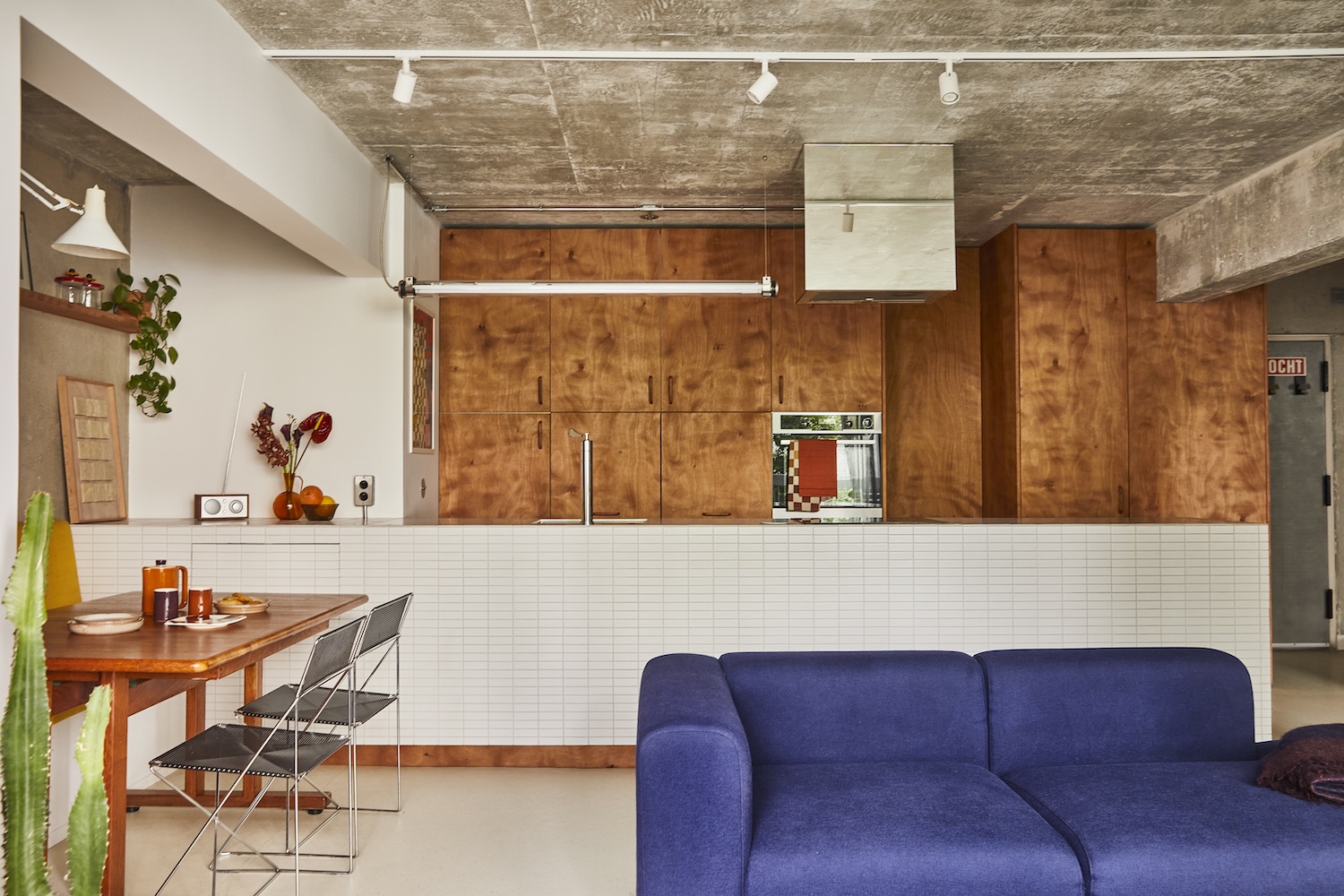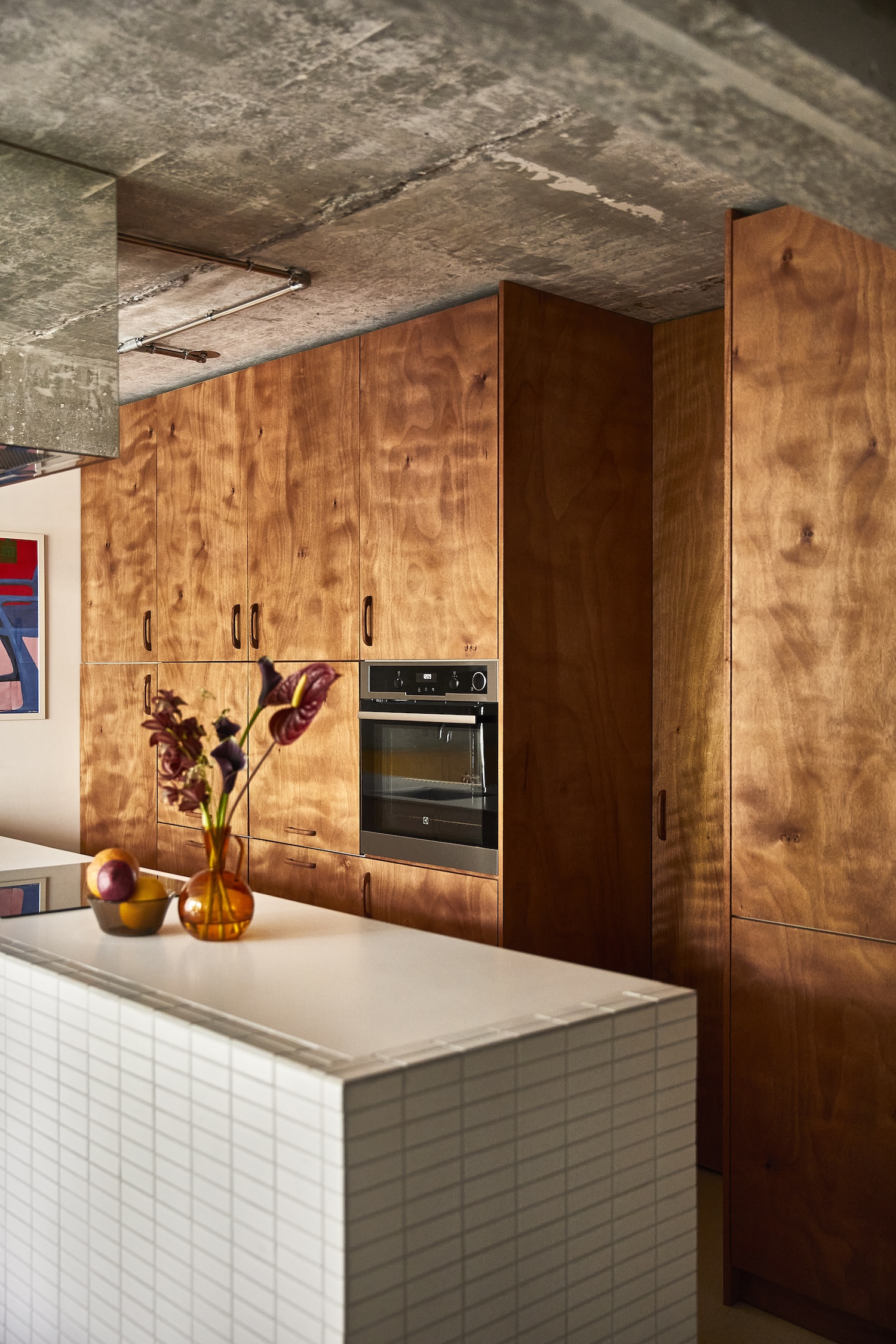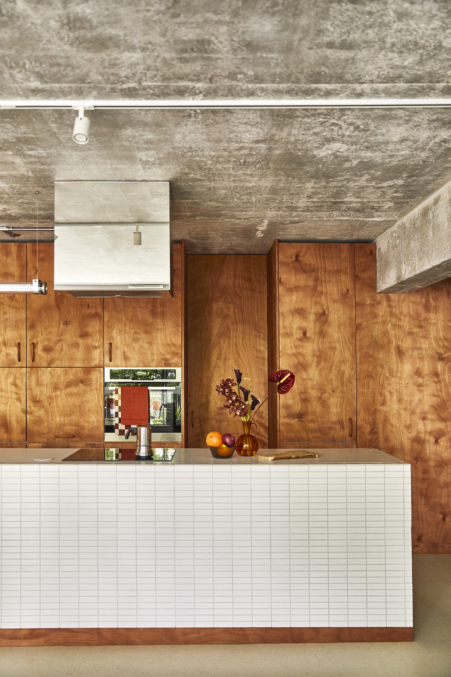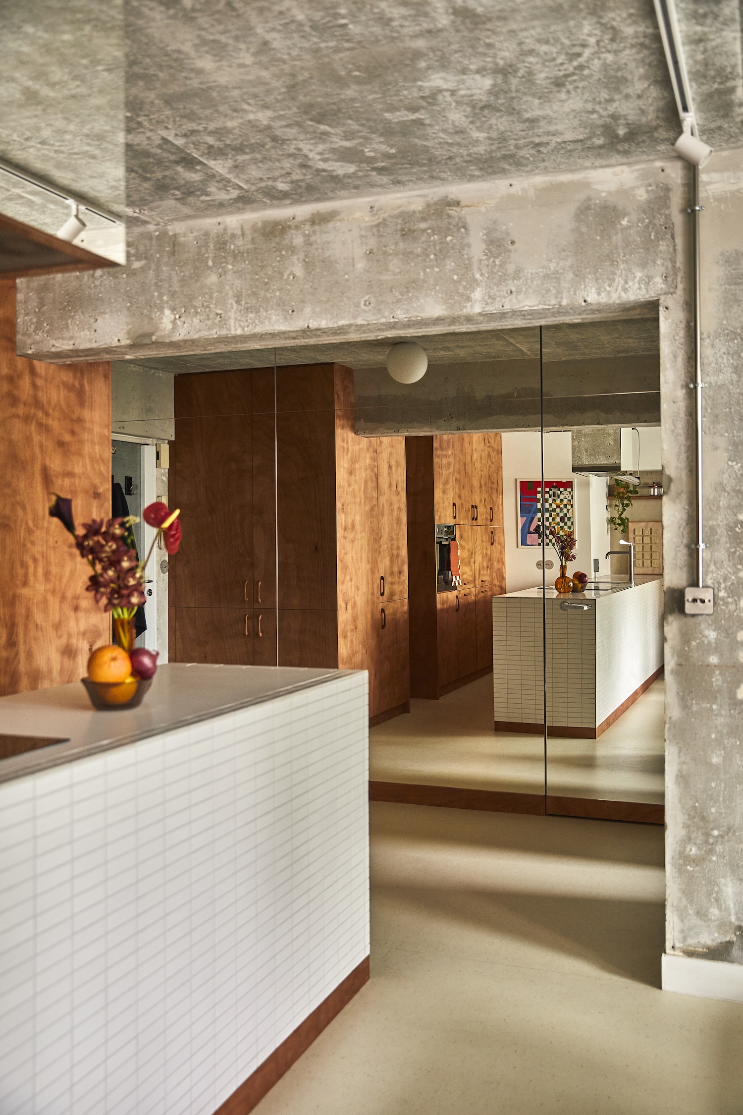 이 아파트의 내부는 주로 목재와 타일로 마감되었습니다. 이 두 재료의 조합은 따뜻하고 자연스러운 분위기를 조성합니다. 카운터와 바닥에 사용된 타일은 매끄러운 질감을 가지고 있어 청소와 유지 관리가 용이합니다. 반면, 목재는 자연스러운 무늬와 따뜻한 색감으로 공간에 아늑함을 더합니다. 천장은 노출 콘크리트(polished concrete)로 마감되었으며, 이는 산업적인 느낌을 주면서도 전체적인 미니멀리즘 디자인과 조화를 이룹니다. 이 아파트는 작은 공간에서 기술적 혁신을 통해 기능성을 극대화하는 데 성공했습니다.