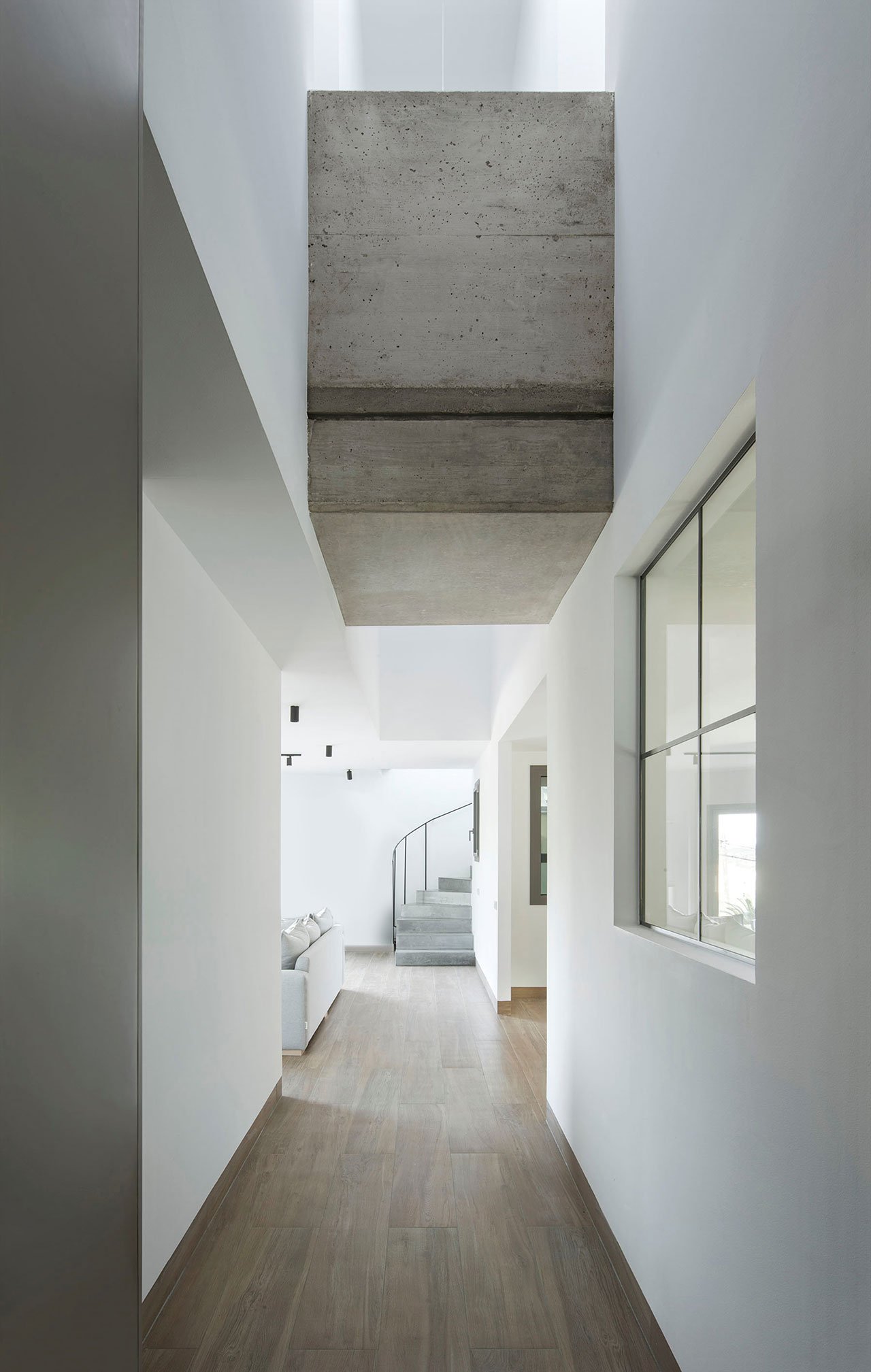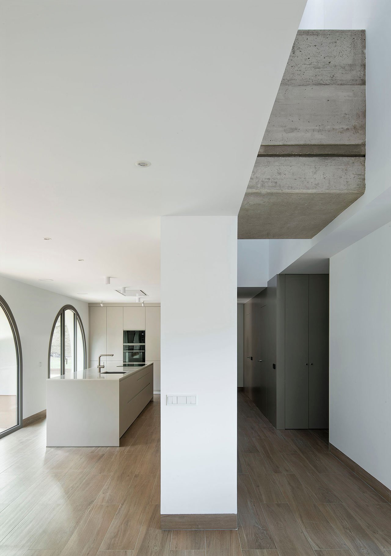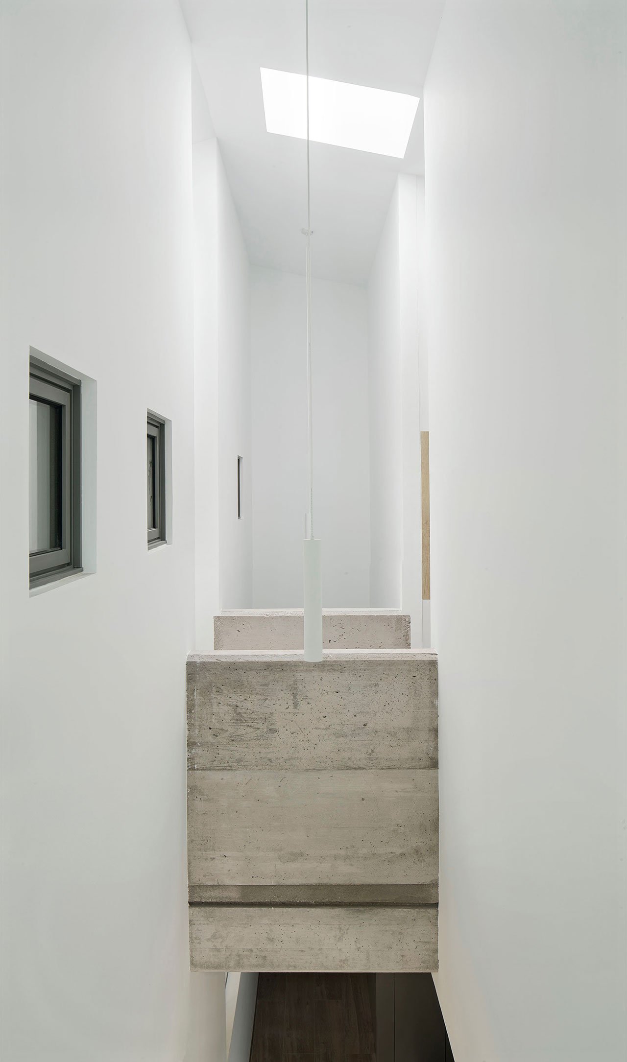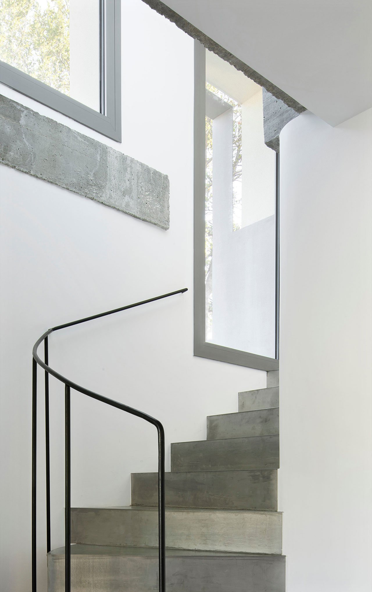 The architecture’s sculptural sensibility is matched by the soulful minimalism of interior design which is underpinned by a muted colour palette and plain materials. White surfaces dominate, imbuing the spaces with a soothing ambience, with hardwood floors adding warmth and raw concrete accents providing playful glimpses of the building’s underlying structure. The interior’s ascetic sensibility makes for a contemplative living environment. As the architect explains, “to fully appreciate this project, it is desirable to move through it, to invest a little time”. It seems that this home is not just a place to live, but a space to truly experience and savour.