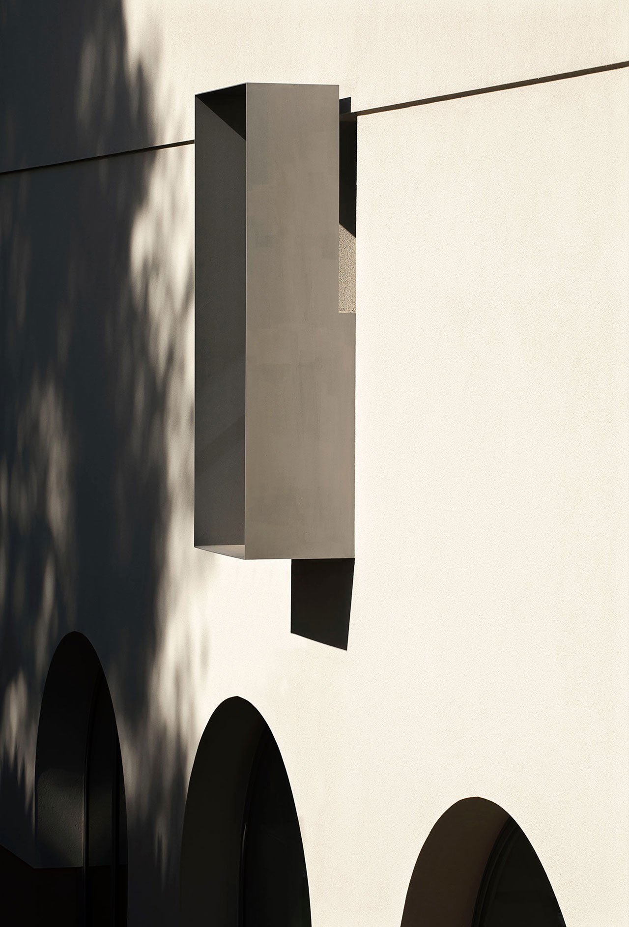 디자인 특징: 폴리곤 형태의 화이트 워시 볼륨과 직사각형 및 아치형 창문을 활용한 디자인이 특징이다.