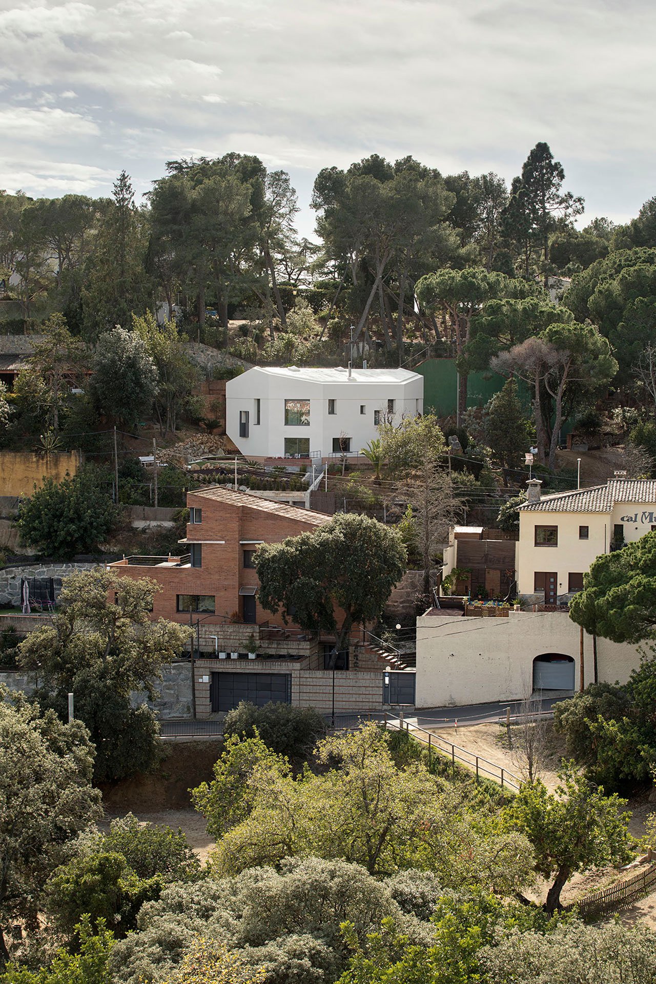 Located in Premià de Dalt, Spain, a hillside town a half-an-hour’s drive from Barcelona, this family residence by Madrid-based architect Pablo Corroto Pradillo caught our eye thanks to its sculptural rigour and understated refinement. Nestled against a backdrop of tall pines, the house’s whitewashed polygonal volume makes for a bold architectural statement amid its suburban surroundings. A series of smaller and larger rectangular and arched openings punctuating its monolithic mass further enhance its playful geometry.