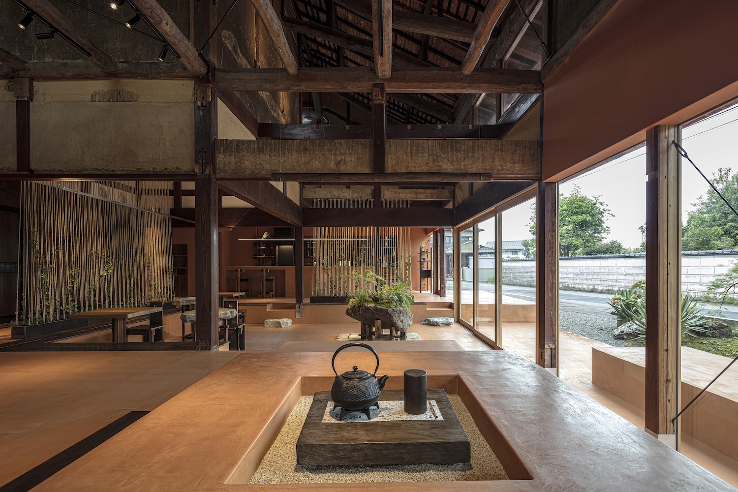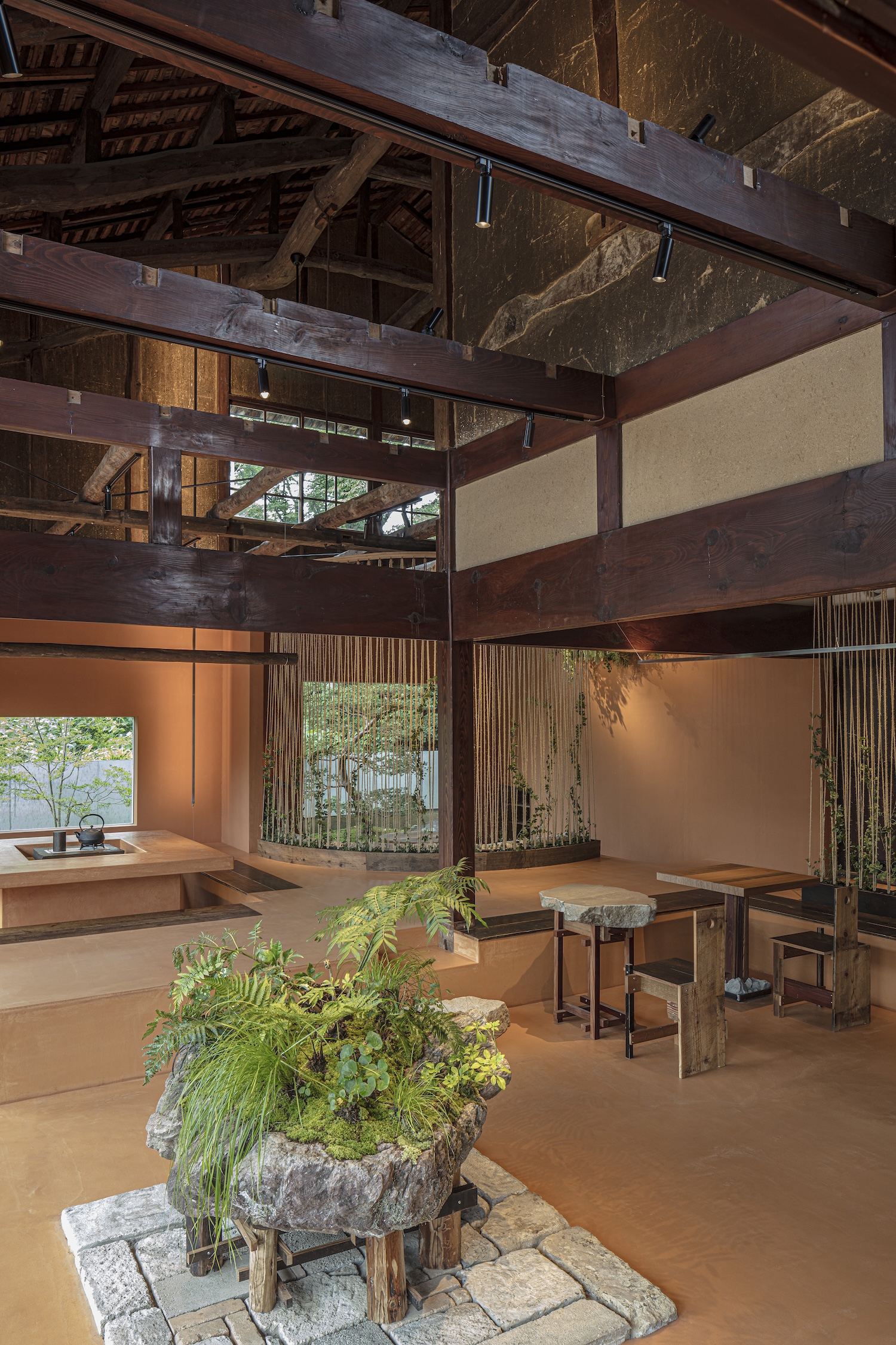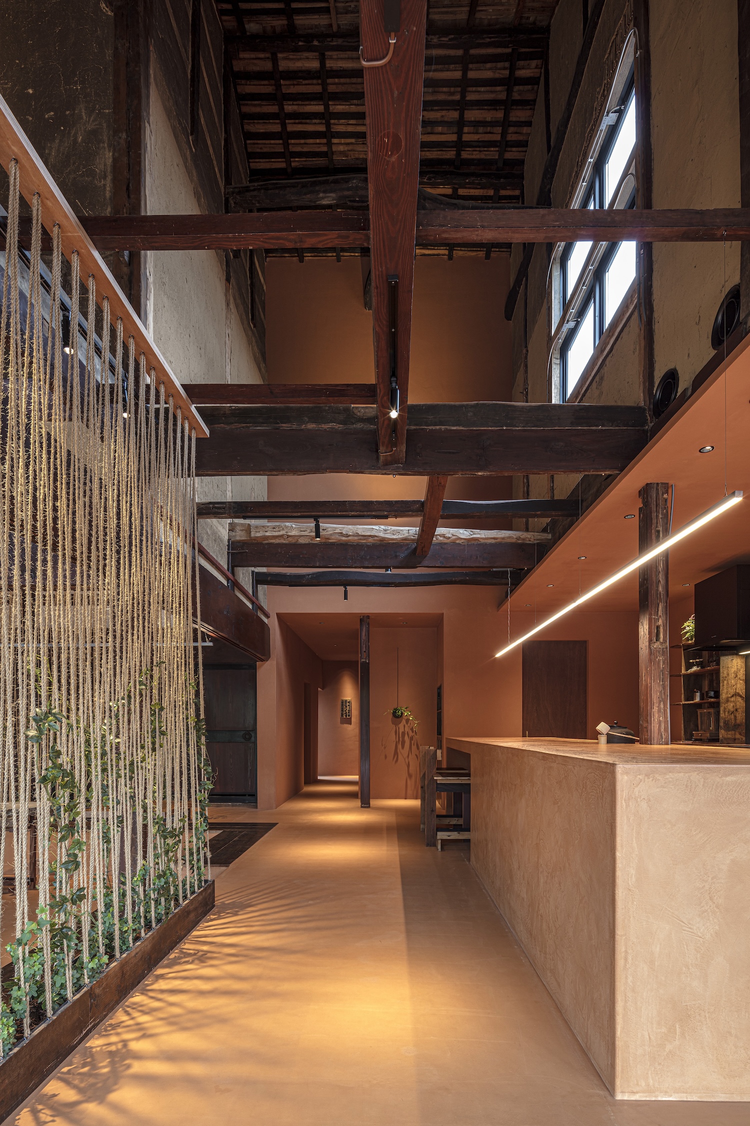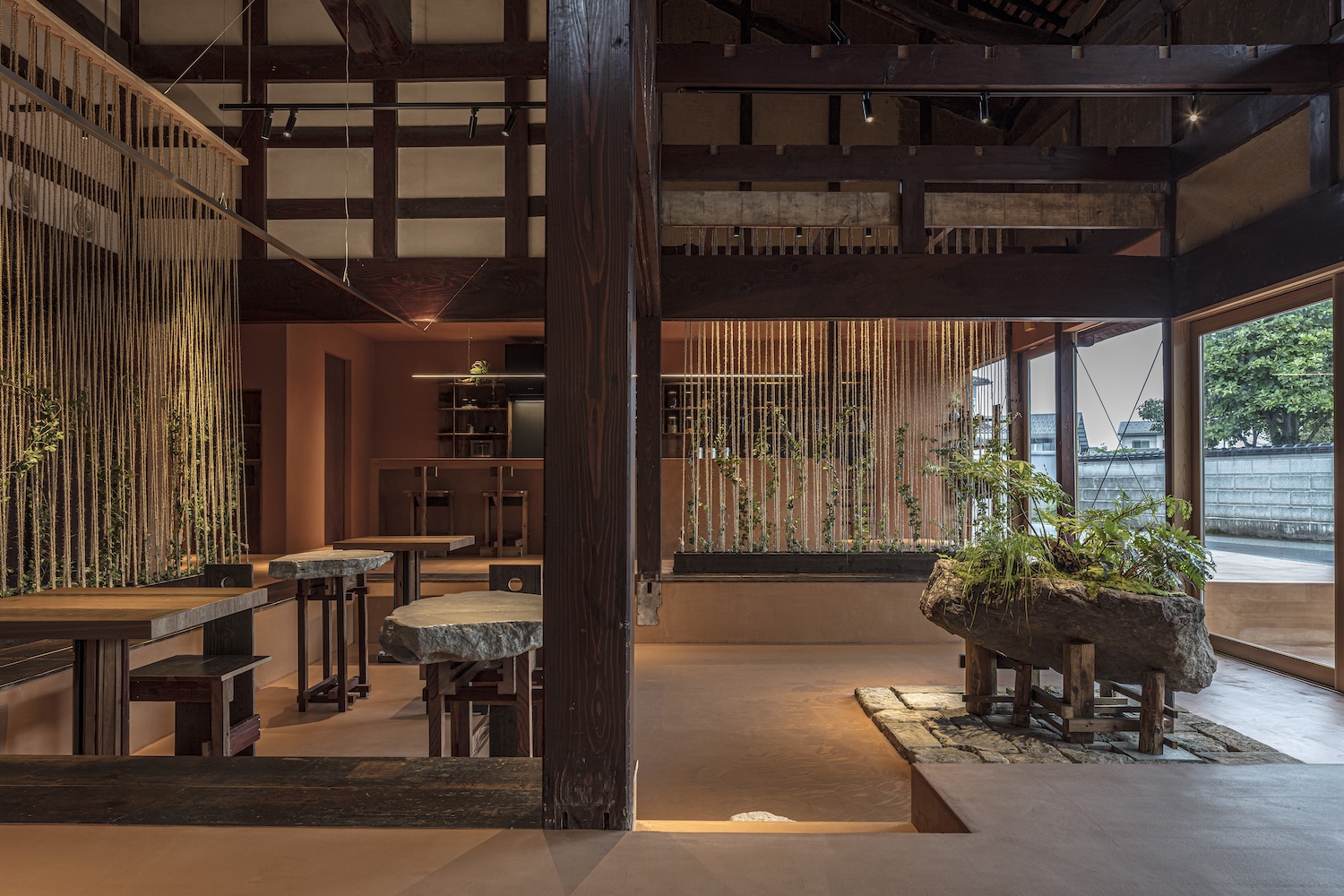 The goal was to maintain the historical essence of the building while adapting it for contemporary use. At the heart of the café is a doma, a traditional Japanese space where visitors can walk with shoes on, typically featuring an earthen floor. The doma is framed by steps and benches, creating natural zones for relaxation and interaction, while also blurring the boundary between indoor and outdoor spaces. A central art installation, composed of stones and timber unearthed during the renovation, serves as a focal point, connecting the café’s modern design with its past. Medicinal herbs planted within the artwork further tie the café to its roots in Chinese herbalism. Additionally, an ivy covered rope partition around the doma offers a visual element that evolves over time, enhancing the café’s atmosphere.