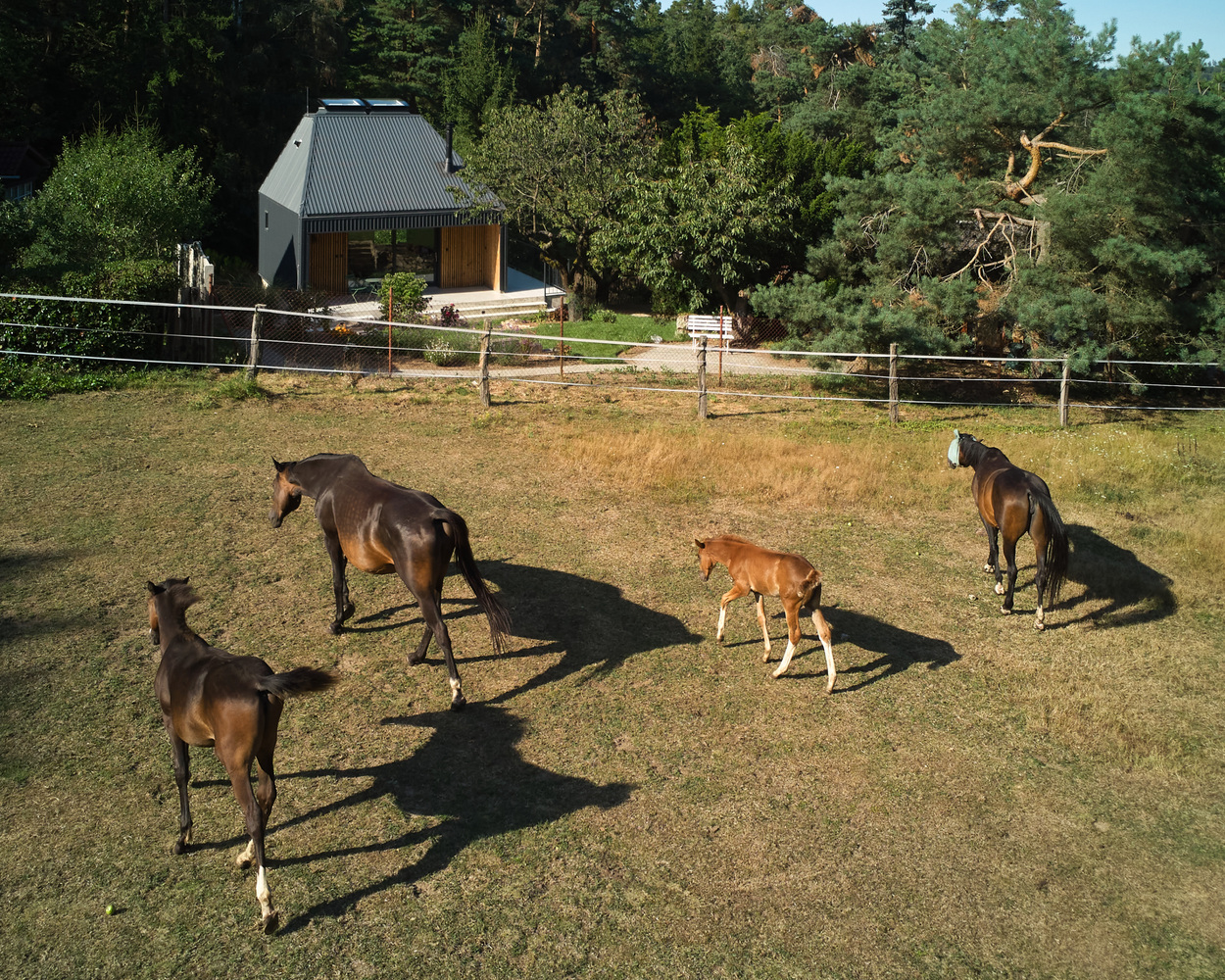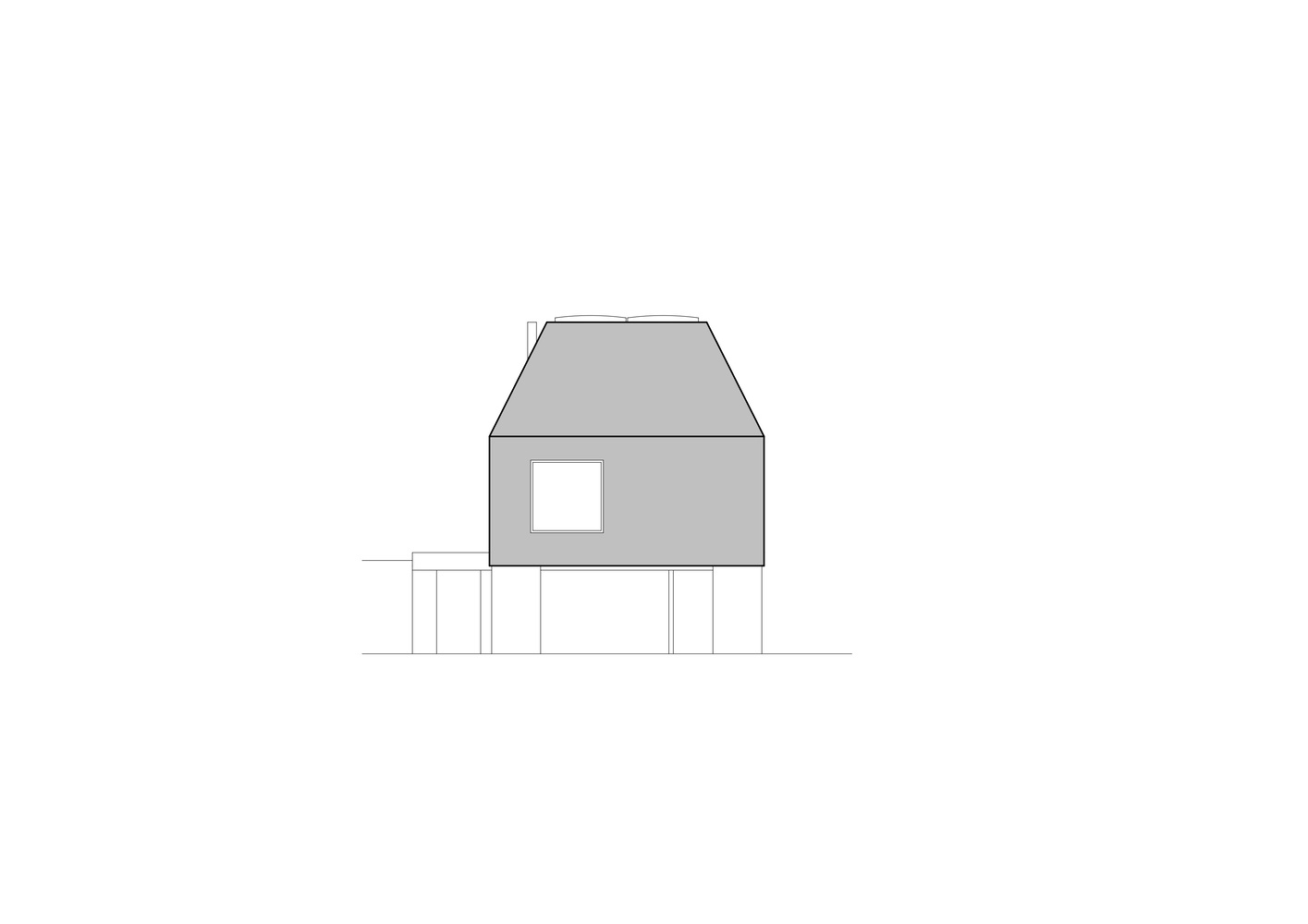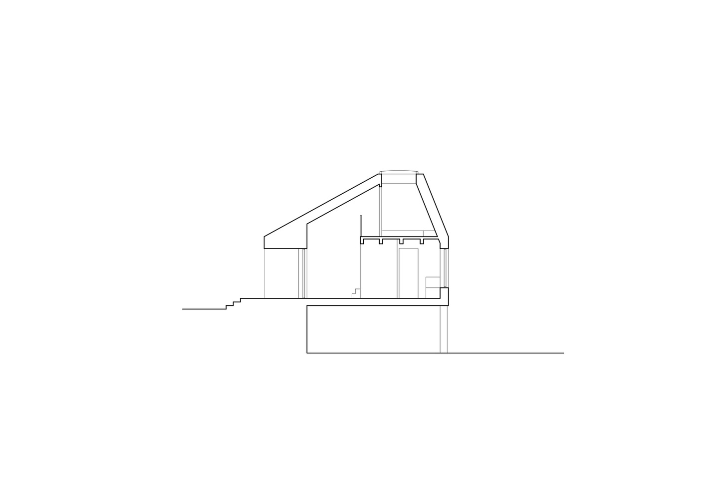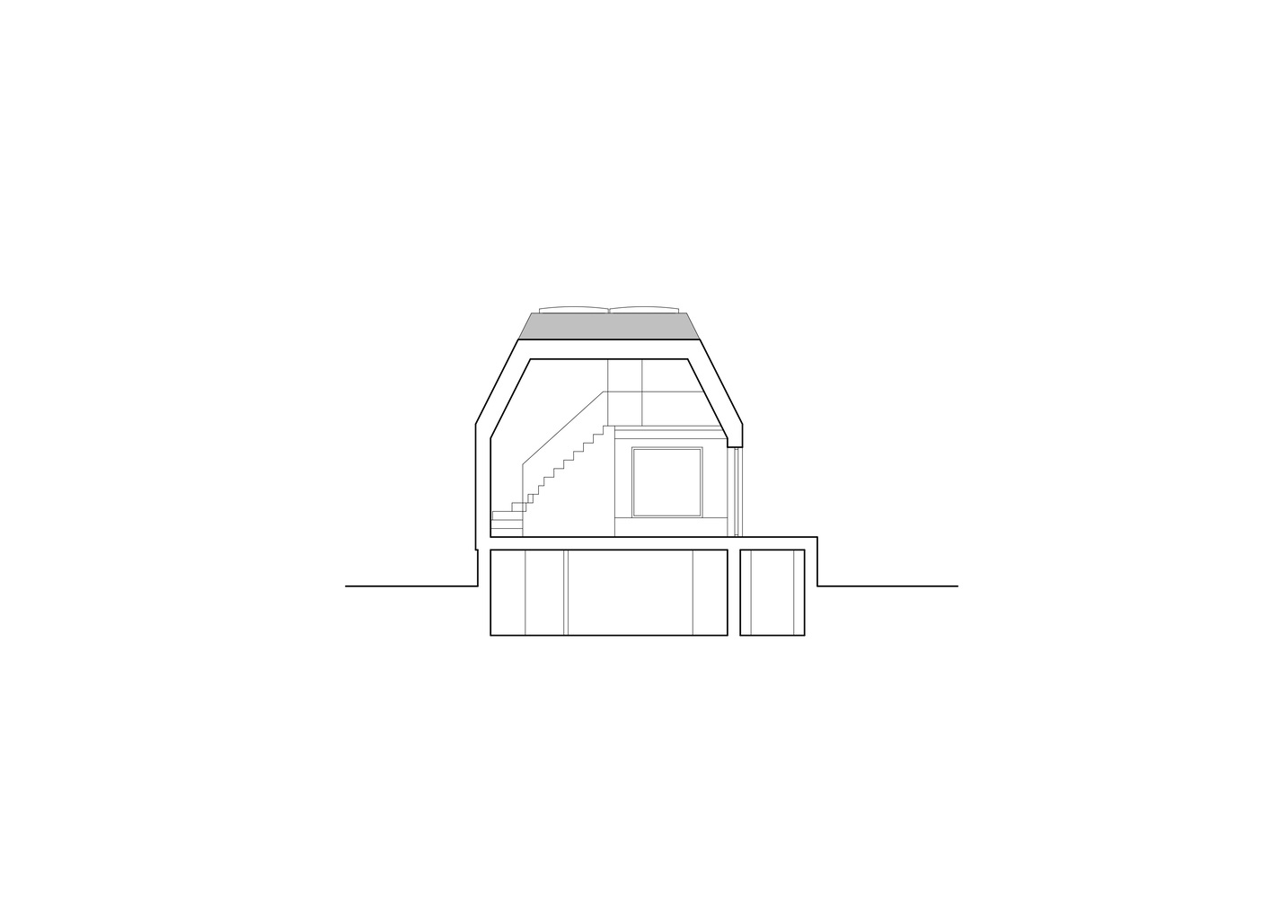 From the ground floor, there are views of the surroundings through large glazed areas oriented to the south and east. The simple layout allowed the use of facade windows on all sides. The truncated hip roof, on the other hand, remained uniform from the outside; any insertion of a window would have disturbed the simplicity of the house as seen from the outside. The bedroom is therefore illuminated by a pair of opening skylights from above. The skylights create an interesting meditative space and allow rapid chimney ventilation of the whole building. Combined with the significant roof overhang over the southern part, this ensures a pleasant indoor climate all year round.