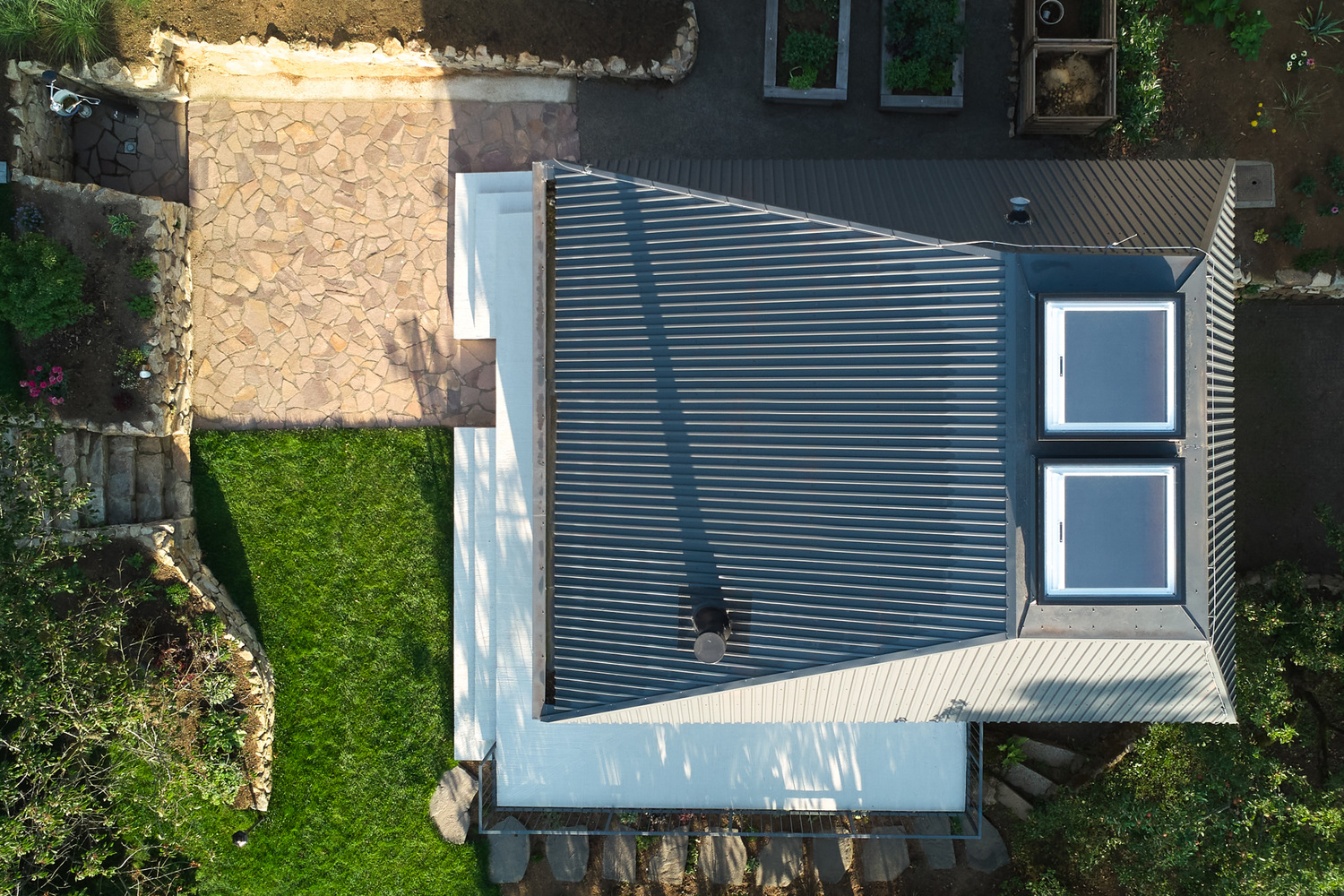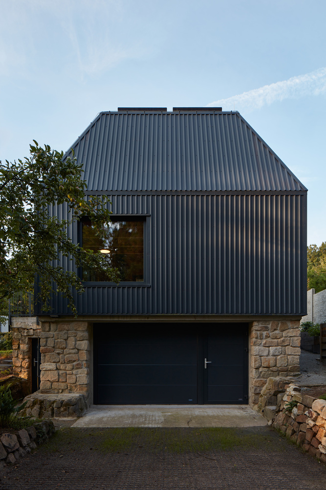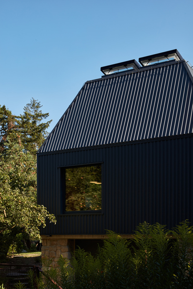 Architect Martin Hajný took on the challenge and designed an unusual building with a truncated hip roof. The reason was to minimize height and be considerate of the neighbors, ensuring the roof shape did not disrupt their view of the landscape. The original hut was reduced to its stone base, upon which the new metal structure stands. The main construction is a two-by four system, diffusely open structure on a reinforced concrete slab, which is set on reinforced concrete pillars hidden behind stone walls. The roof and facade are clad in trapezoidal metal sheeting, a low maintenance material with a long lifespan that resembles wooden battens.