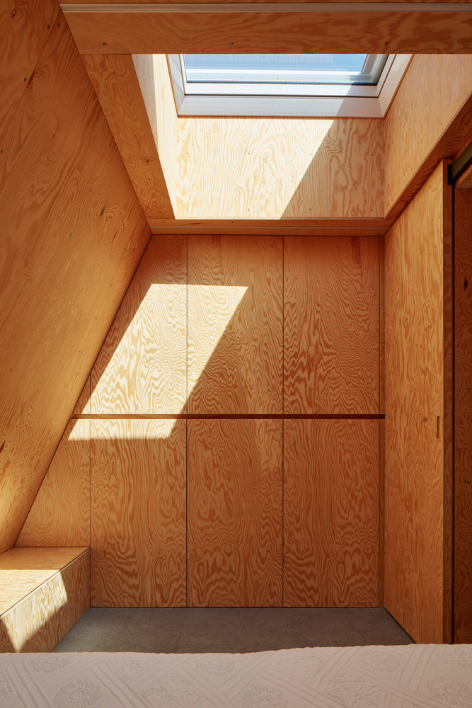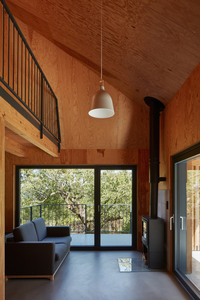 While the dark exterior helps the building blend into its surroundings, the interior is bright and evokes a classic hut with its predominance of wood. The pine plywood used, with its pronounced grain, extends from the ceiling panels to the walls and all furniture. It contrasts with the facade and is practical as it allows more light into the interior. The bathroom features a subtle grey plaster on the floor and walls.