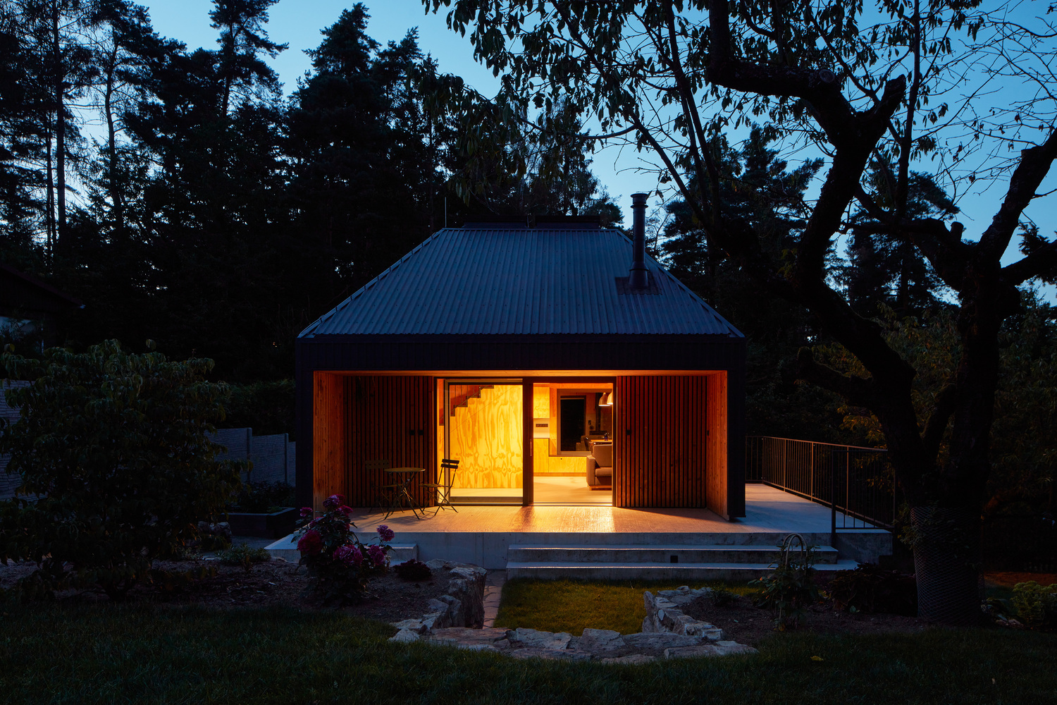 The hut in a recreational area near Prague has an unusual shape and appearance. The asymmetrical tent-like roof is truncated and finished with a pair of skylights. Originally, there was a simple one story hut with a basement and a low-pitched roof built in the 1970s. A married couple from Prague bought the land for a "city escape," not just for weekends but also for working from home. They were enchanted by the peaceful location amidst nature, surrounded by a garden and mature trees. They eagerly anticipated their retreat from city noise and even took a gardening course, but the building was in very poor technical condition. Additionally, it did not meet their spatial needs as they wanted to expand the ground-floor room with an attic bedroom. However, the zoning plan did not allow new construction, and the height was limited to a maximum of 7.7 meters from the surrounding terrain. The only solution was a complete renovation that would enlarge the house and comply with the requirements of authorities and neighbors.