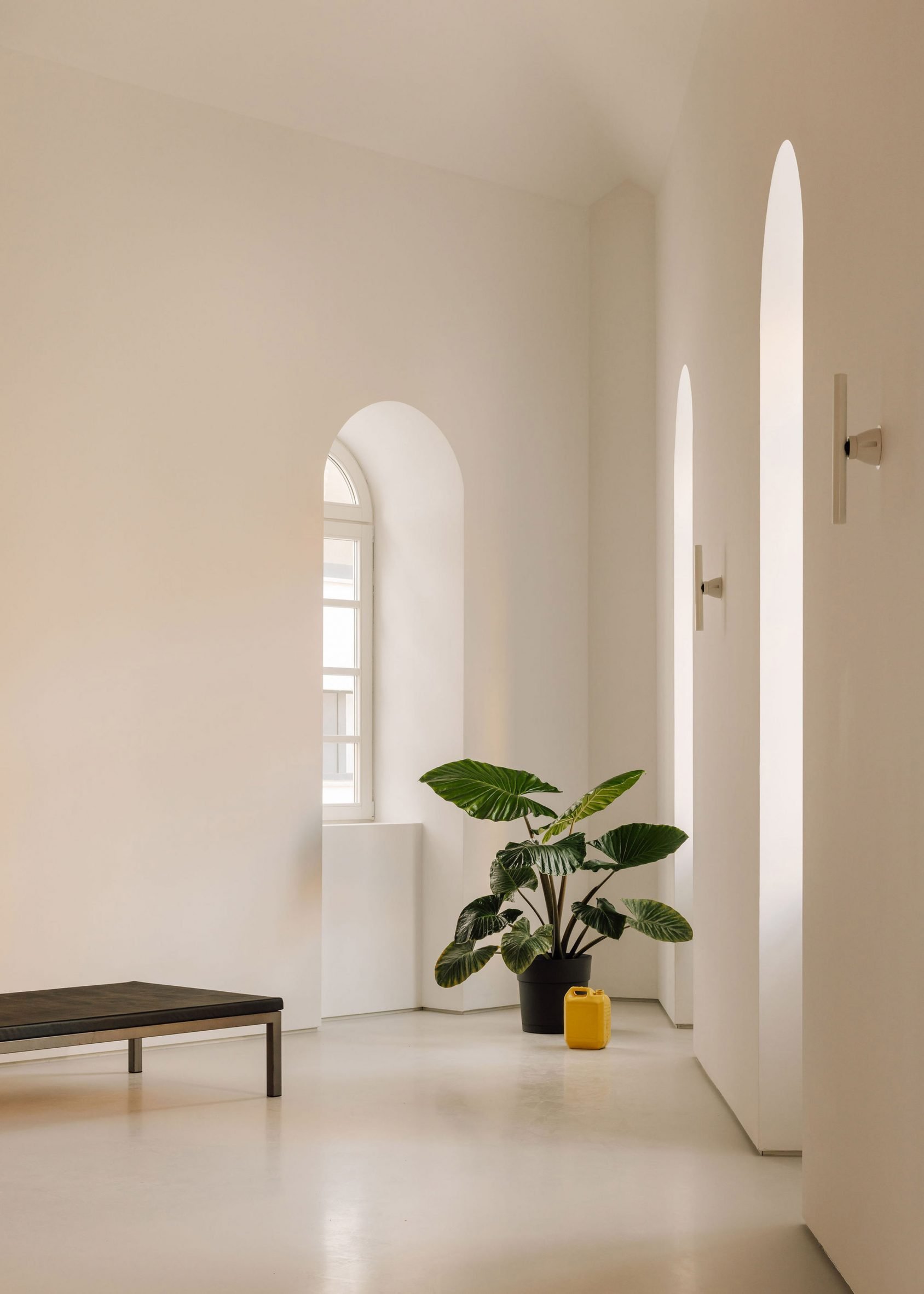 Lisbon and Paris based Bureau des Mésarchitecture looked to balance these two distinct conditions, drawing on the yellow-painted exterior of the existing building to inform a curved facade of pale concrete with golden aluminium.