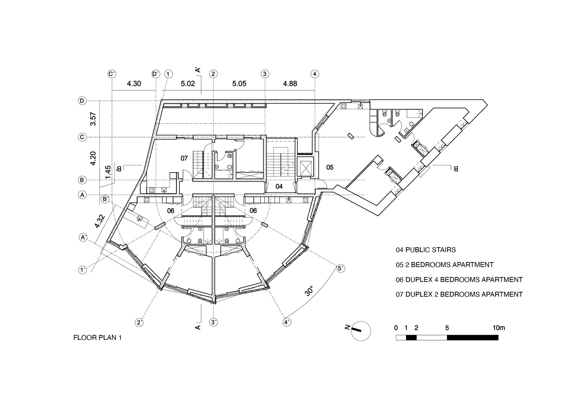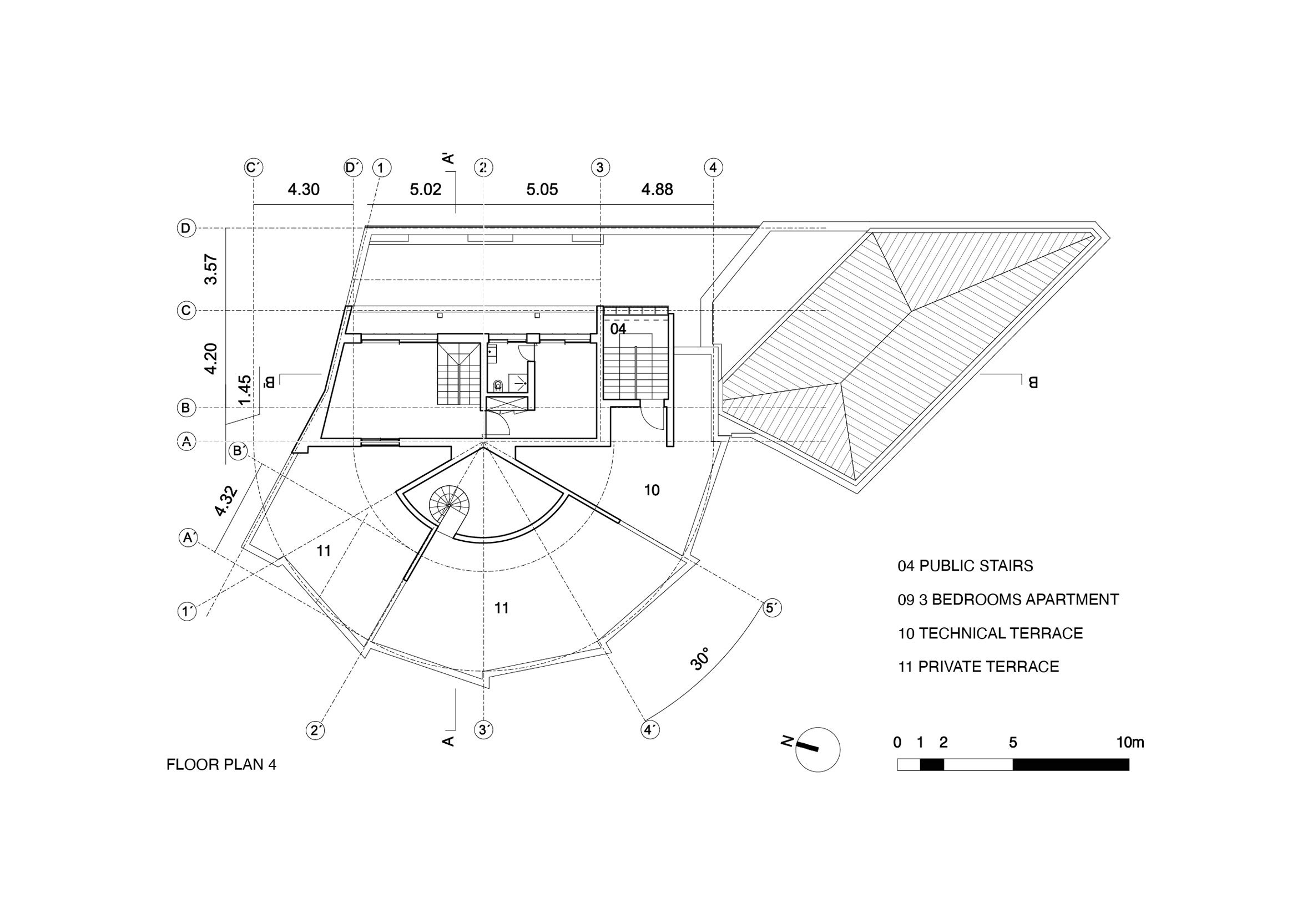 건물 내부는 5개 층으로 구성되어 있으며, 각 층은 계단을 중심으로 효율적으로 배열되어 있습니다. 내부 공간은 넓고 개방적으로 설계되었으며, 최대한 자연광을 활용하여 밝고 환한 분위기를 조성합니다. 지상층에는 주차 공간과 공유 공간이 있으며, 상부 층으로 올라가면서 다양한 침실 아파트가 배치되어 있습니다. 내부의 곡선형 계단은 공간의 중심에서 주요 이동 통로로서 작용하며, 층간 이동을 자연스럽게 연결합니다.
