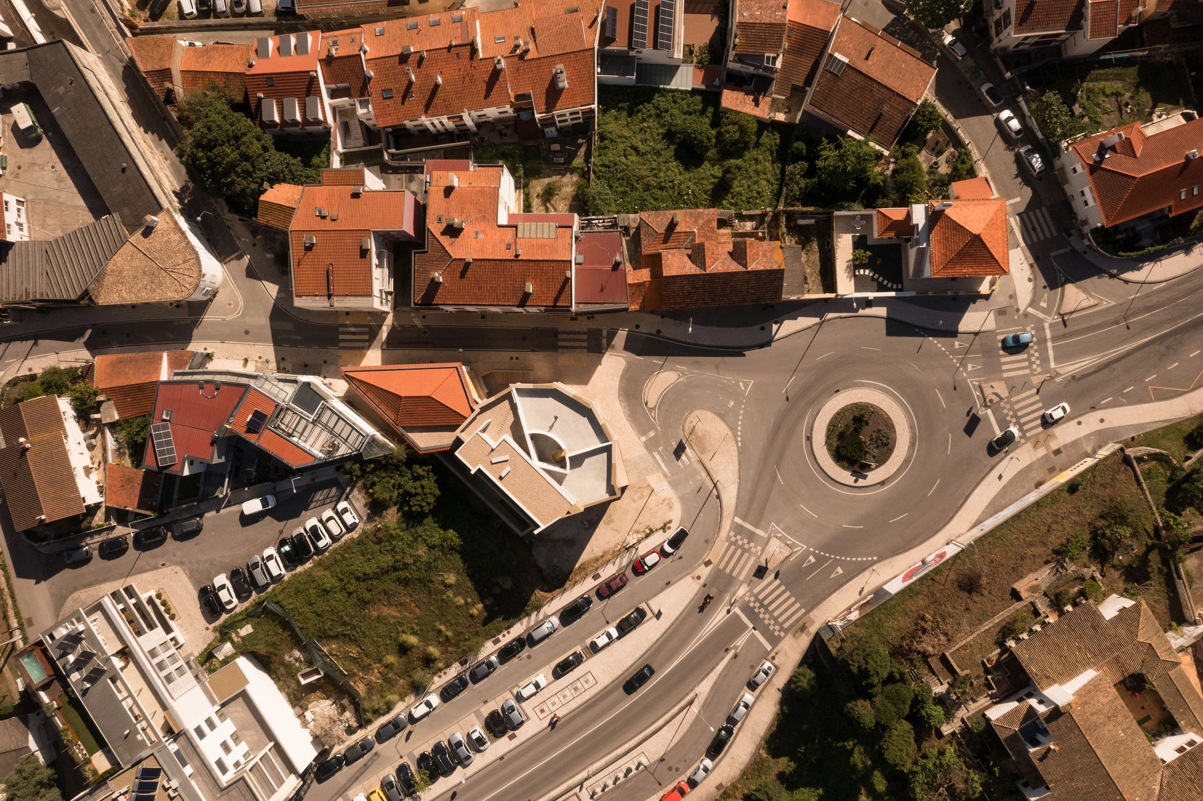 Situated on a corner site where the old and new neighbourhoods of Leiria meet, the block of five apartments is connected to an existing, yellow painted 20th century house, which was renovated and converted into two additional apartments as part of the project.
