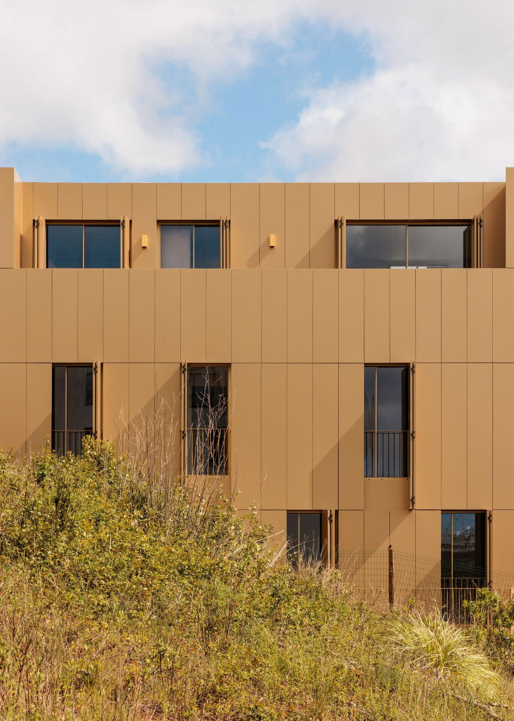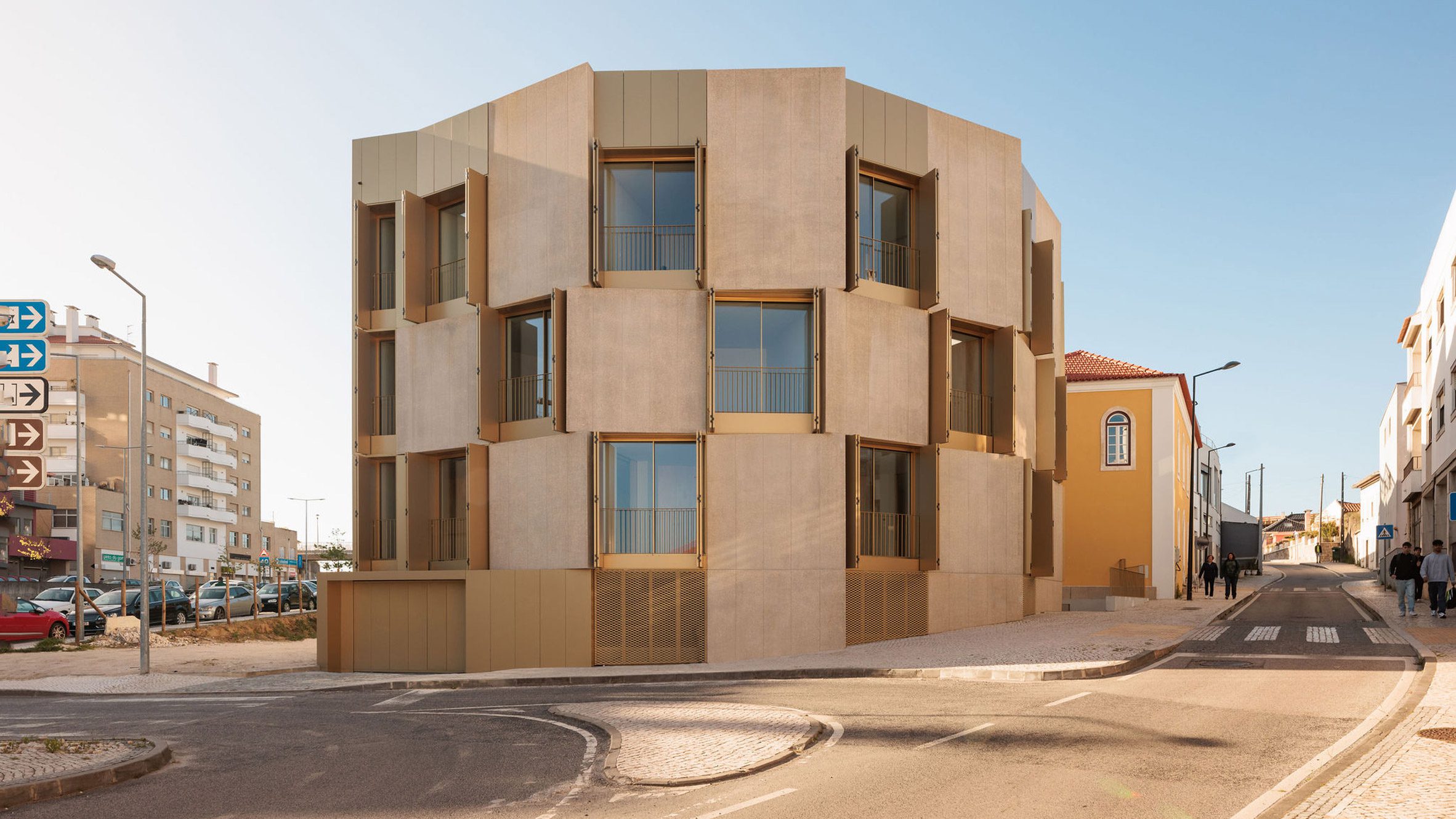 Architecture studio Bureau des Mésarchitecture has completed an apartment block in Leiria, Portugal, wrapped in concrete and gold aluminium shutters.