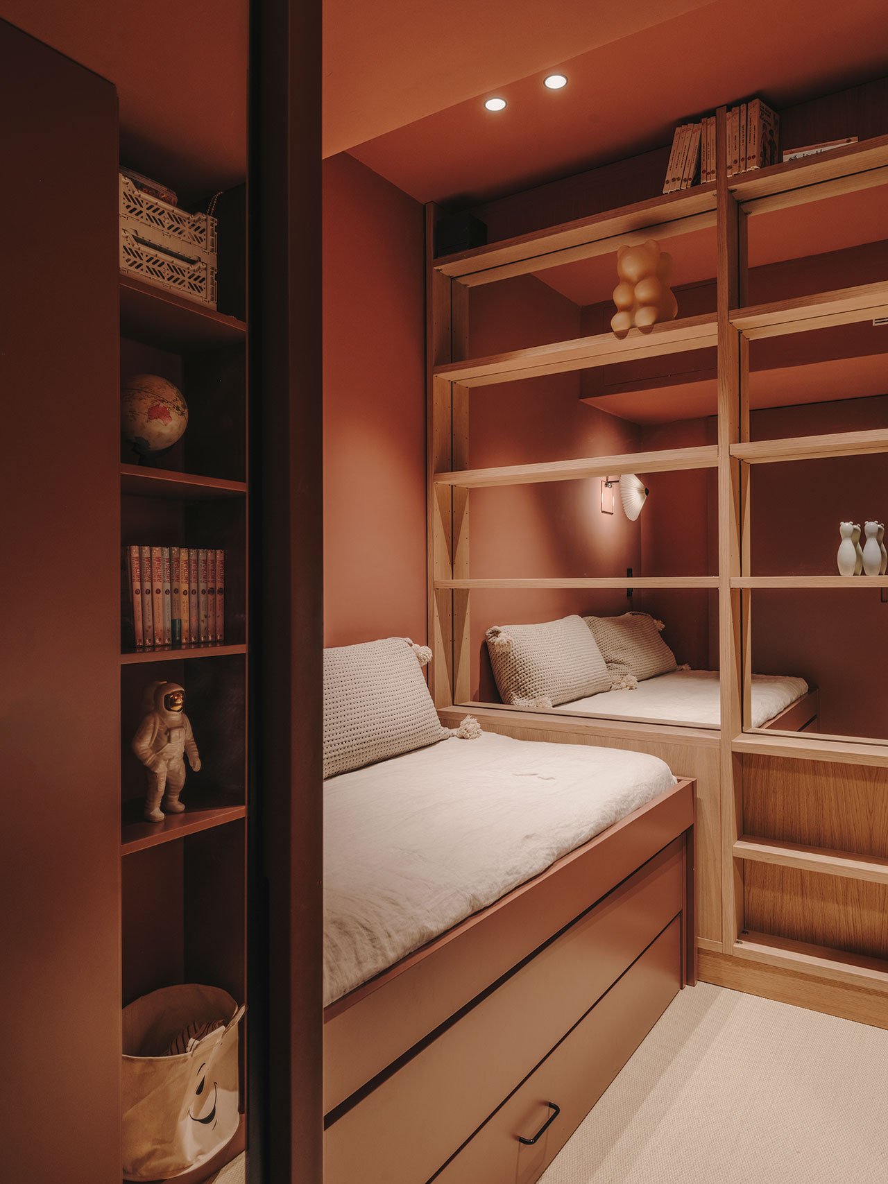 Natural materials such as raffia panels and oak wood can be found throughout the apartment. Linked to Mediterranean aesthetics, this palette adds warmth and beauty while preserving the apartment’s simplicity, also reinforcing the kanso philosophy by highlighting the inherent beauty of the materials themselves without overcomplicating the space. Lighting also plays an integral role, with natural light maximized during the day and soft, warm artificial lighting creating a soothing ambiance at night.