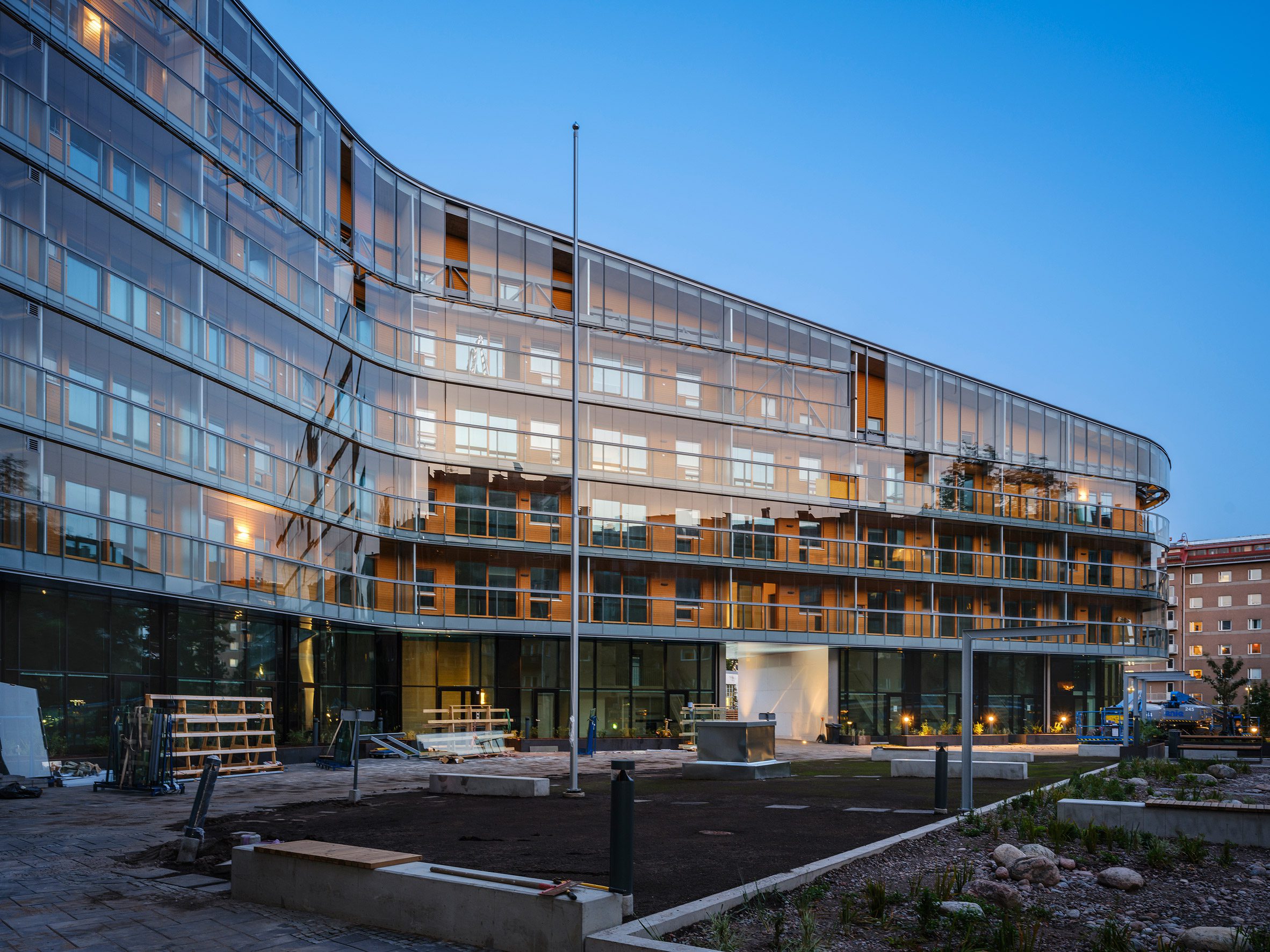 Completed with local studio ARK-house Arkkitehdit and property developer Newil&Bau, the 7,500-square metre project comprises 115 unique apartments with a concrete structure and lined with wood and glazing.