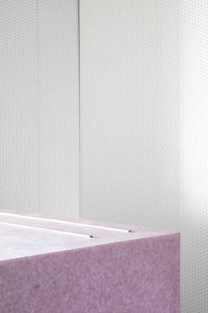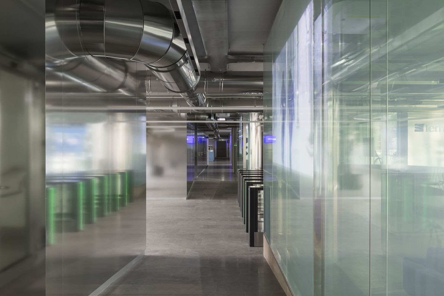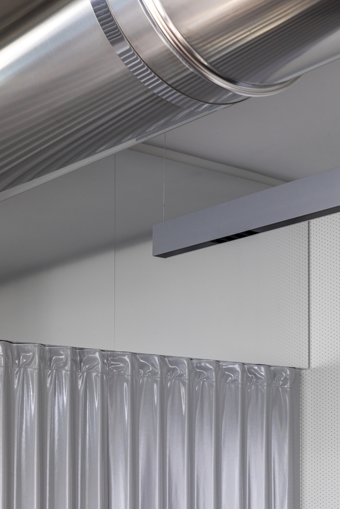 반사 알루미늄 벽면은 공간에 깊이감과 변화를 더해줍니다. 벽면이 주는 시각적 효과는 노출된 인프라와 조화를 이루며, 기술적 혁신과 디자인 요소가 결합된 특징을 잘 드러냅니다.