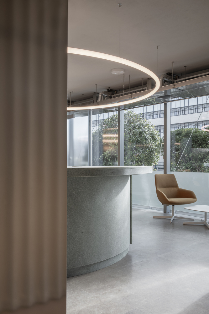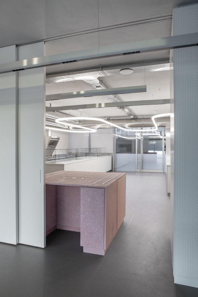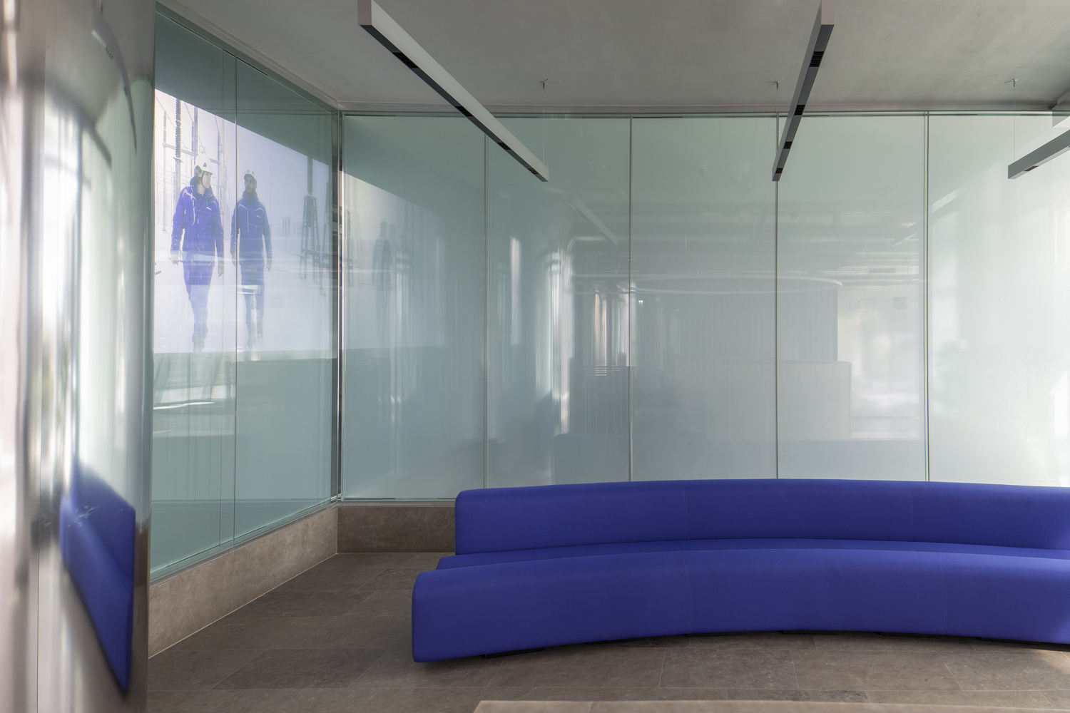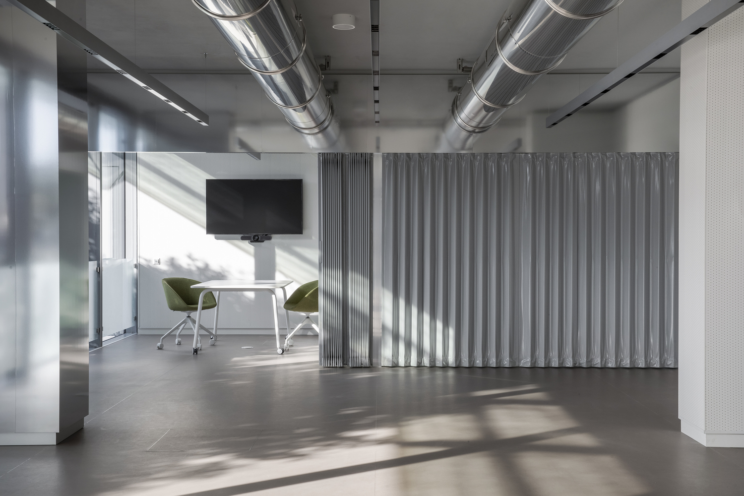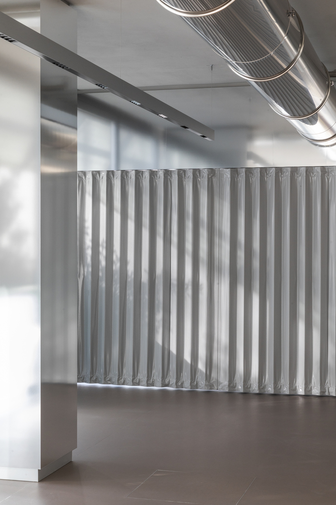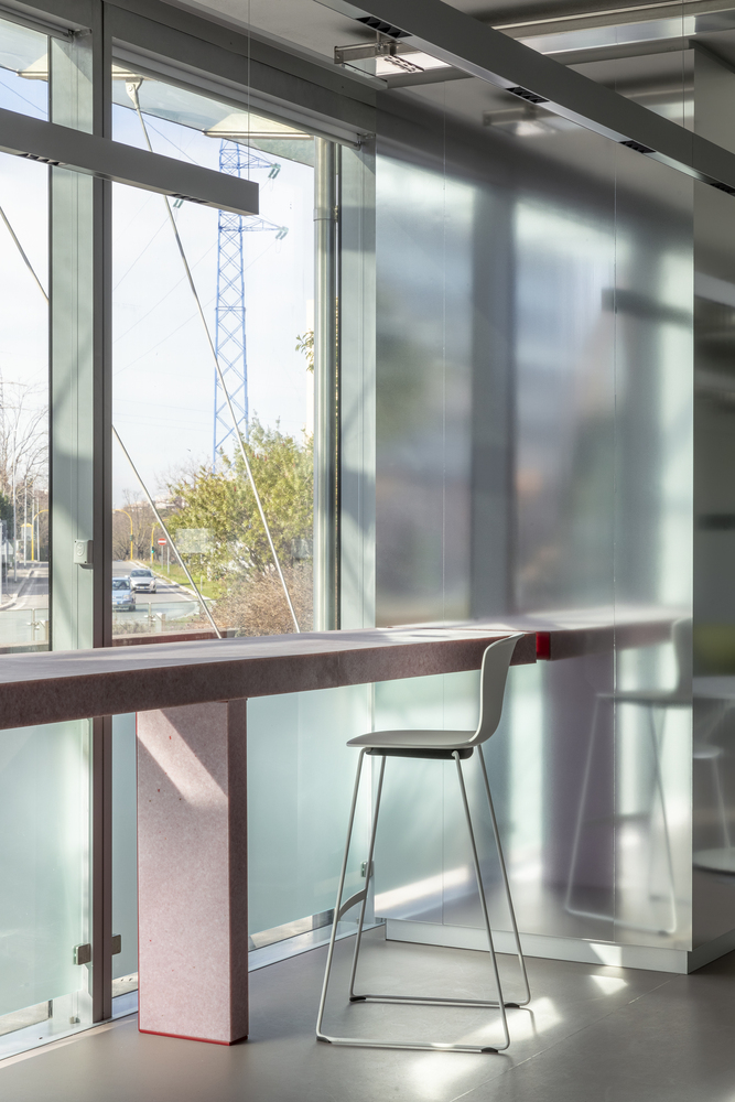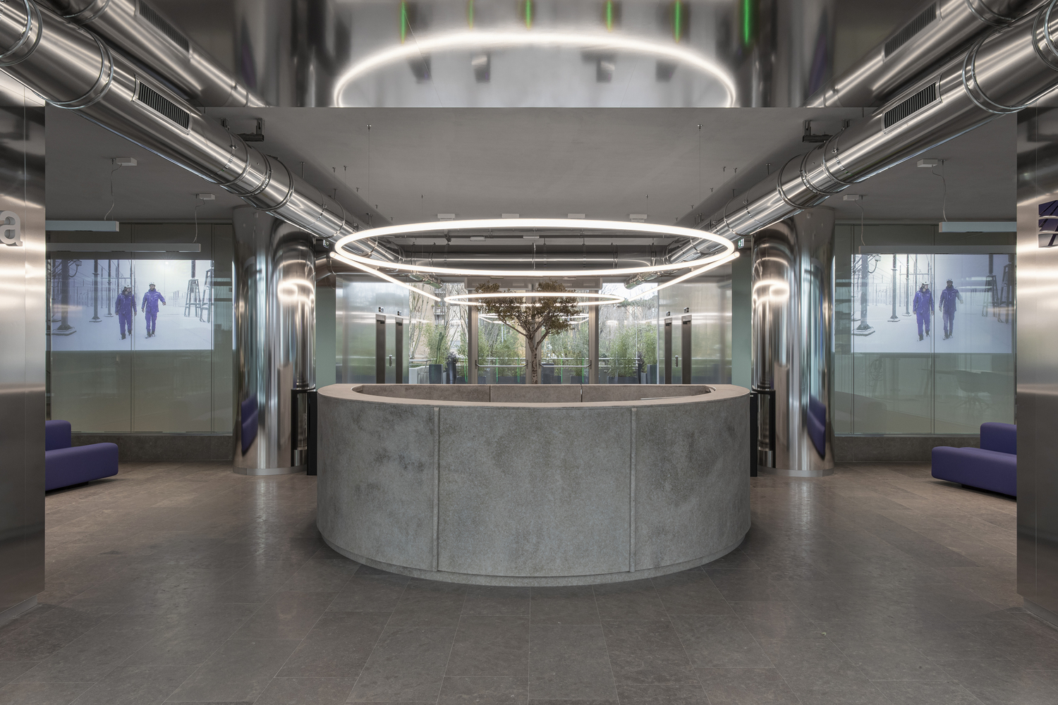 The project also incorporated additional sustainable materials, such as linoleum, a compound derived from natural materials (flaxseed oil, wood flour, limestone, resin, and jute, as well as cocoa waste), chosen for the flooring in the new dining area, and natural Santa Fiora stone, typical of central Italy, for the reception and common area flooring. Wall coverings in reflective aluminum create ever changing reflections and depth in the spaces. To highlight the building's infrastructure serving the new environments, the installations were left exposed, contrasting with the continuity of the material surface and the uniformity of the new sound-absorbing ceilings. Flexibility is reflected in transparent walls or "curtain" sound-absorbing panels and large sliding openings that ensure visual and functional continuity. The furniture and technological solutions feature a simple design with a variety of adaptable options and scenarios to meet different company needs.