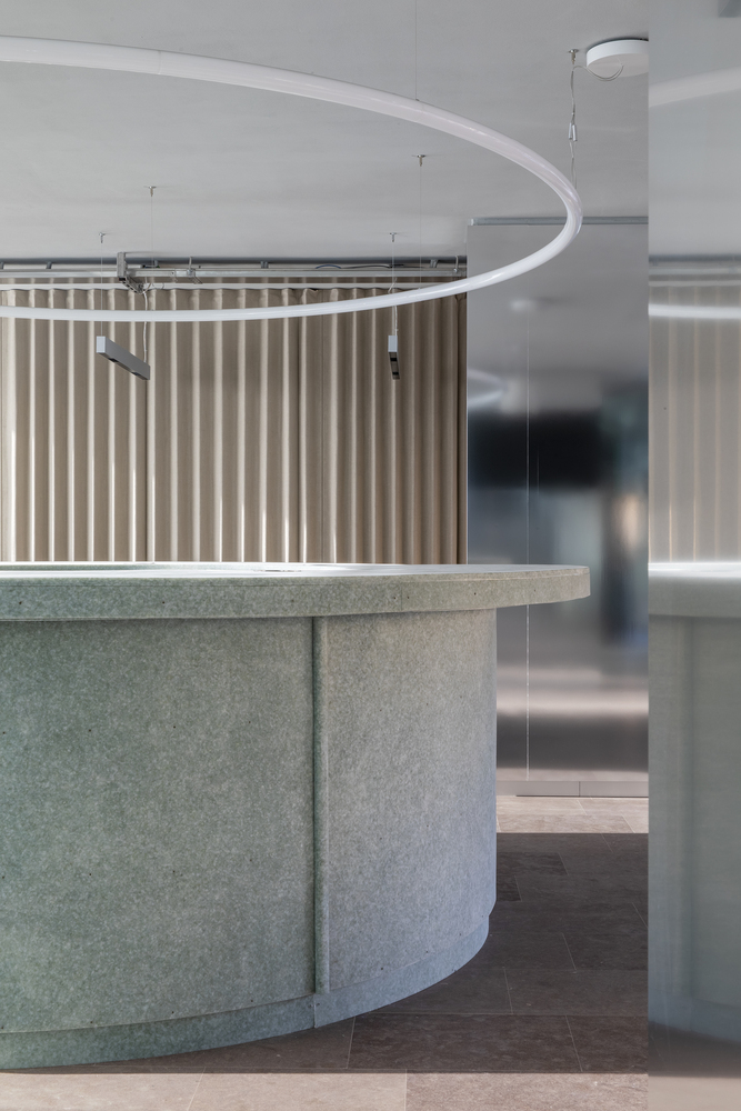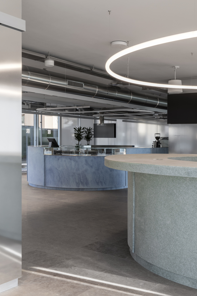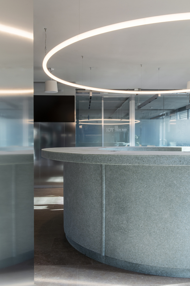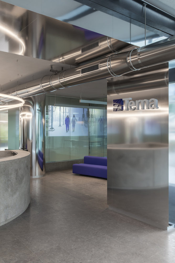 리듬 조절: 데스크의 부드러운 곡선은 기술적 설비와 조명과 조화를 이루어, Terna의 기술적 정체성을 시각적으로 강조합니다.