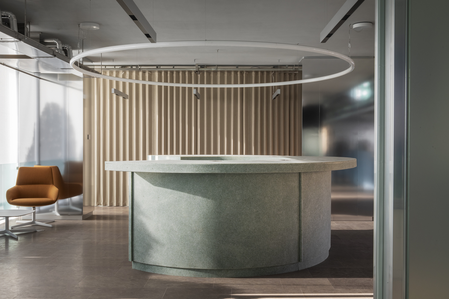 리셉션 공간은 프로젝트의 시각적 중심지로, 재활용 플라스틱 패널로 제작된 맞춤형 데스크가 배치되어 있습니다. 이 데스크는 부드러운 곡선 형태로 디자인되었으며, 이는 방문객에게 친근한 느낌을 제공함과 동시에 Terna의 지속 가능성을 상징합니다.