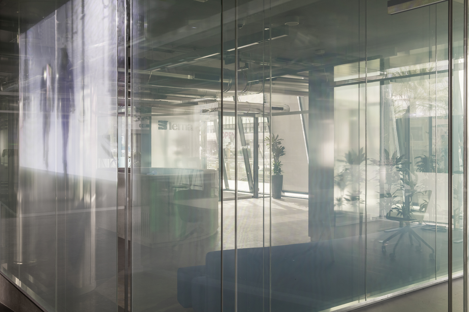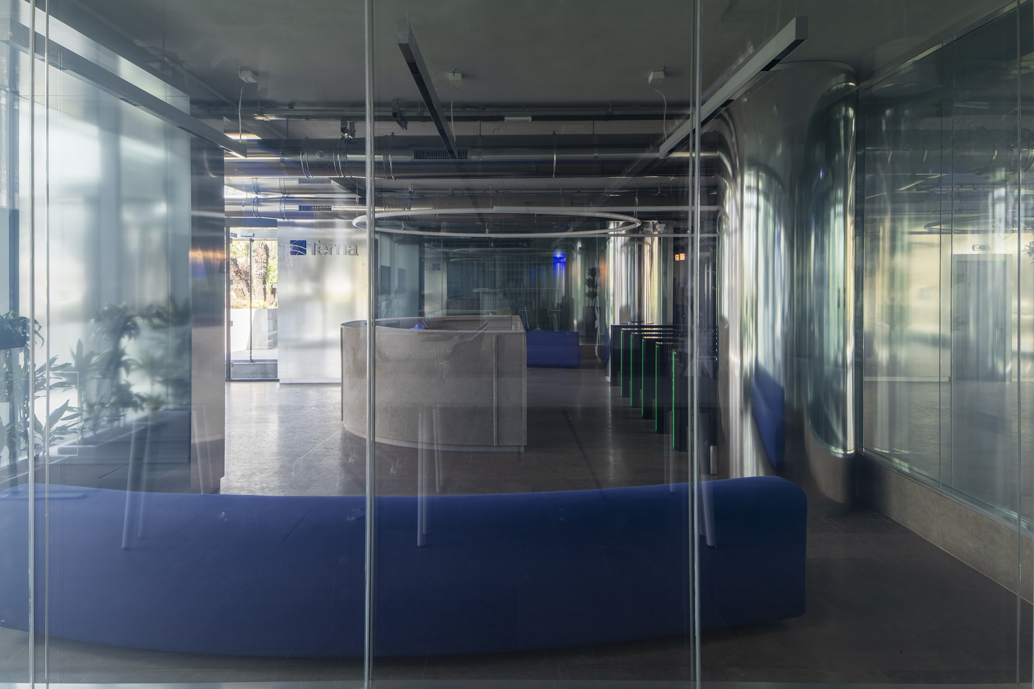 공간의 유연성은 투명한 유리 벽, 흡음 커튼 패널, 대형 슬라이딩 도어를 통해 구현되었습니다. 이를 통해 시각적 연속성을 유지하면서도, 필요에 따라 공간을 변화시킬 수 있는 유연한 환경이 조성됩니다. 또한, 플라스틱 폐기물을 활용한 맞춤형 가구는 Terna의 지속 가능한 디자인을 대표하는 요소로 자리 잡았습니다.