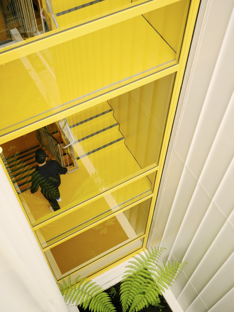 건물의 노란색 발코니는 시각적으로 생동감을 주는 동시에, 내부에 많은 자연광을 들일 수 있도록 설계되었습니다. 특히 발코니와 외부 구조물은 건물의 심미적 가치뿐 아니라 자연 채광을 극대화하는 기능적 요소로서 중요한 역할을 합니다.
