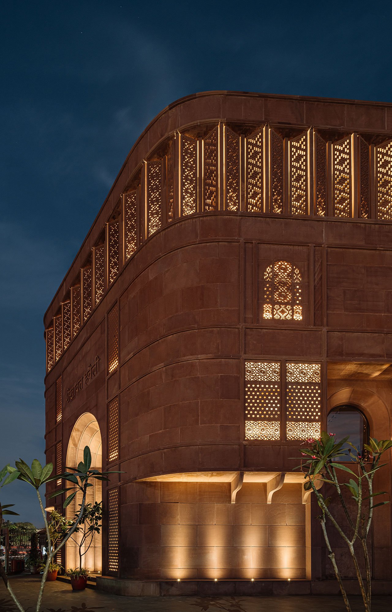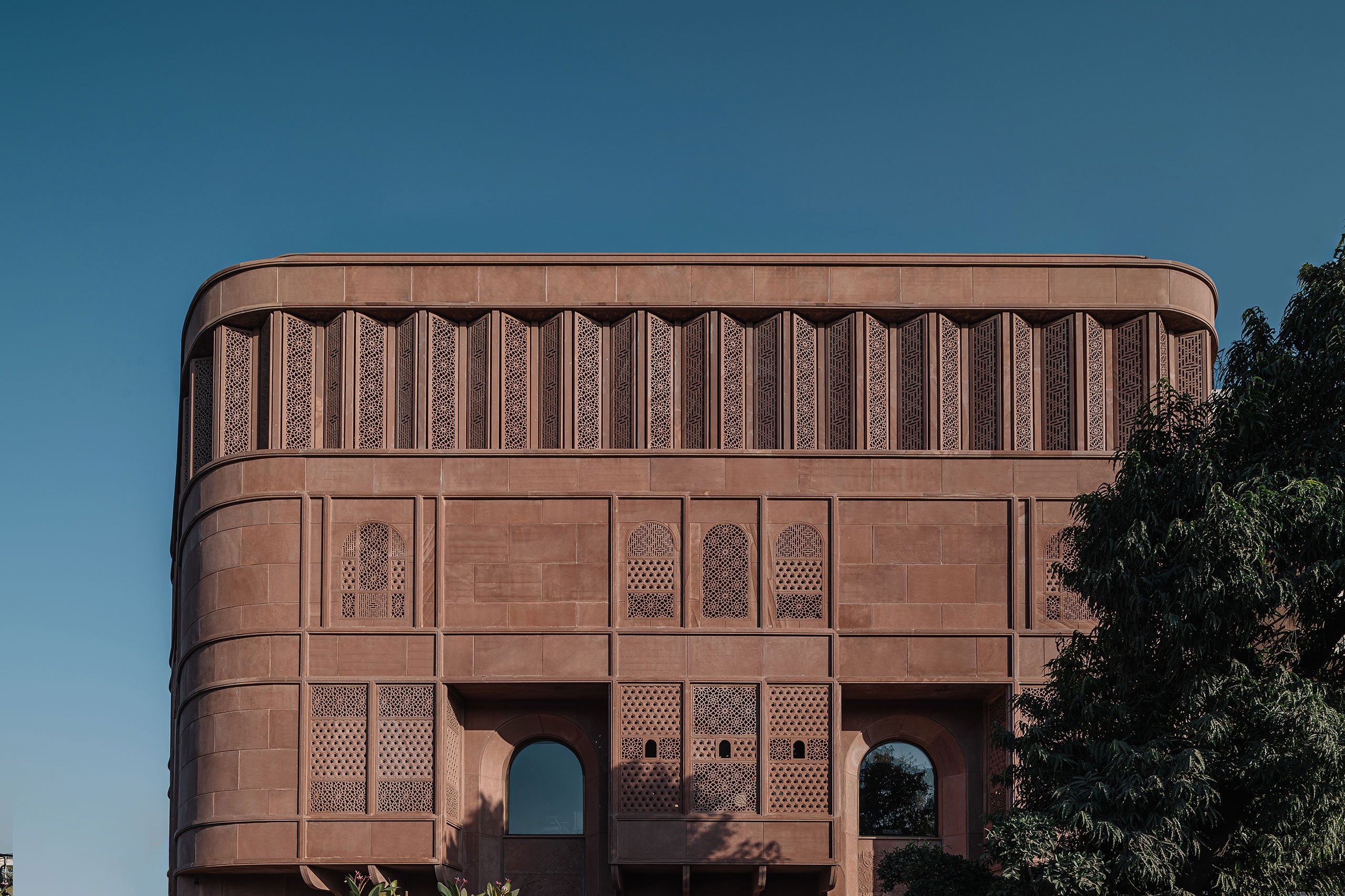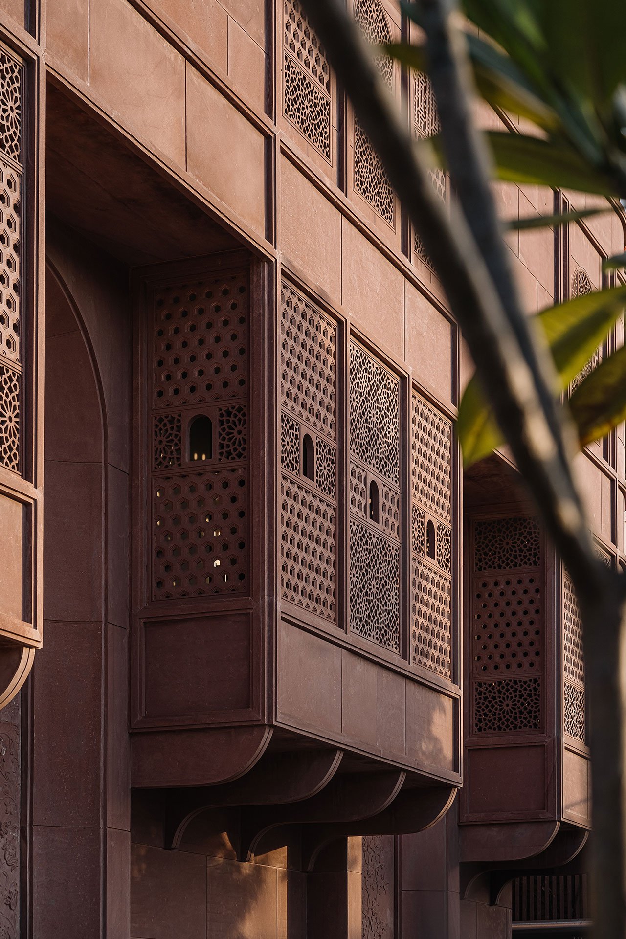 스튜디오 로터스는 자이푸르의 전통 건축을 현대적인 관점에서 재해석하는 데 중점을 두었습니다. 외관은 지역 자재인 조드푸르 붉은 사암을 사용해 정교하게 조각된 격자무늬로 장식되어 있습니다. 이 격자무늬는 라지푸타나, 무굴, 아르데코 건축 양식을 결합해 자연광을 실내로 부드럽게 유도하는 동시에 전통적인 장인정신을 반영하고 있습니다. 이러한 외관 설계는 수니타 쉐카왓의 주얼리 디자인 철학과 마찬가지로, 전통과 현대가 조화롭게 융합된 예술 작품처럼 기능합니다.