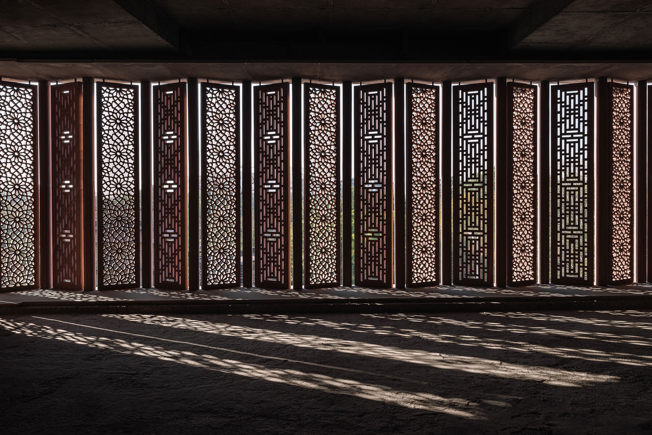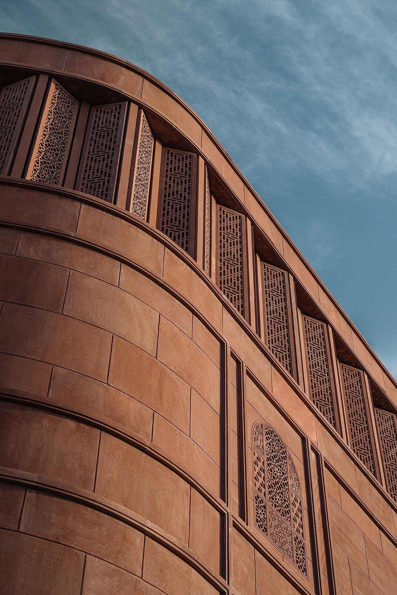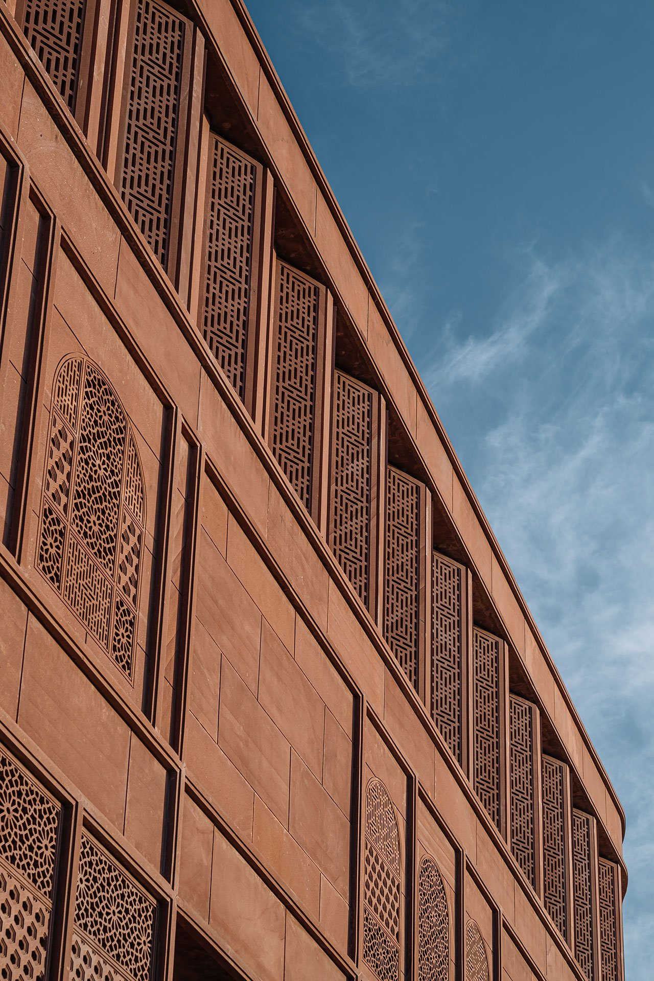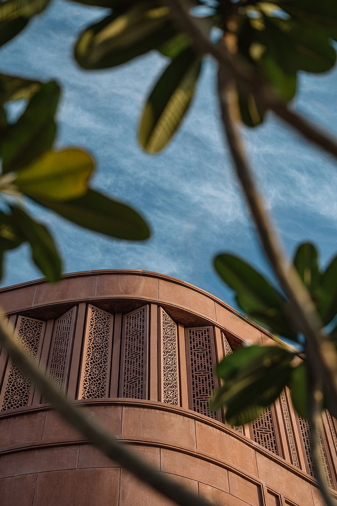 스튜디오 로터스는 자이푸르의 전통 건축을 현대적인 관점에서 재해석하는 데 중점을 두었습니다. 외관은 지역 자재인 조드푸르 붉은 사암을 사용해 정교하게 조각된 격자무늬로 장식되어 있습니다. 이 격자무늬는 라지푸타나, 무굴, 아르데코 건축 양식을 결합해 자연광을 실내로 부드럽게 유도하는 동시에 전통적인 장인정신을 반영하고 있습니다. 이러한 외관 설계는 수니타 쉐카왓의 주얼리 디자인 철학과 마찬가지로, 전통과 현대가 조화롭게 융합된 예술 작품처럼 기능합니다.