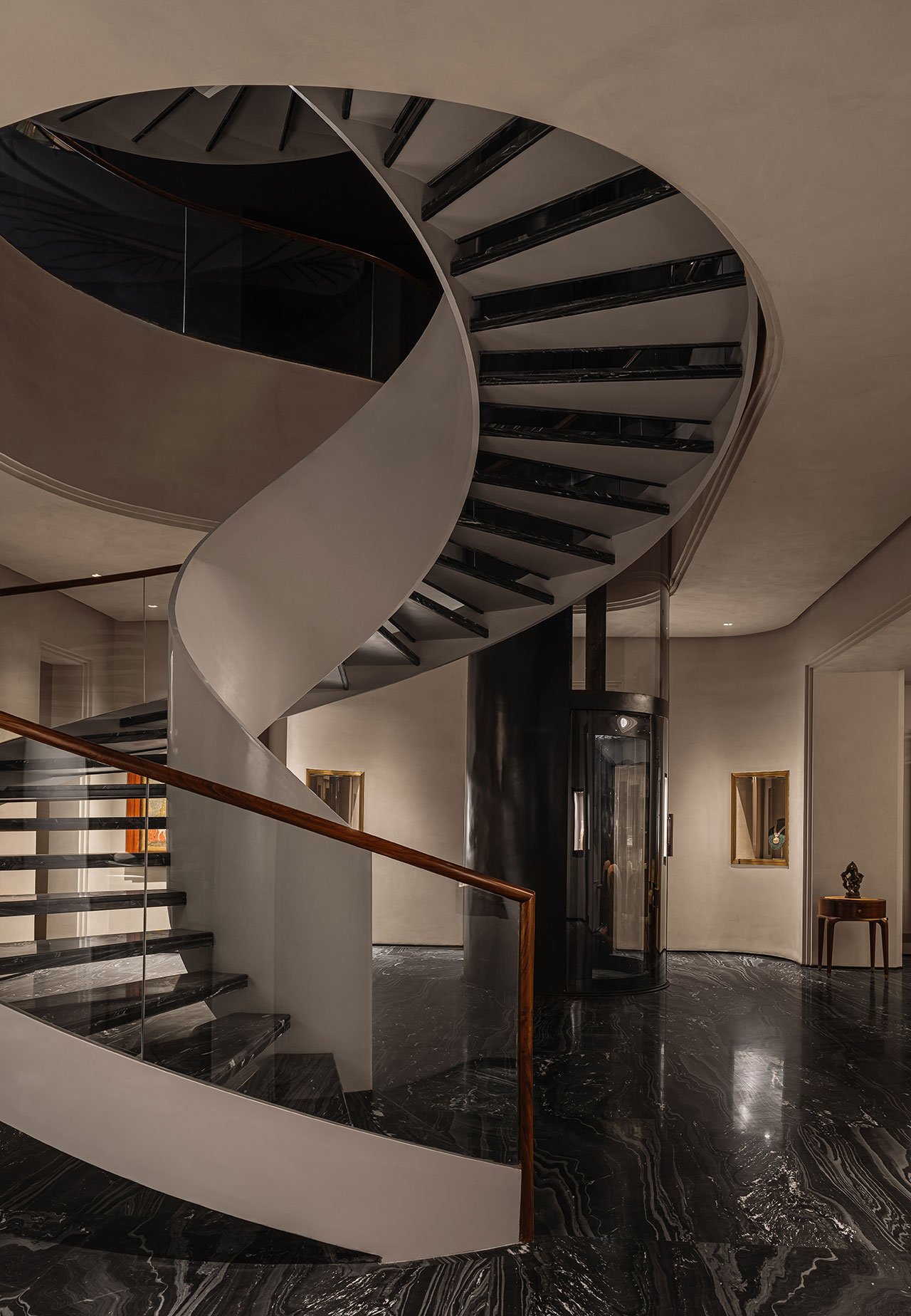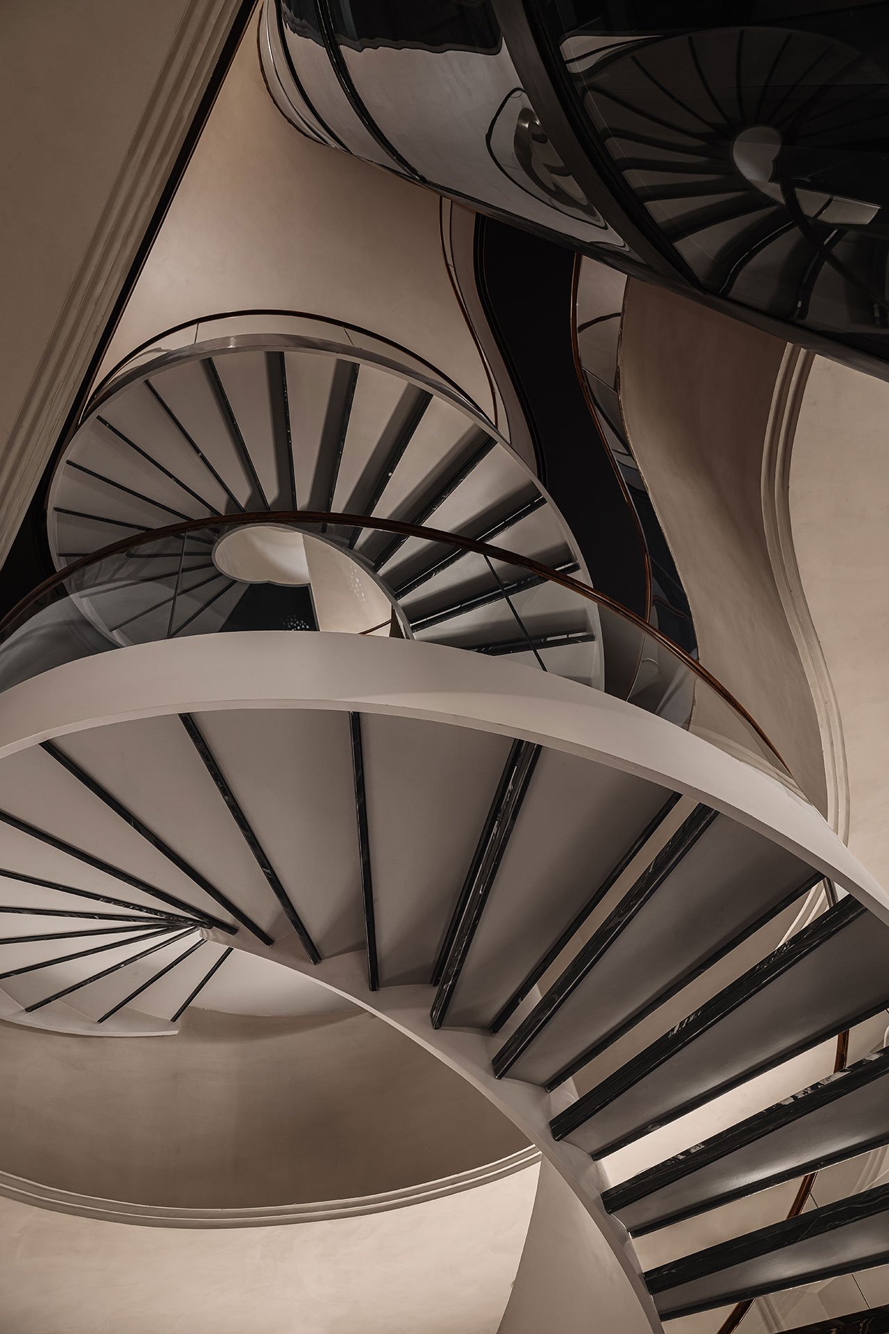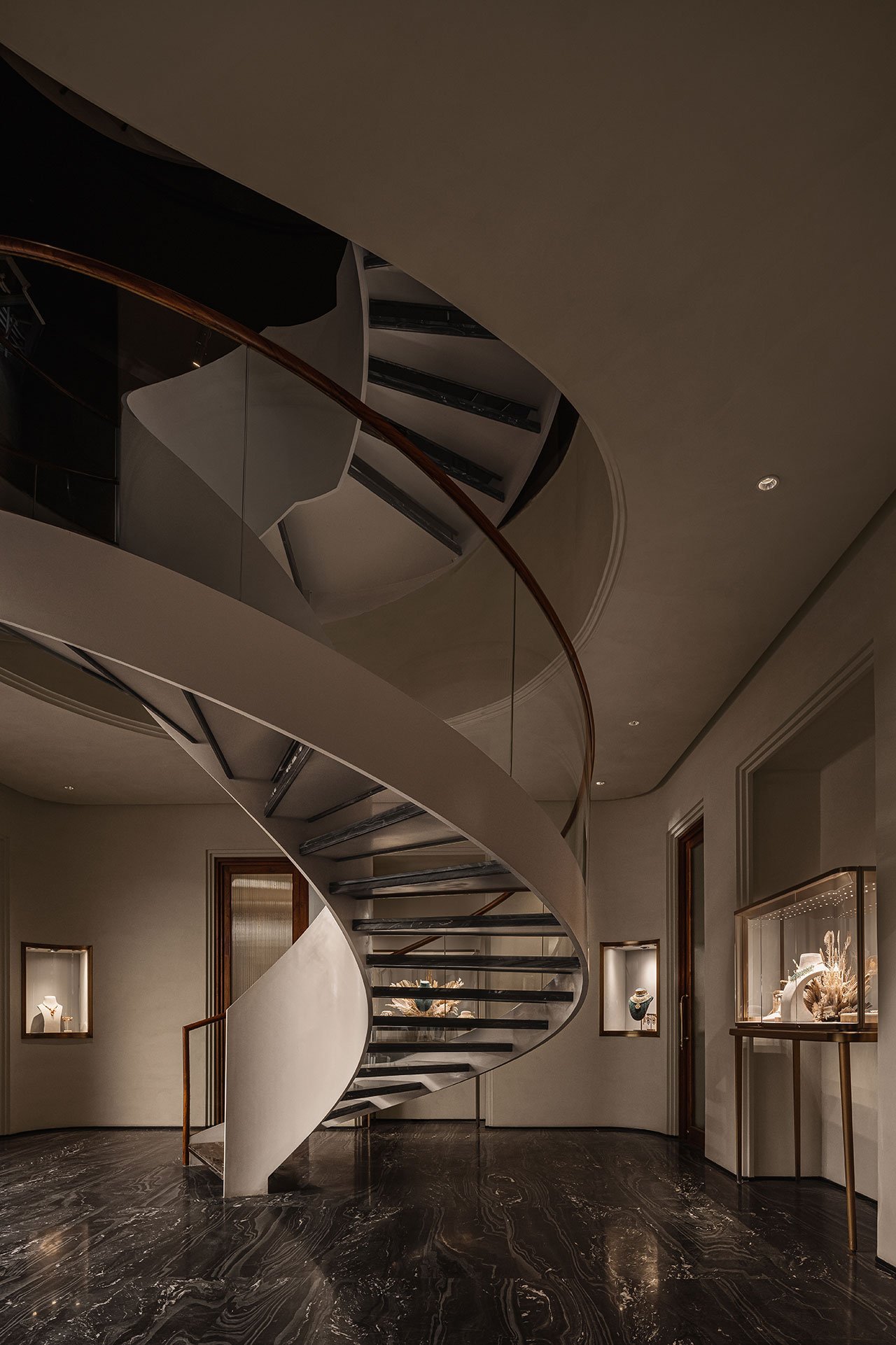 Once inside, visitors are greeted by a sweeping sculptural staircase, a dynamic architectural feature that winds through the heart of the building, connecting all three floors. This central staircase is symbolic, tying together the different functions of the building, from retail to office spaces, and serving as a metaphor for the interconnectedness of tradition and modernity.