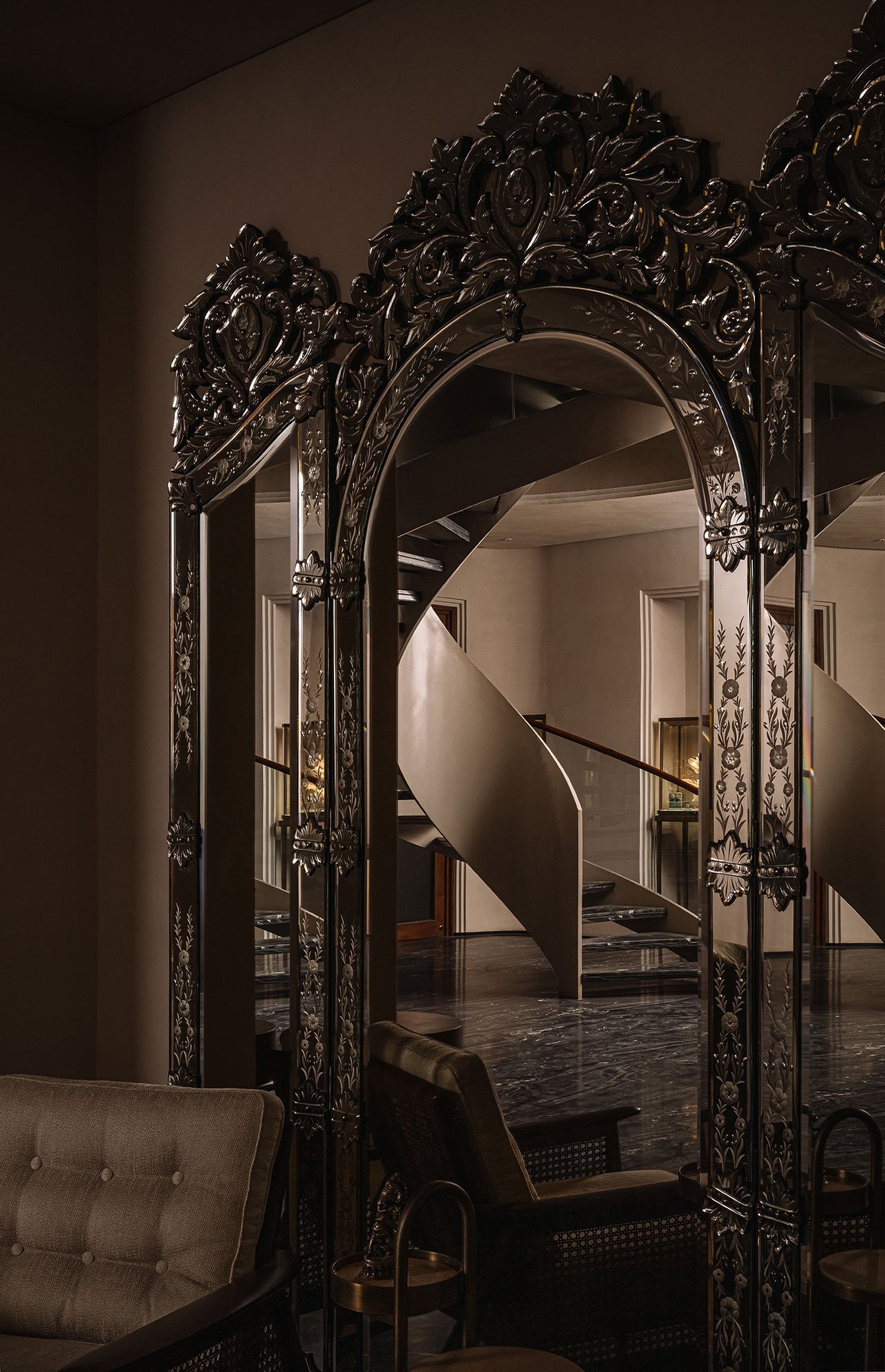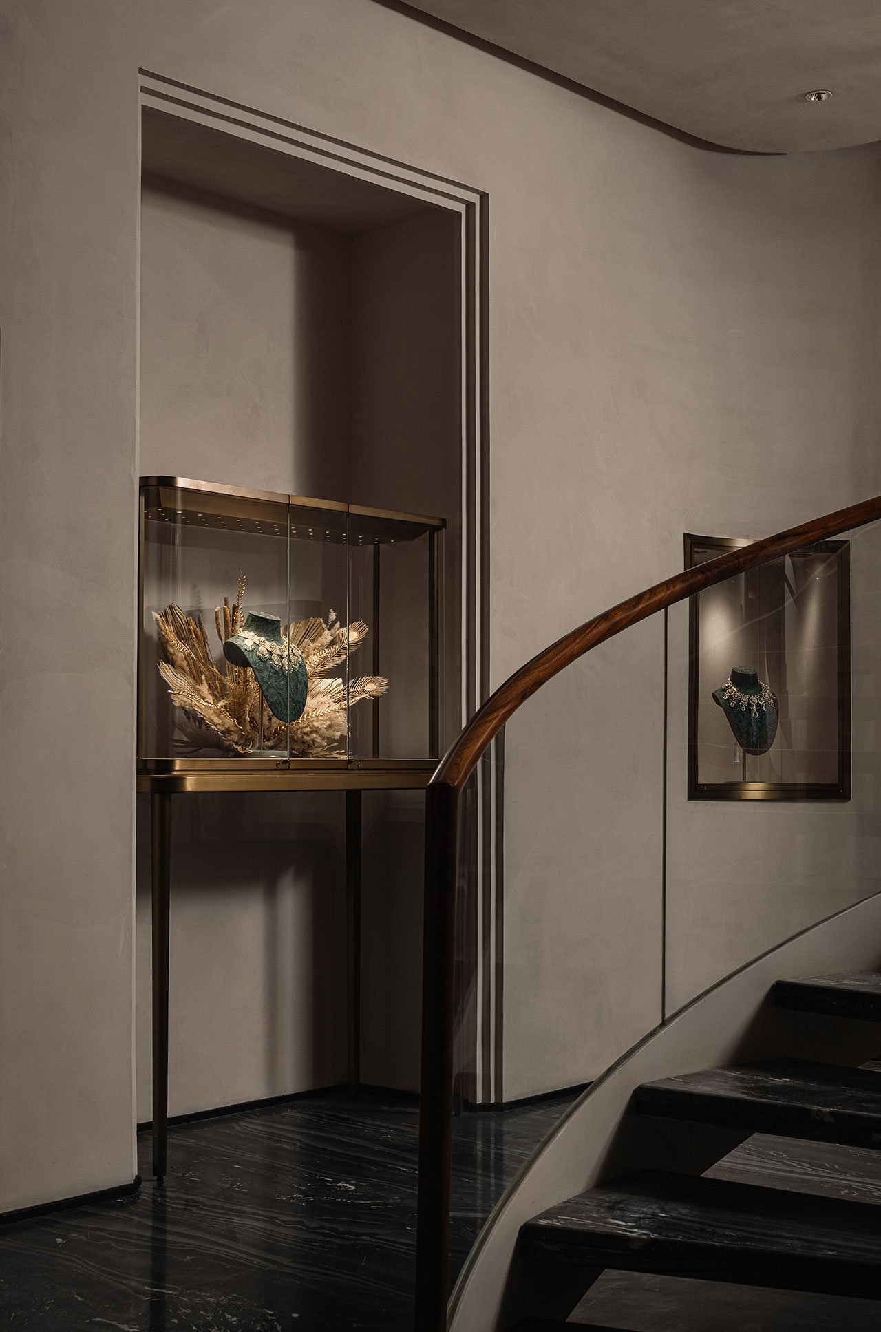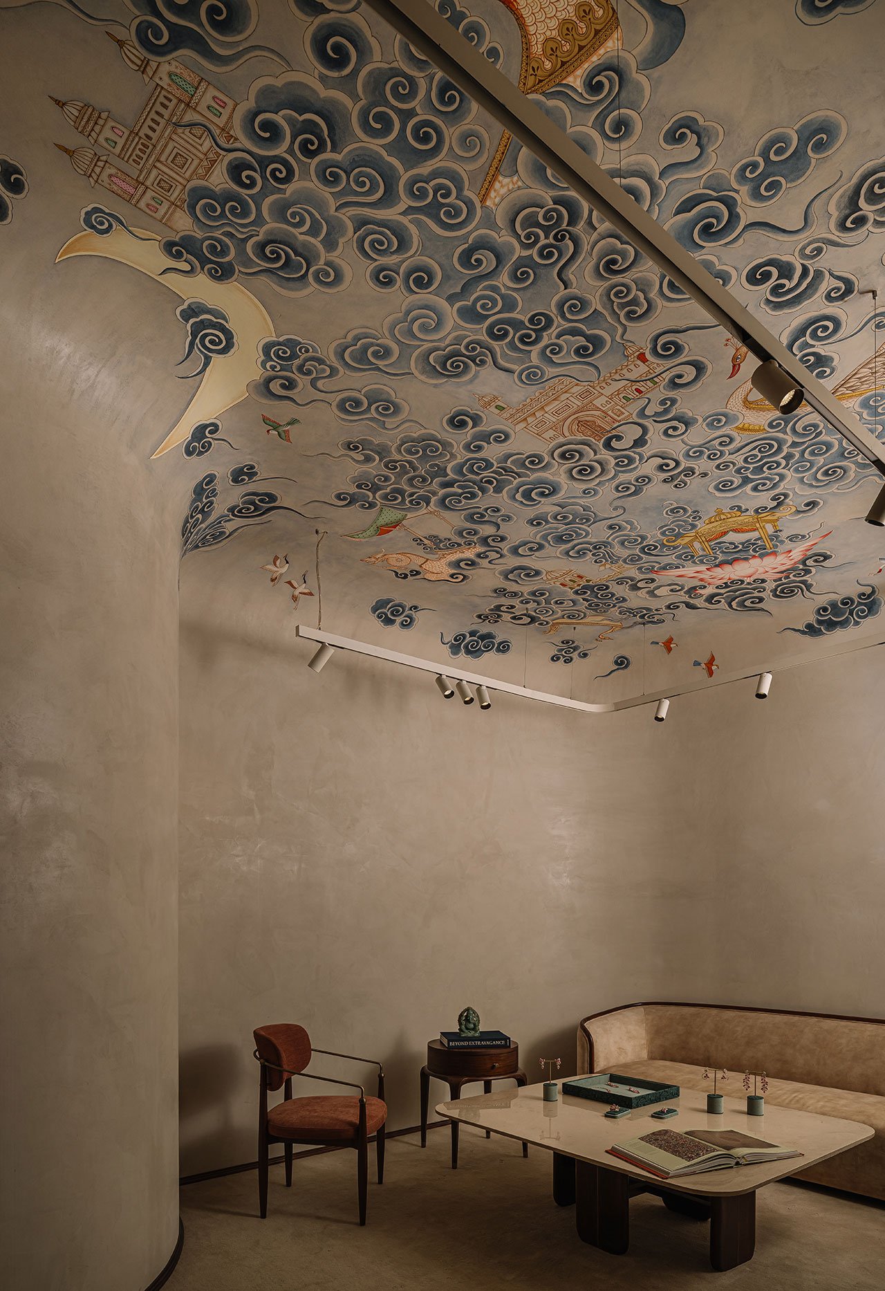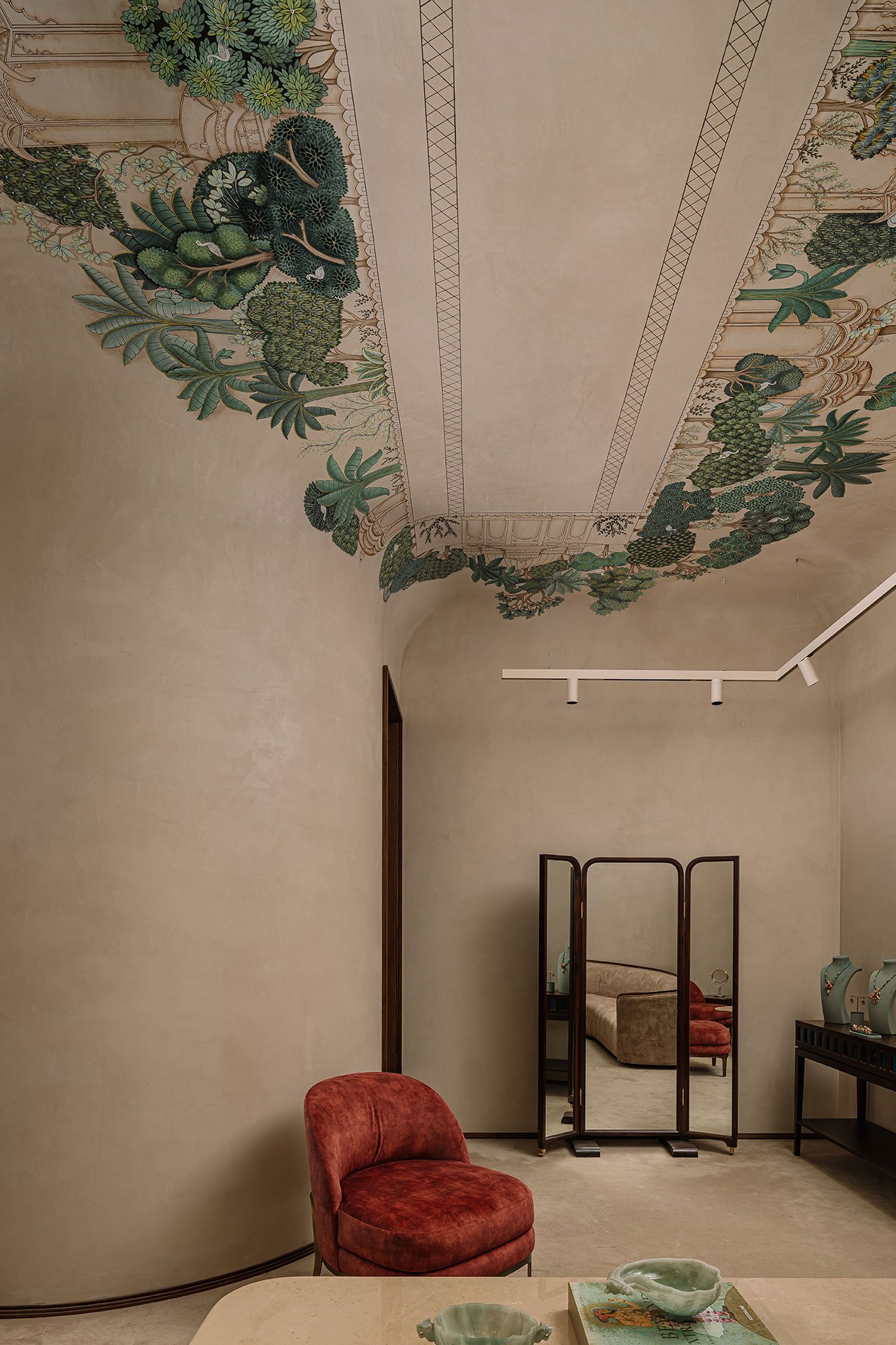 지하층에 위치한 프라이빗 클라이언트 상담실은 맞춤형 주얼리 상담을 위해 독립적으로 디자인되었습니다. 이 공간은 '아라이쉬' 라임 스투코로 마감된 벽면과 프레스코화가 장식된 반 아치형 천장이 돋보이며, 수니타 쉐카왓의 주얼리 컬렉션처럼 정교함과 고급스러움을 자아냅니다. 이 맞춤형 공간은 고객에게 특별하고 개인화된 경험을 제공하며, 수니타 쉐카왓의 브랜드 철학인 고객 맞춤형 경험을 극대화합니다.
