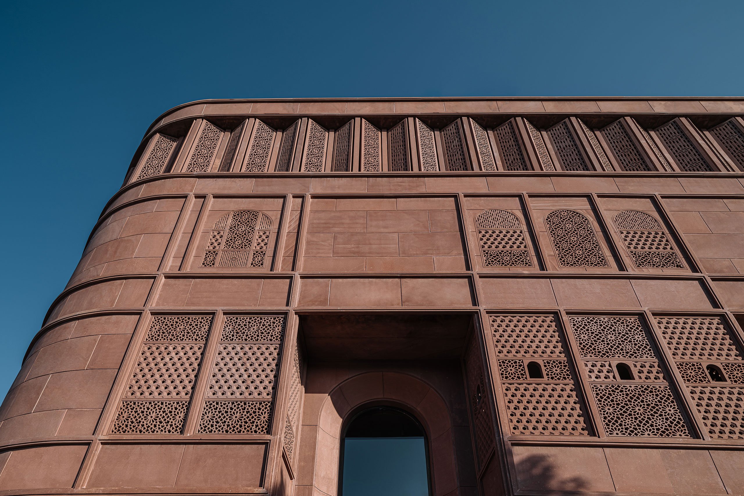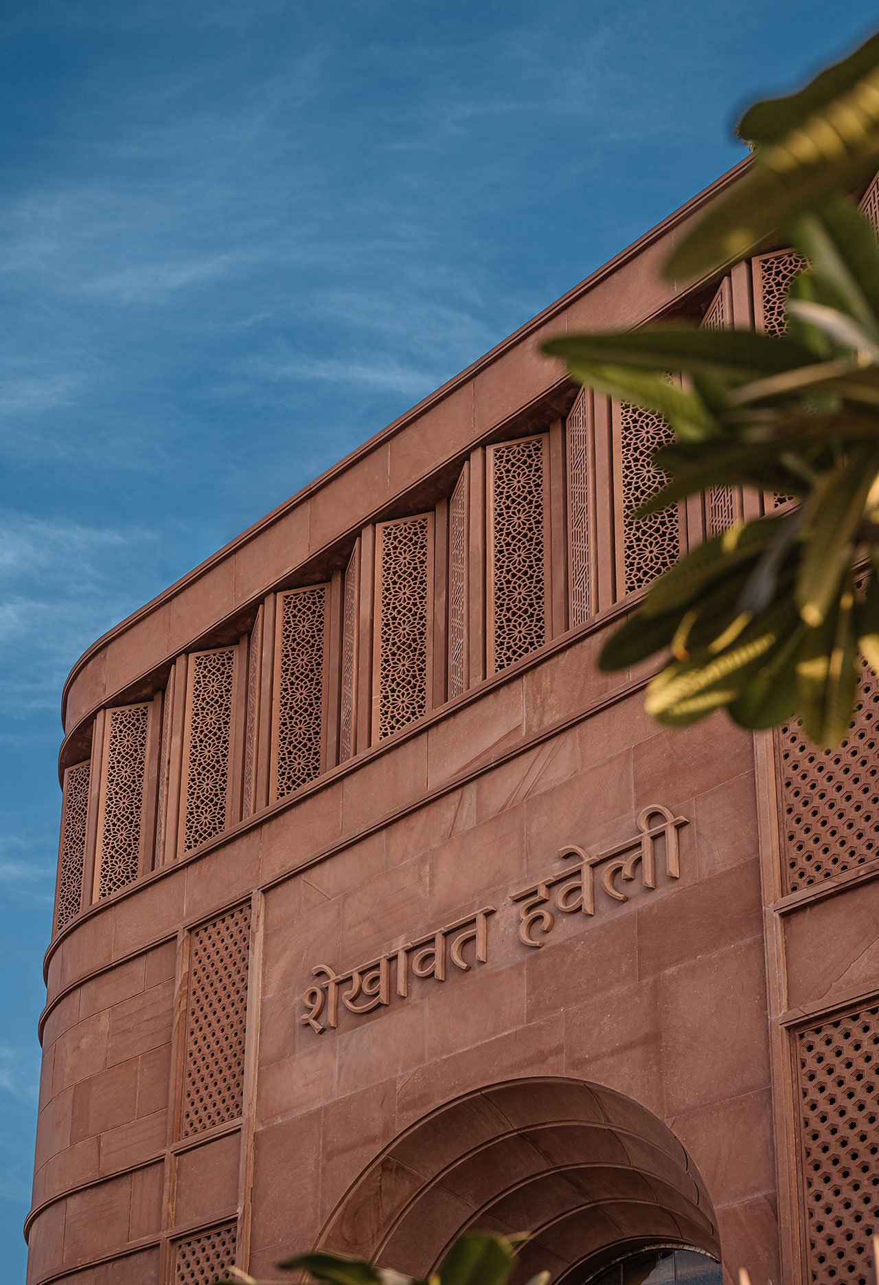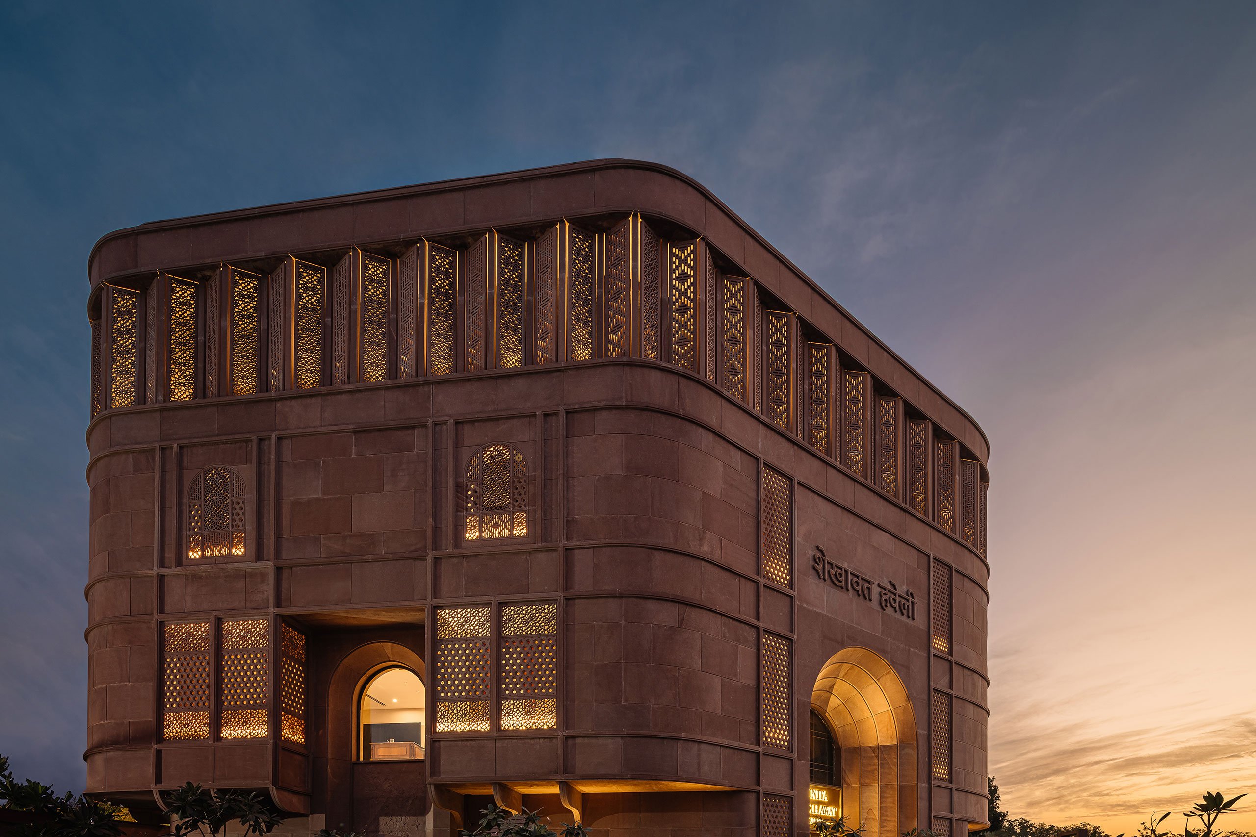Veteran Indian jewellery designer Sunita Shekhawat is known for breathing new life into the ancient craft of Meenakari, an age old art form of enamelling metal surfaces with vibrant colours, patterns, and designs. So when her eponymous brand’s new flagship store in Jaipur was under development, it was decided that it should also house a museum-gallery dedicated to exploring, preserving, and celebrating the Meenakari craft. Going one step further, New Delhi-based multidisciplinary design practice Studio Lotus channelled Jaipur’s architectural legacy and traditional artistry throughout their design. The result is a jewel-like building of artisanal craftsmanship, showcasing meticulously crafted interior frescoes and a striking hand-carved sandstone facade that evocatively echoes the pink palette the city is known for.