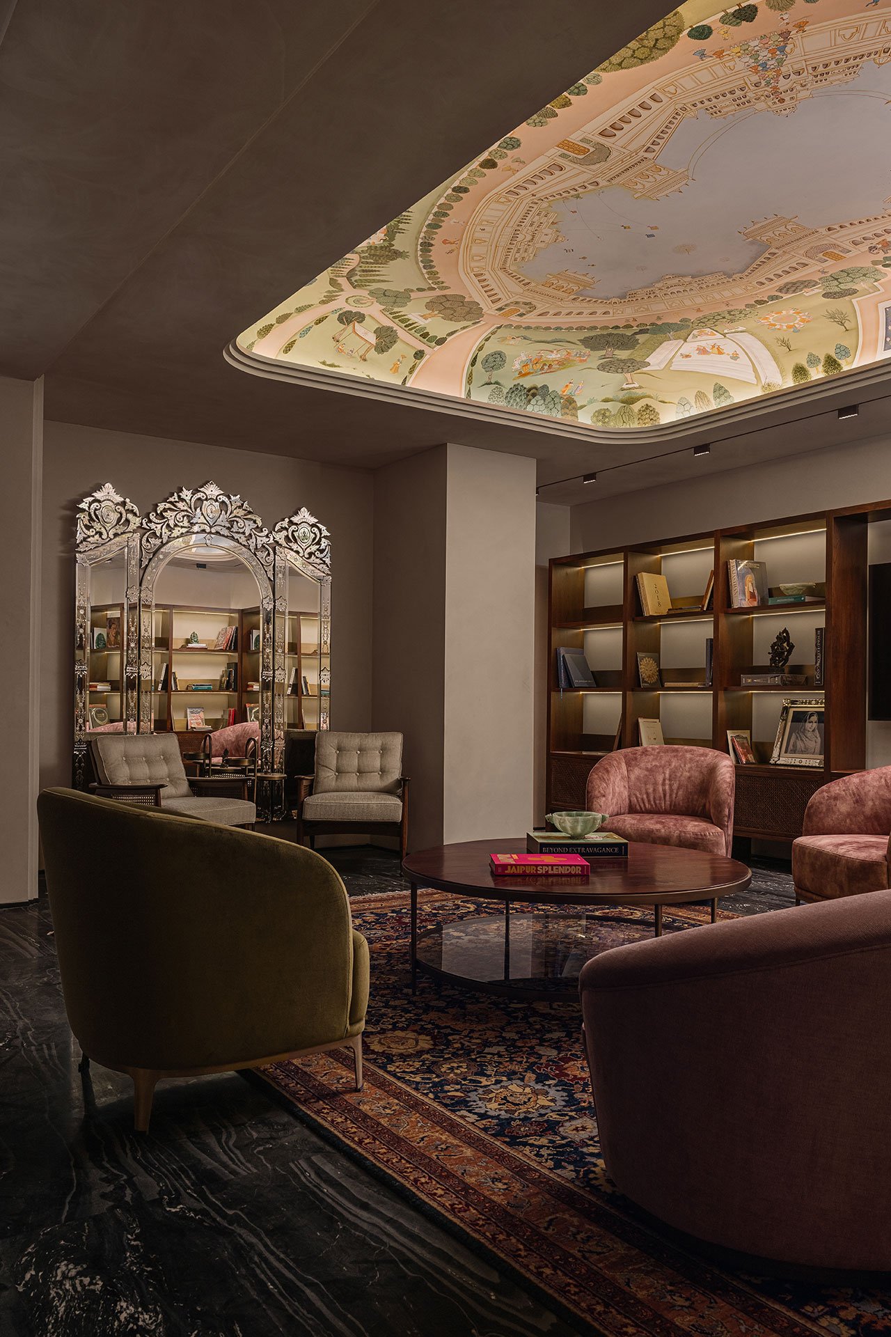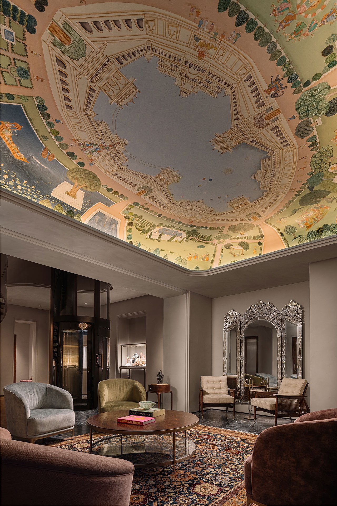 건물 내부는 수공예 장인들의 정교함을 그대로 보여주는 공간입니다. 천장에 그려진 프레스코화는 자이푸르의 자연과 건축을 섬세하게 묘사한 작품으로, 12명의 장인이 수개월에 걸쳐 완성한 결과물입니다. 이 프레스코화는 공간의 중심적 요소로, 공간을 예술적 분위기로 만들어 주며 전통과 현대가 조화된 환경을 제공합니다. 벨벳 소재의 소파와 견고한 목재 테이블은 고급스러움과 따뜻함을 더해, 방문객들이 편안함을 느낄 수 있도록 디자인되었습니다.