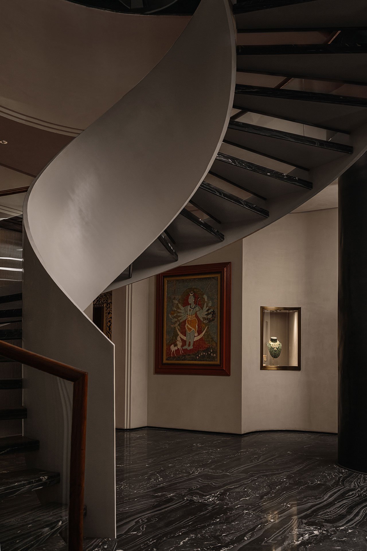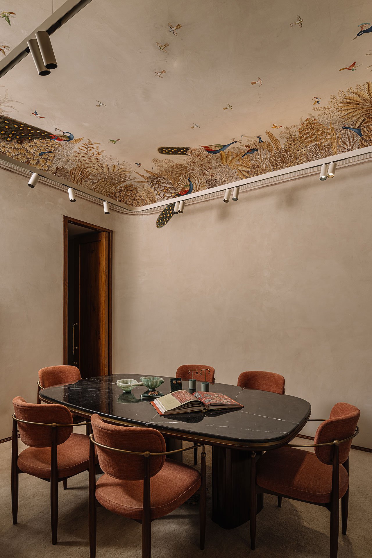 The lower ground floor is where the retail magic happens, featuring private client pods for intimate, one-on one consultations. These bespoke spaces are works of art in themselves, adorned with off-white ‘araish’ lime stucco and semi-vaulted ceilings intricately embellished with frescoes depicting the local architecture and flora. Created over several months by 12 skilled artisans, the frescoes represent the same hand-crafted luxury that defines Shekhawat’s jewellery, resulting in a space that is both an ode to craft and a functional setting for bespoke luxury retail.