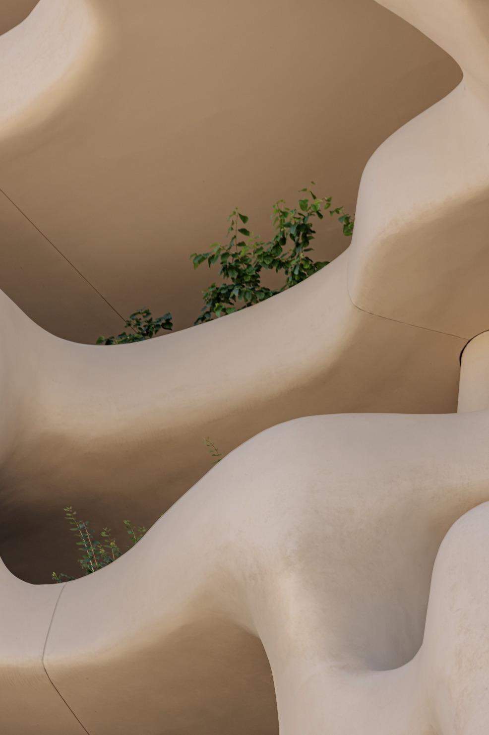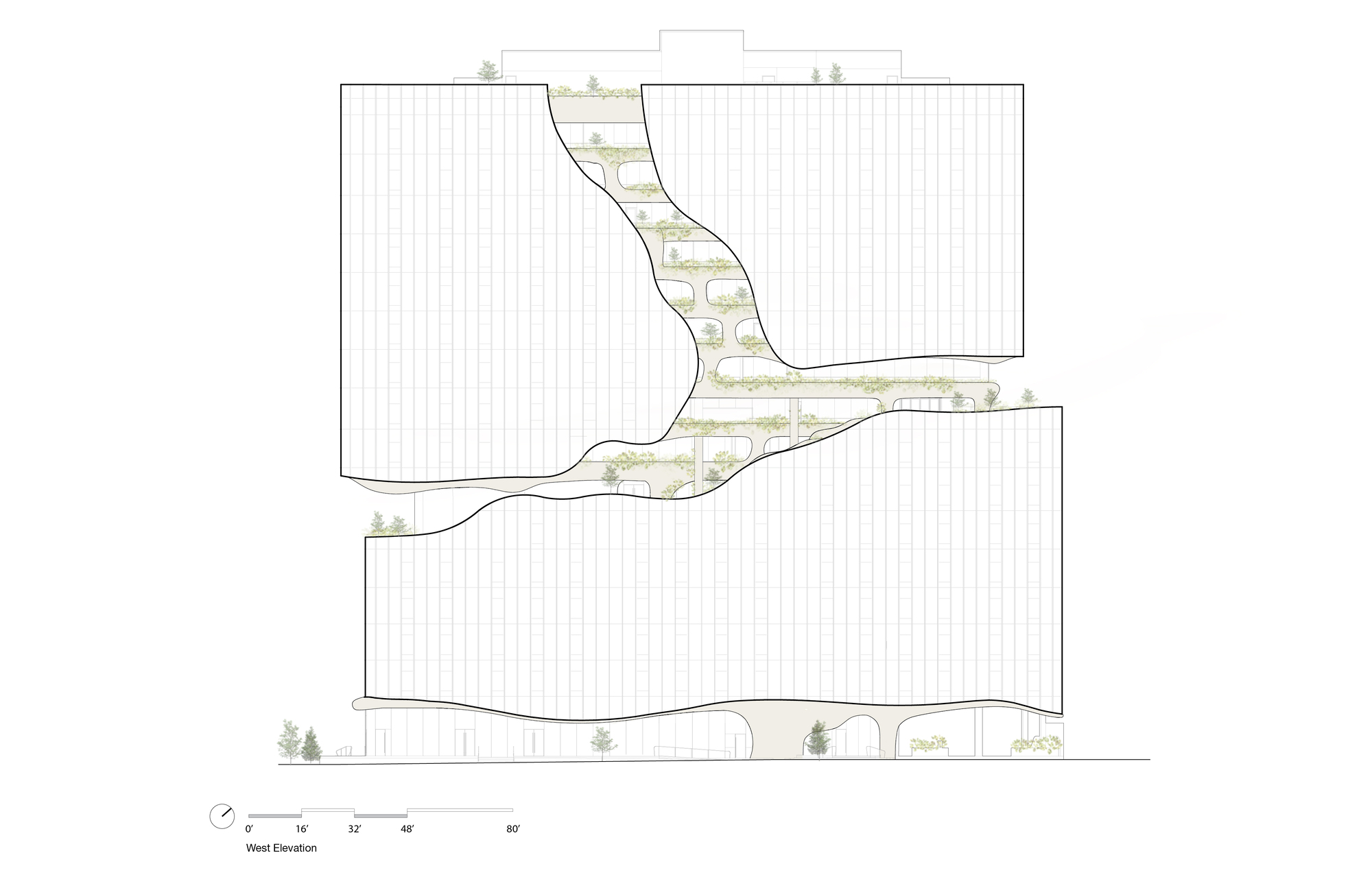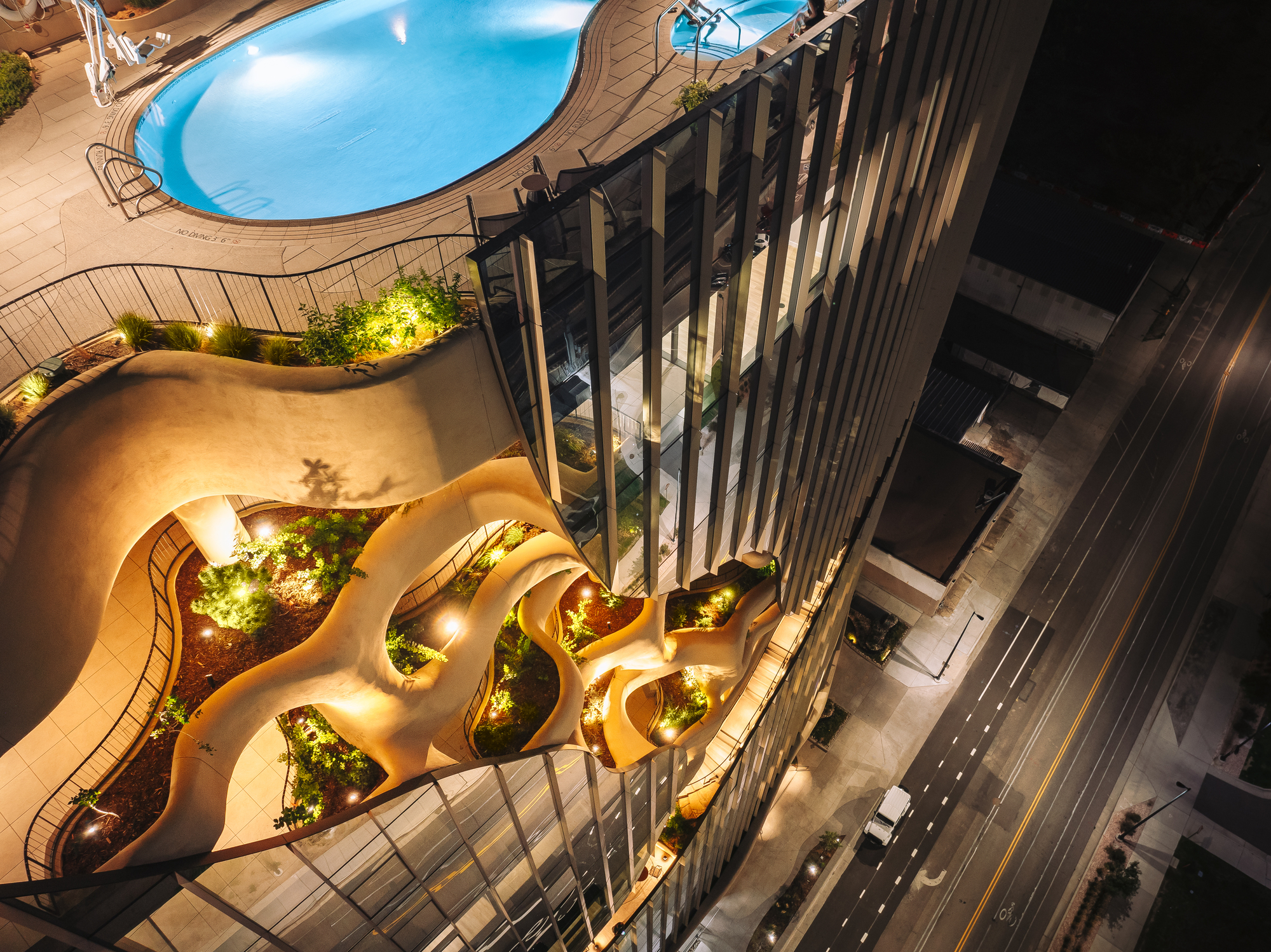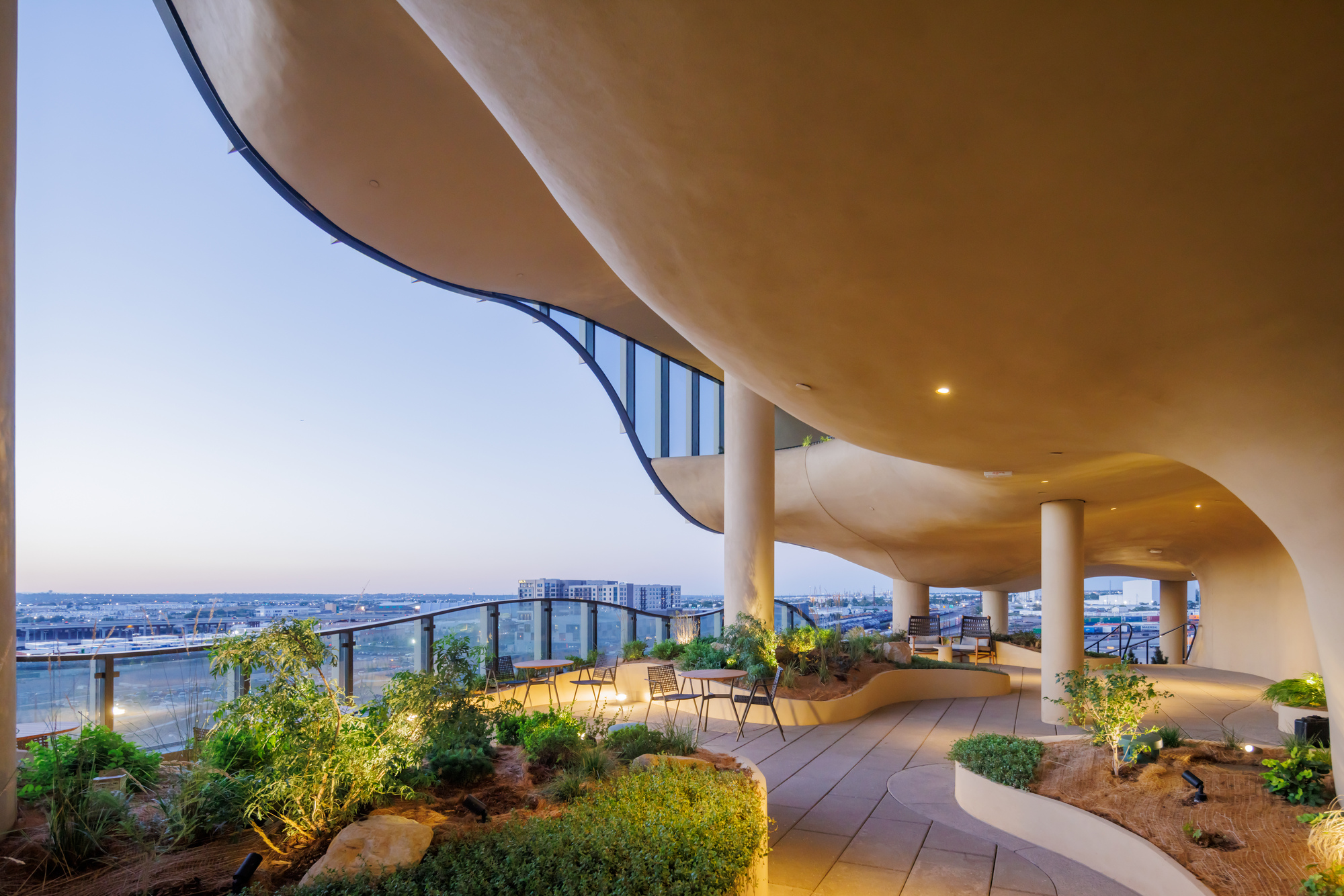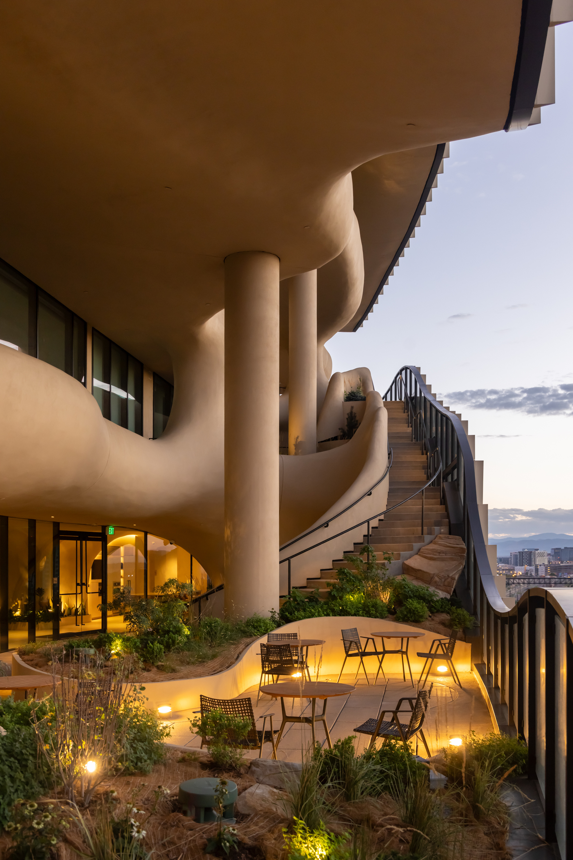 The soft surfaces of the Canyon—a carved-out, four story amenity space inspired by natural erosion and designed to evoke a slot canyon, were designed by MAD to contrast the clean geometric lines of the building's massing. This feature includes over 13,000 square feet of landscaped terraces that appear to hang in open space, offering some of the city's most breathtaking views, along with water elements that foster a strong connection between residents and the natural environment. The canyon-like structure running through the façade creates an immersive, natural experience, merging indoor and outdoor spaces and blurring the boundaries between nature and architecture.