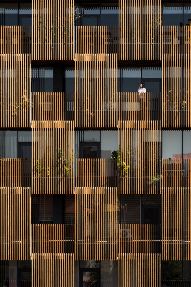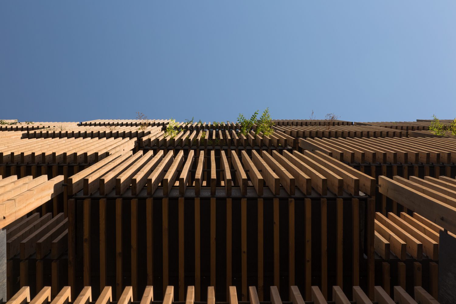 건물의 내부와 외부 공간은 유기적으로 연결되어 있으며, 각 층마다 있는 테라스는 사용자들이 외부 환경을 느낄 수 있는 공간을 제공합니다. 이 테라스는 나무 격자를 통해 시각적 차단과 개방감을 동시에 제공하여, 외부 경관을 즐기면서도 프라이버시를 보호합니다. 지속 가능한 재료를 사용한 건물의 외관은 도시 속에서 자연을 느낄 수 있는 공간으로 설계되었으며, 도시 환경과 자연의 조화를 이루고자 하는 건축가의 의도가 뚜렷하게 드러납니다.