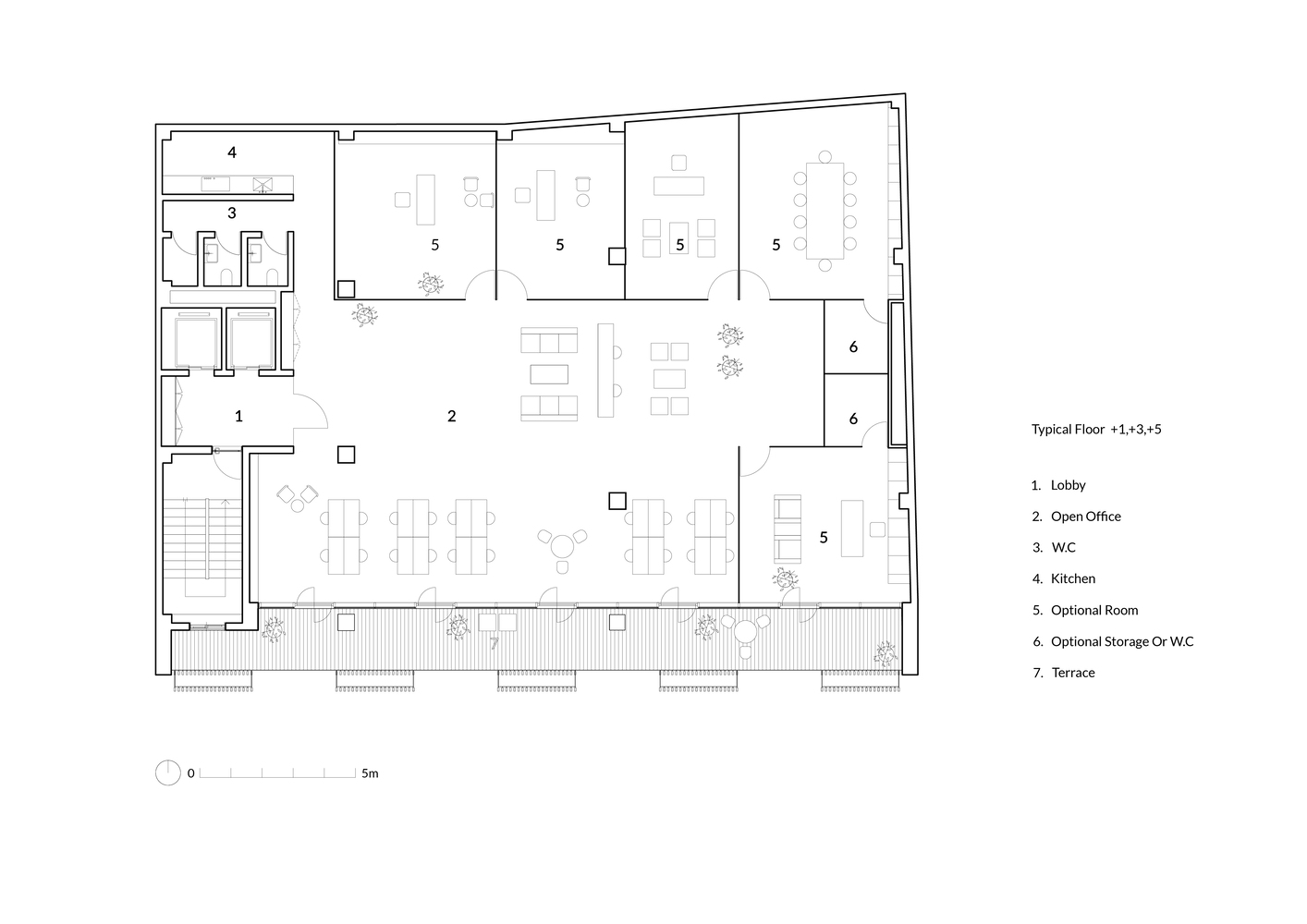 To achieve this, the boundary between the building and the city was defined by two distinct layers. The first, closer to the interior, consisted of large, transparent windows that allowed natural light to flood the space, enhancing visibility and openness. The second, external layer was semi transparent, composed of wooden railings and steel planters, forming a permeable screen. This outer layer acted as a filter, regulating light and airflow while providing a sense of privacy for the occupants. The space between these two layers became an active zone—partially open, serving both functional and aesthetic purposes, and softening the transition between the building and its urban environment.