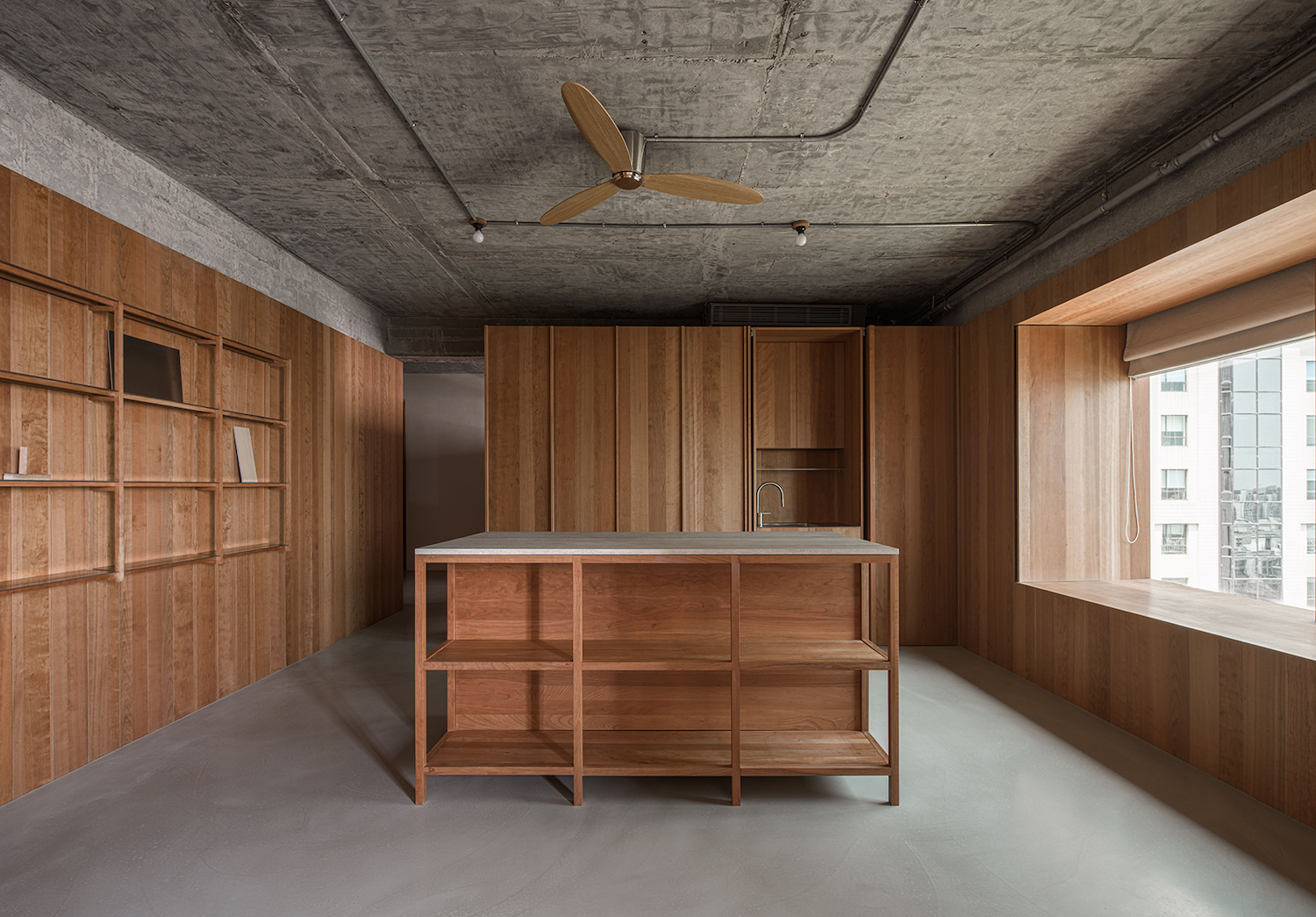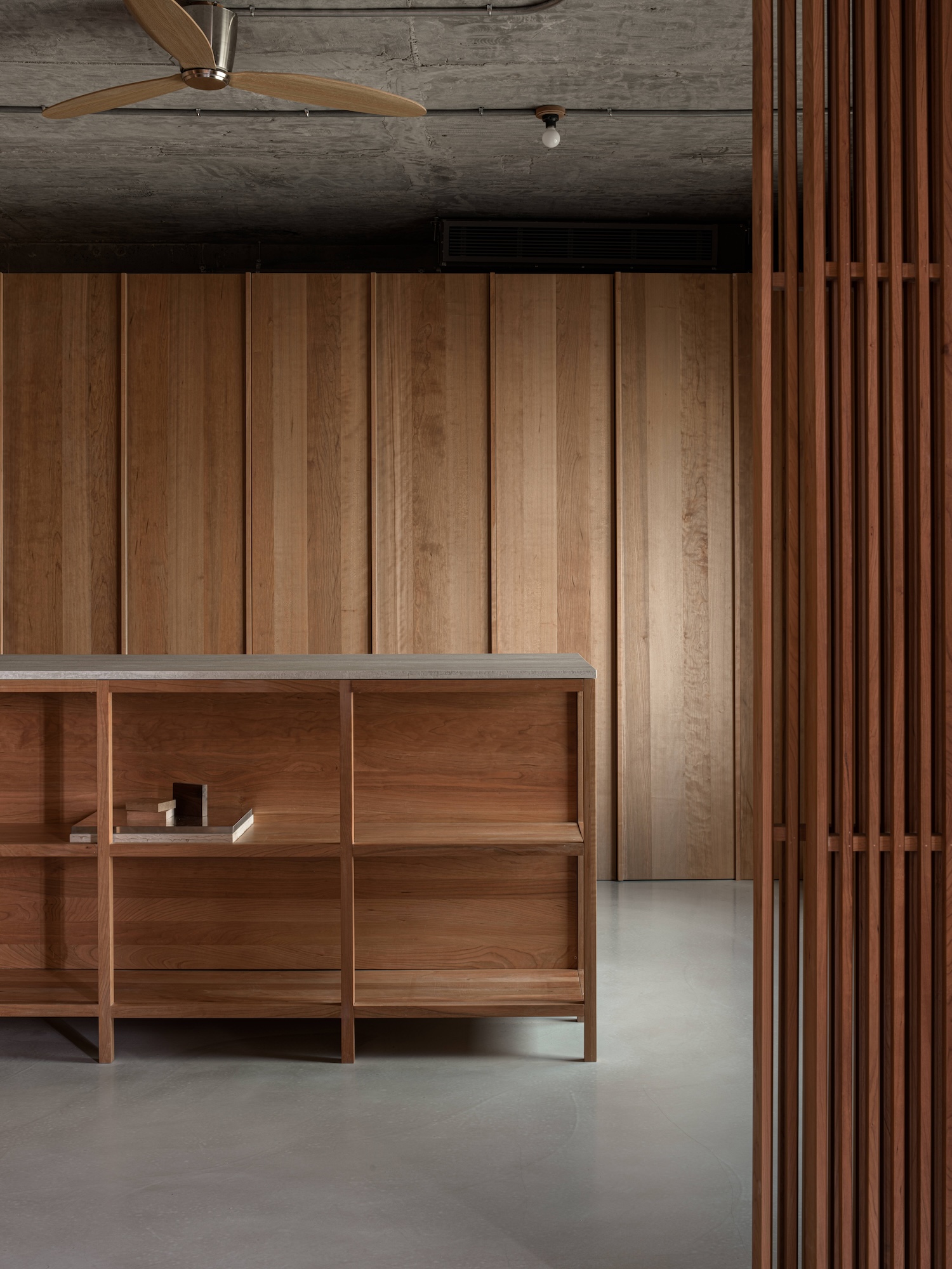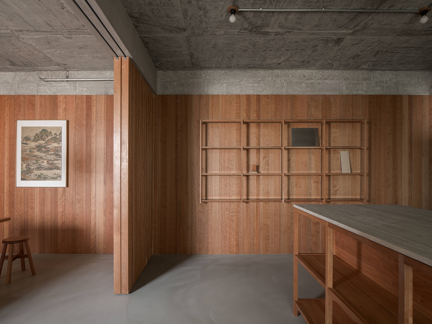 The exposed ceiling lights and visible fire safety systems respond to the building’s industrial context, keeping the design simple while meeting functional requirements. Moving through the office leads to the central display area, where a cherry wood island stands as the focal point. The island creates a natural circulation path and serves as a place of connection and interaction. Built with a traditional mortise and tenon joint system, the island’s drawer storage adds both utility and craftsmanship to the space. An open shelving system on the opposite side maintains a sense of lightness and transparency while allowing samples to be displayed within easy reach. The raw concrete ceiling was polished and left exposed, enhancing the authentic architectural character.