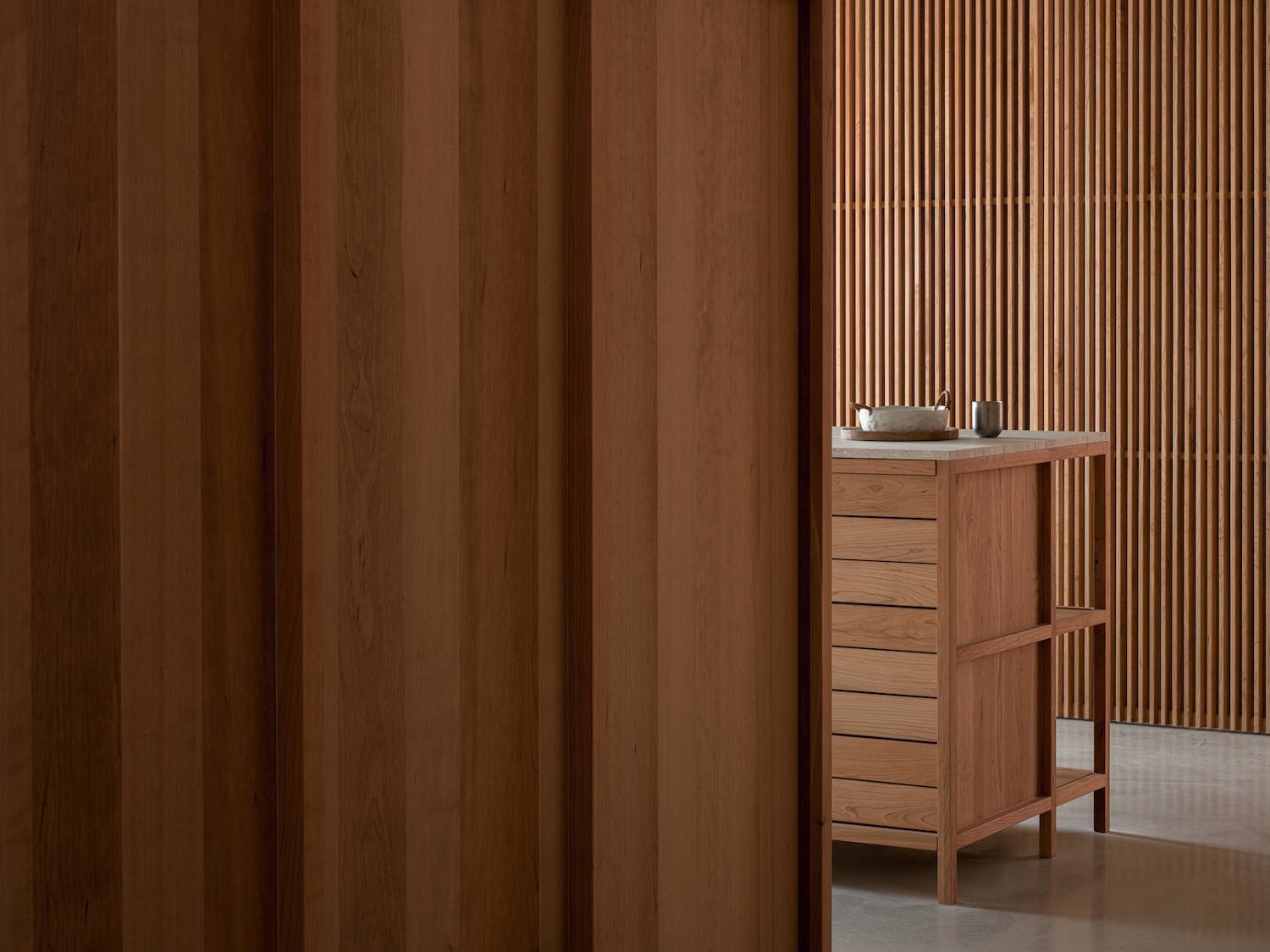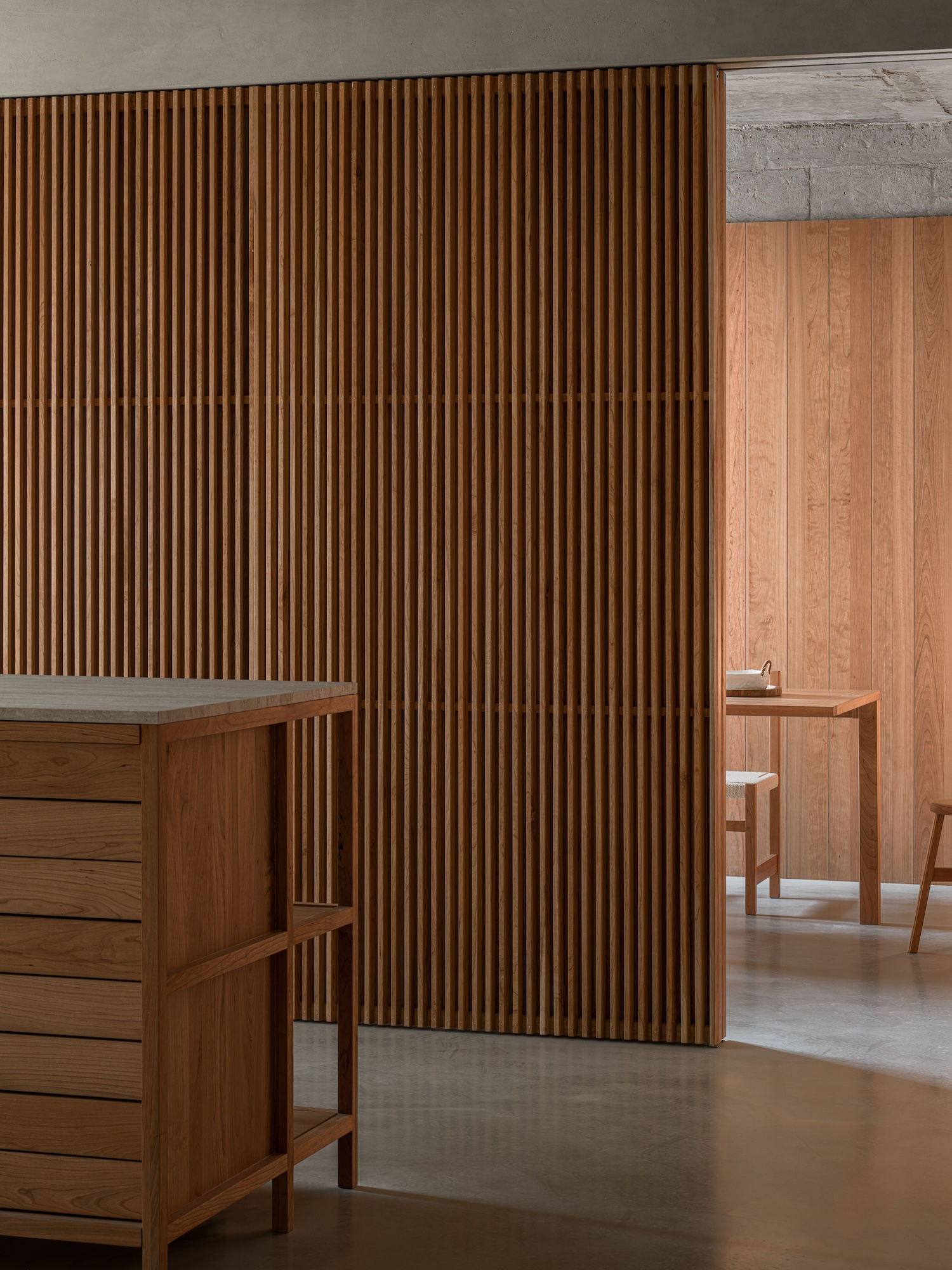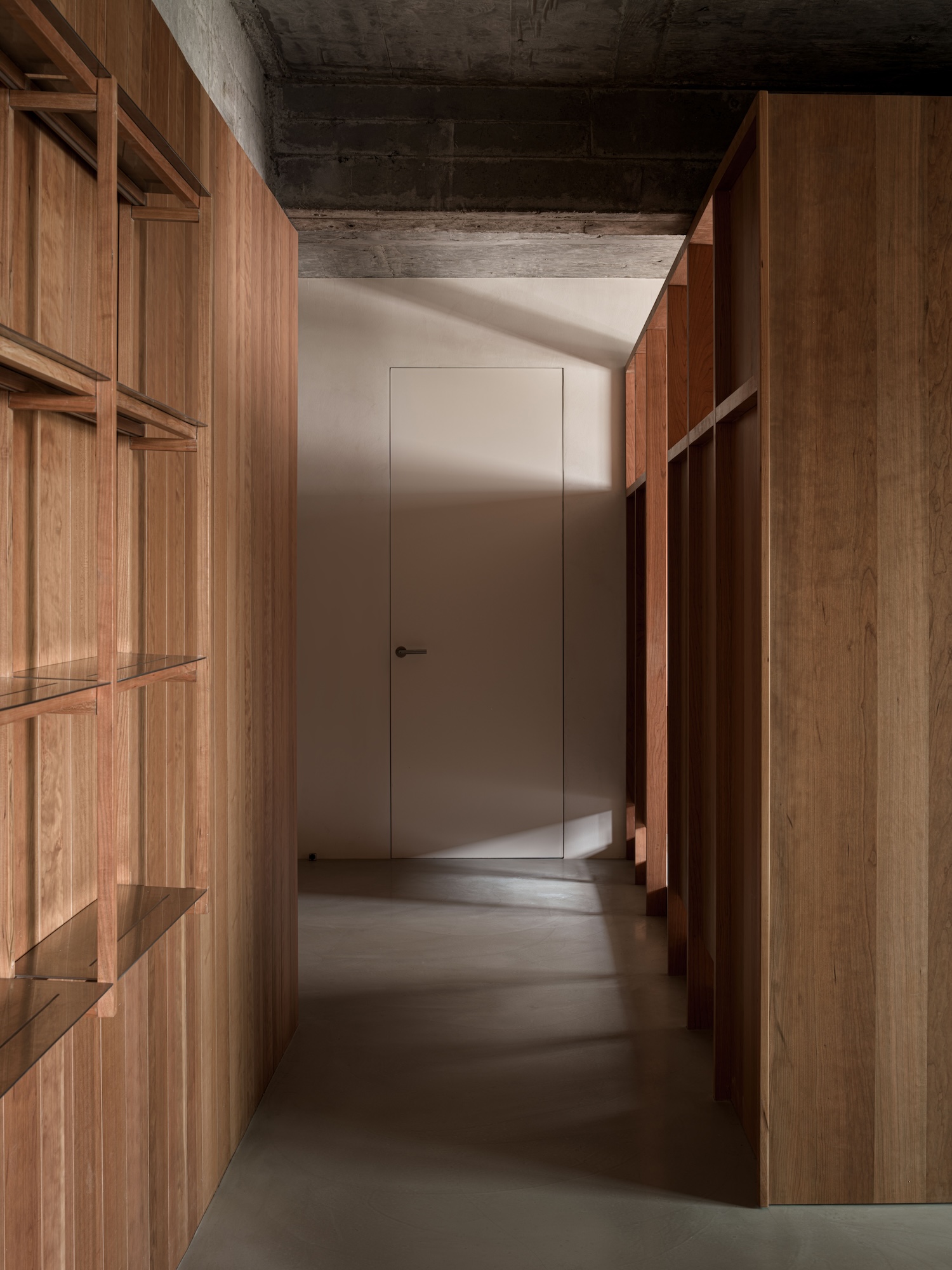 The exposed ceiling lights and visible fire safety systems respond to the building’s industrial context, keeping the design simple while meeting functional requirements. Moving through the office leads to the central display area, where a cherry wood island stands as the focal point. The island creates a natural circulation path and serves as a place of connection and interaction. Built with a traditional mortise and tenon joint system, the island’s drawer storage adds both utility and craftsmanship to the space. An open shelving system on the opposite side maintains a sense of lightness and transparency while allowing samples to be displayed within easy reach. The raw concrete ceiling was polished and left exposed, enhancing the authentic architectural character.