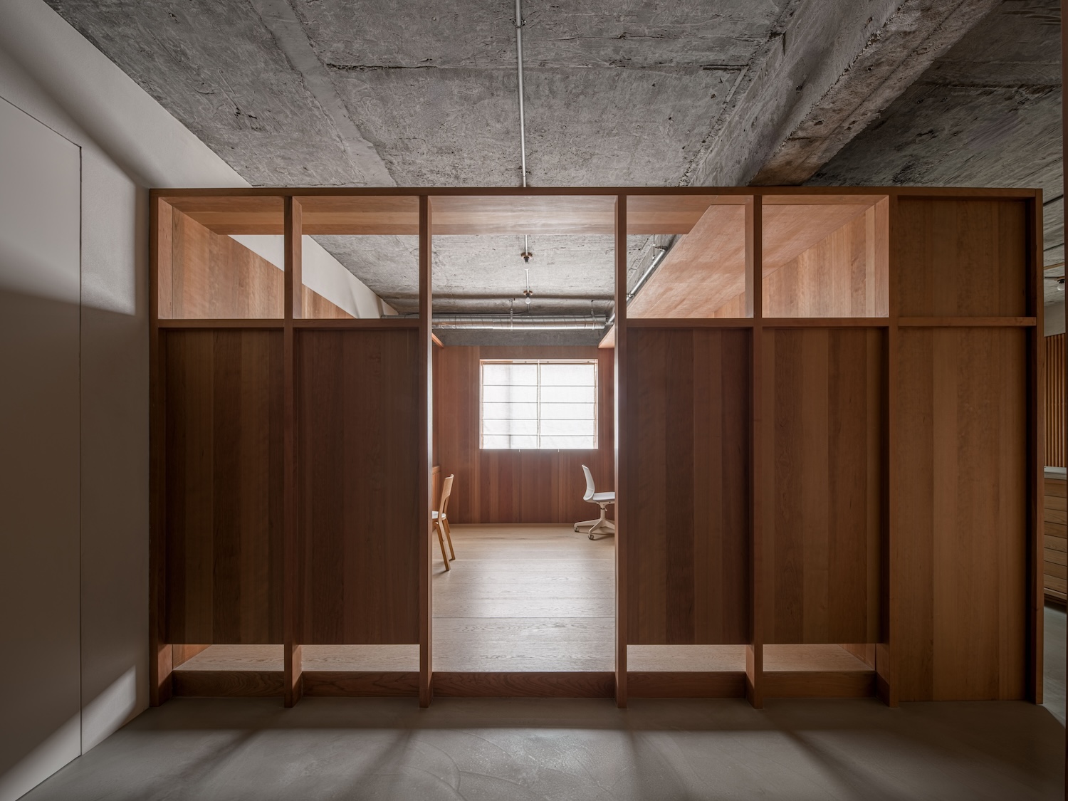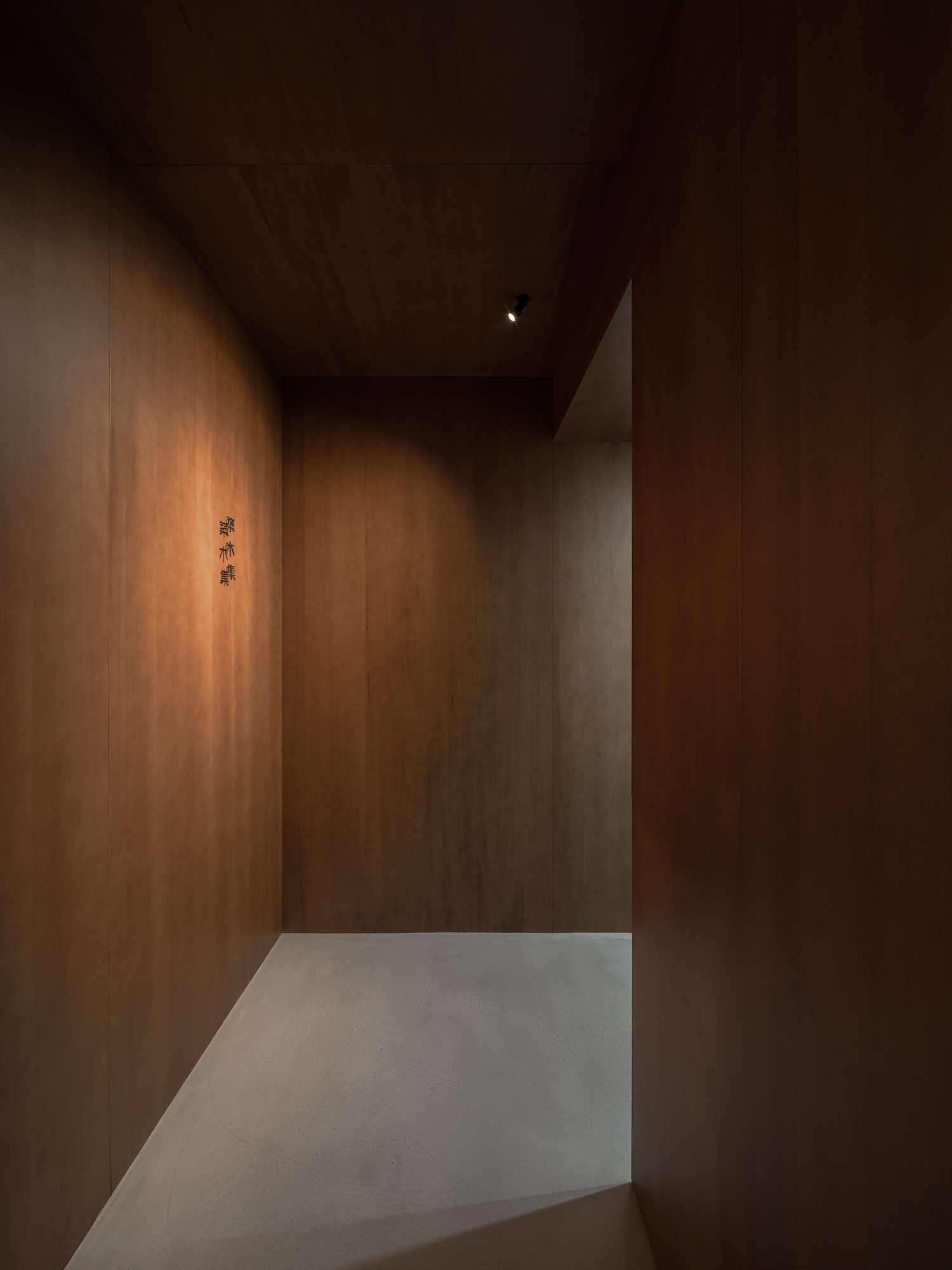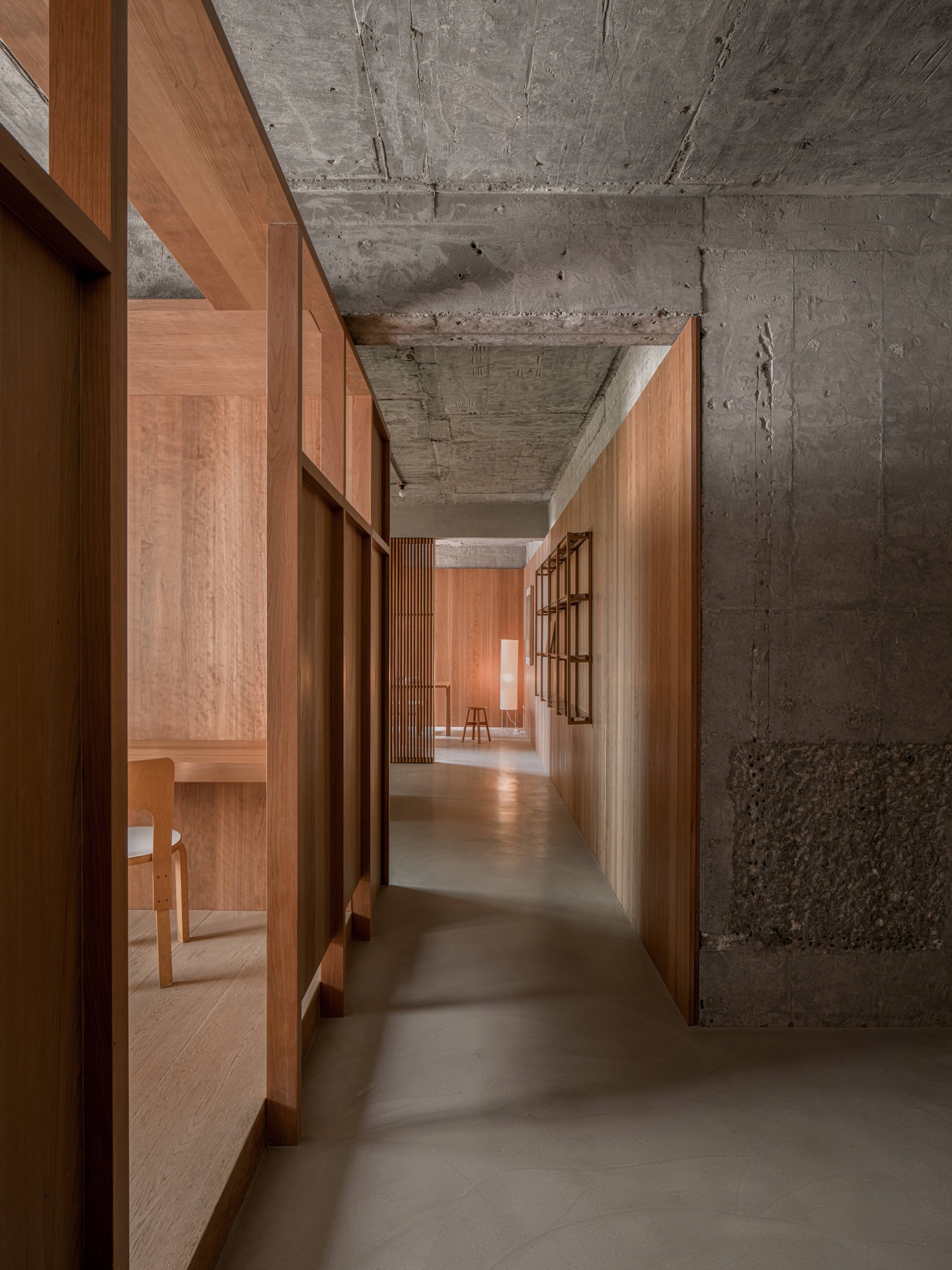 Timber Structure in Concrete is a minimal space located in Shanghai, China, designed by WUY ARCHITECTS. Upon entering, guests are greeted by a large elm wood box, which naturally separates the entrance from the display area. This distinct division also sets the tone for the flow of the interior, enhancing the visitor experience with both functionality and a clear spatial arrangement. To the right of the passage is the display area, which doubles as a central hub, offering access to the office, exhibit, and reception spaces. Within the office, a wood-constructed “cabin” was designed to provide both privacy and ample natural light. This enclosure offers a sense of security while maintaining a welcoming atmosphere for clients. The office floor is fitted with custom wood planks laid horizontally in four-meter lengths, contributing to the clean, seamless look.