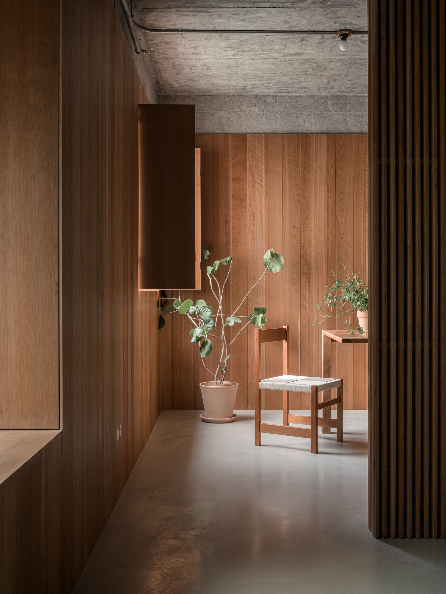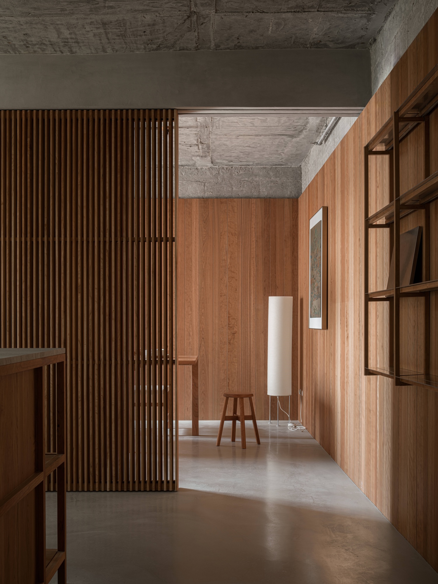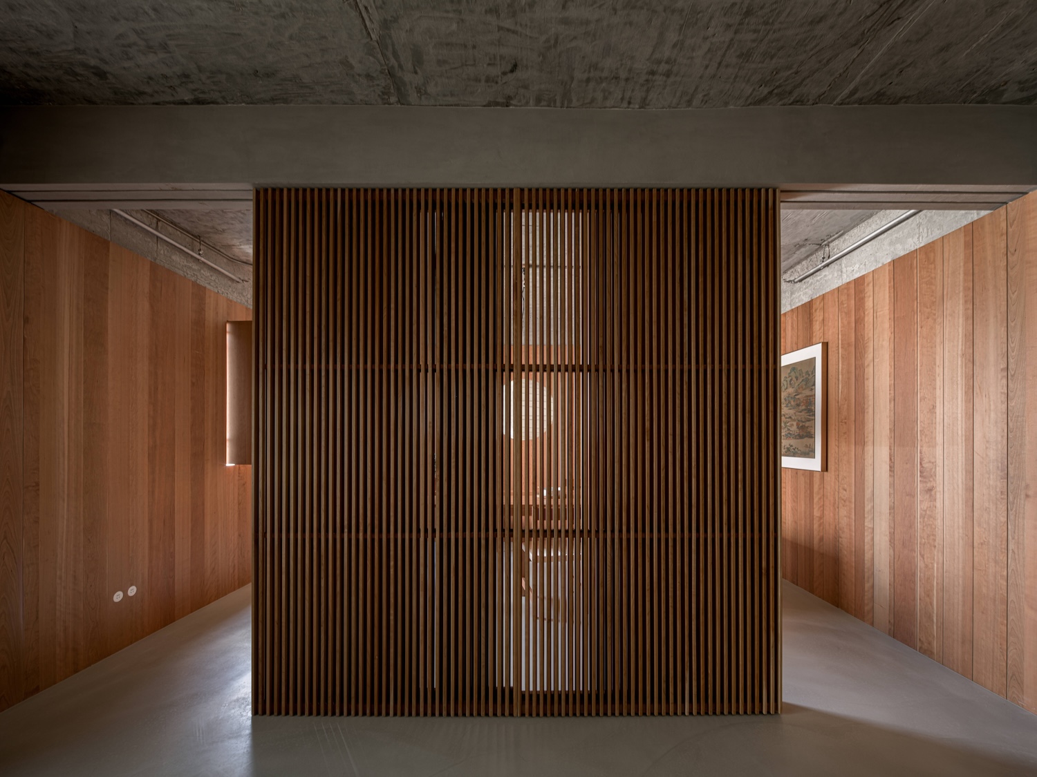 비례감과 조형성: 목재 패널의 수직 비례는 공간을 높아 보이게 하며, 콘크리트의 매끄러운 표면과 대비를 이루어 시각적으로 조화롭습니다.
