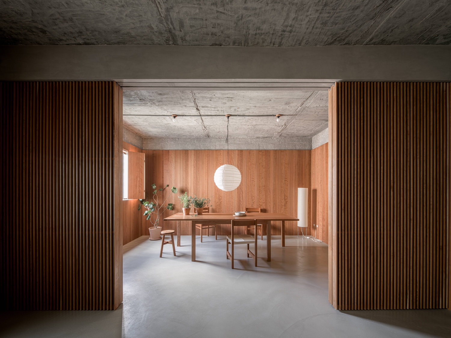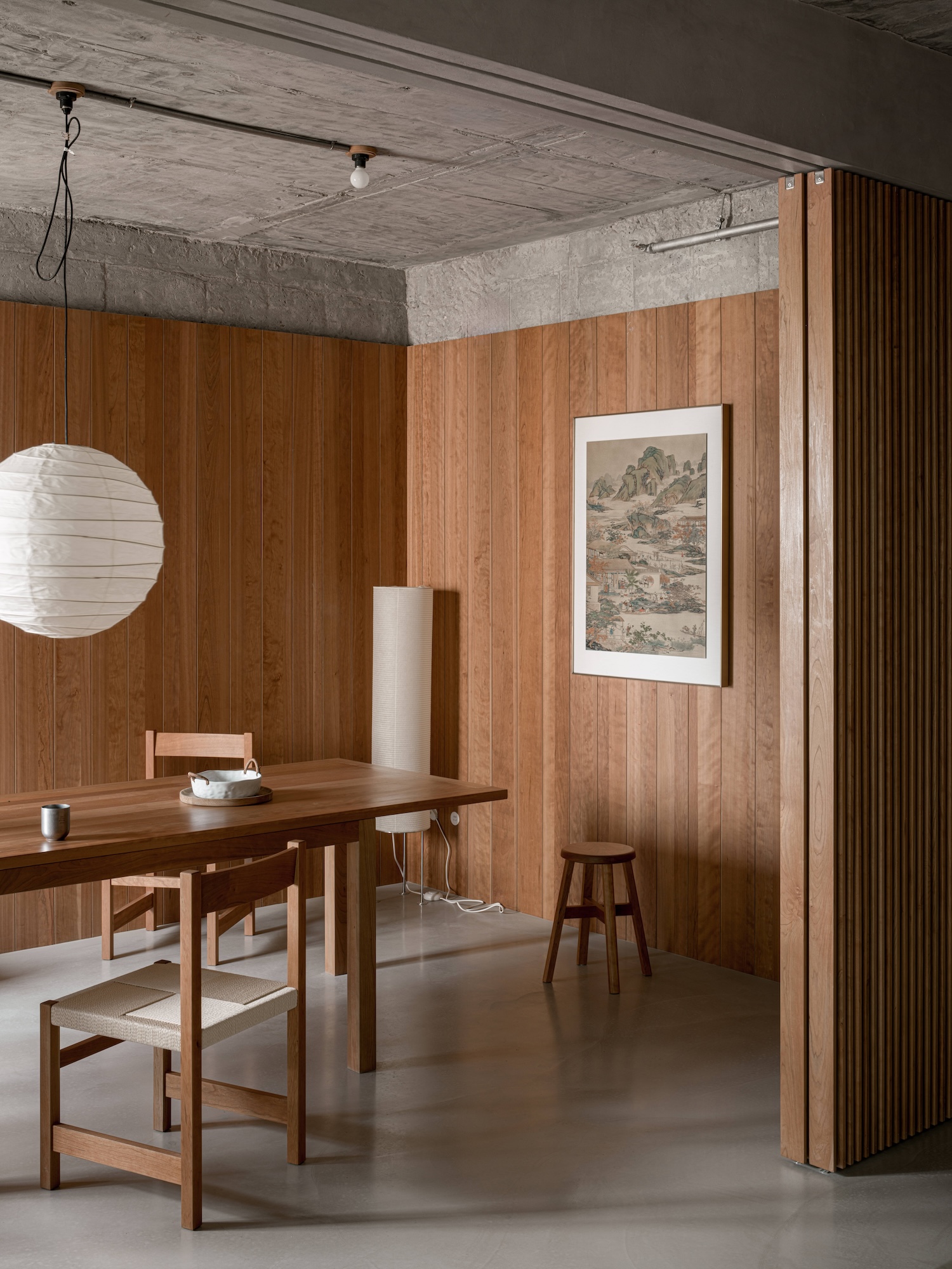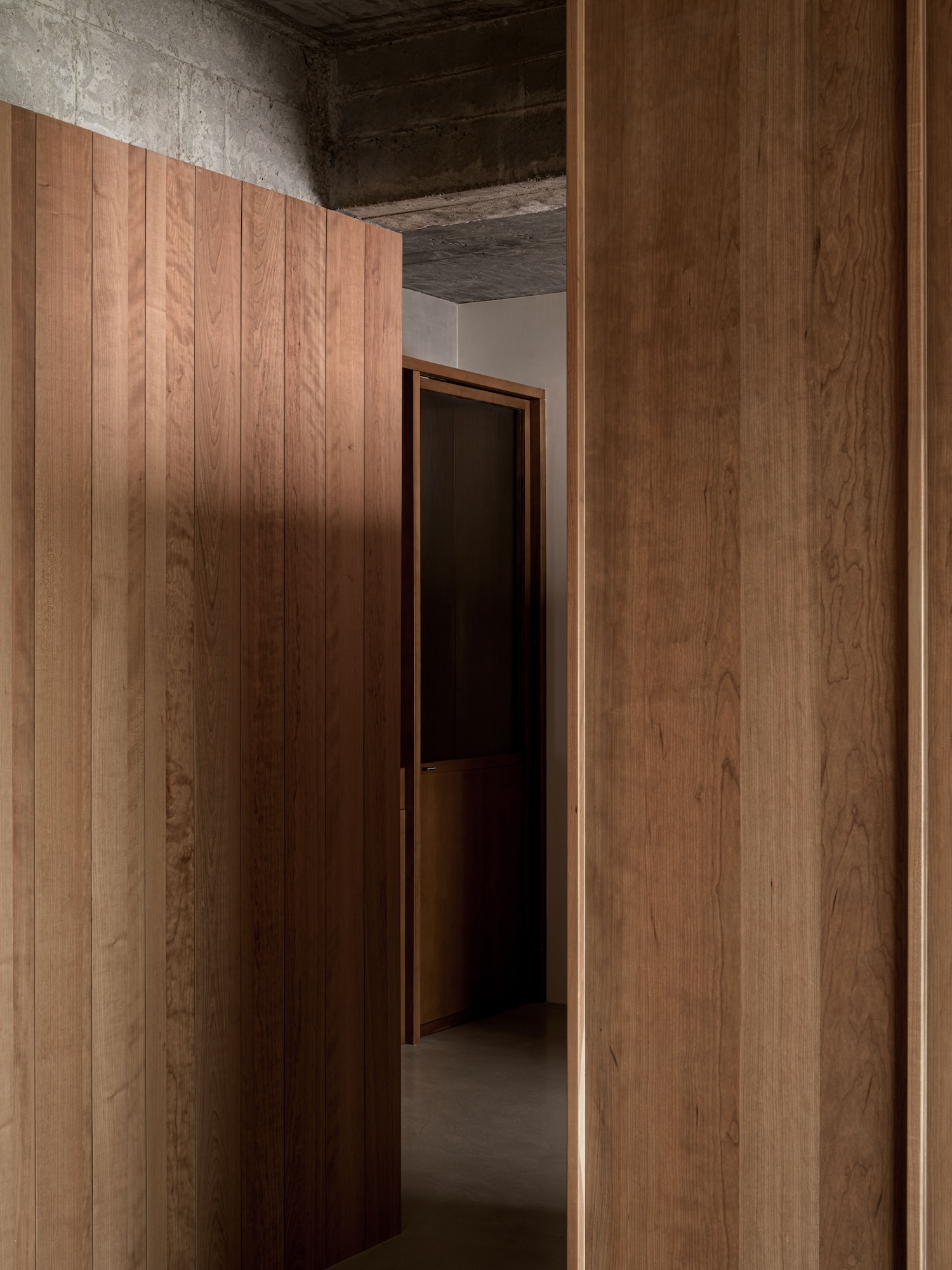 비례감과 조형성: 목재 패널의 수직 비례는 공간을 높아 보이게 하며, 콘크리트의 매끄러운 표면과 대비를 이루어 시각적으로 조화롭습니다.
