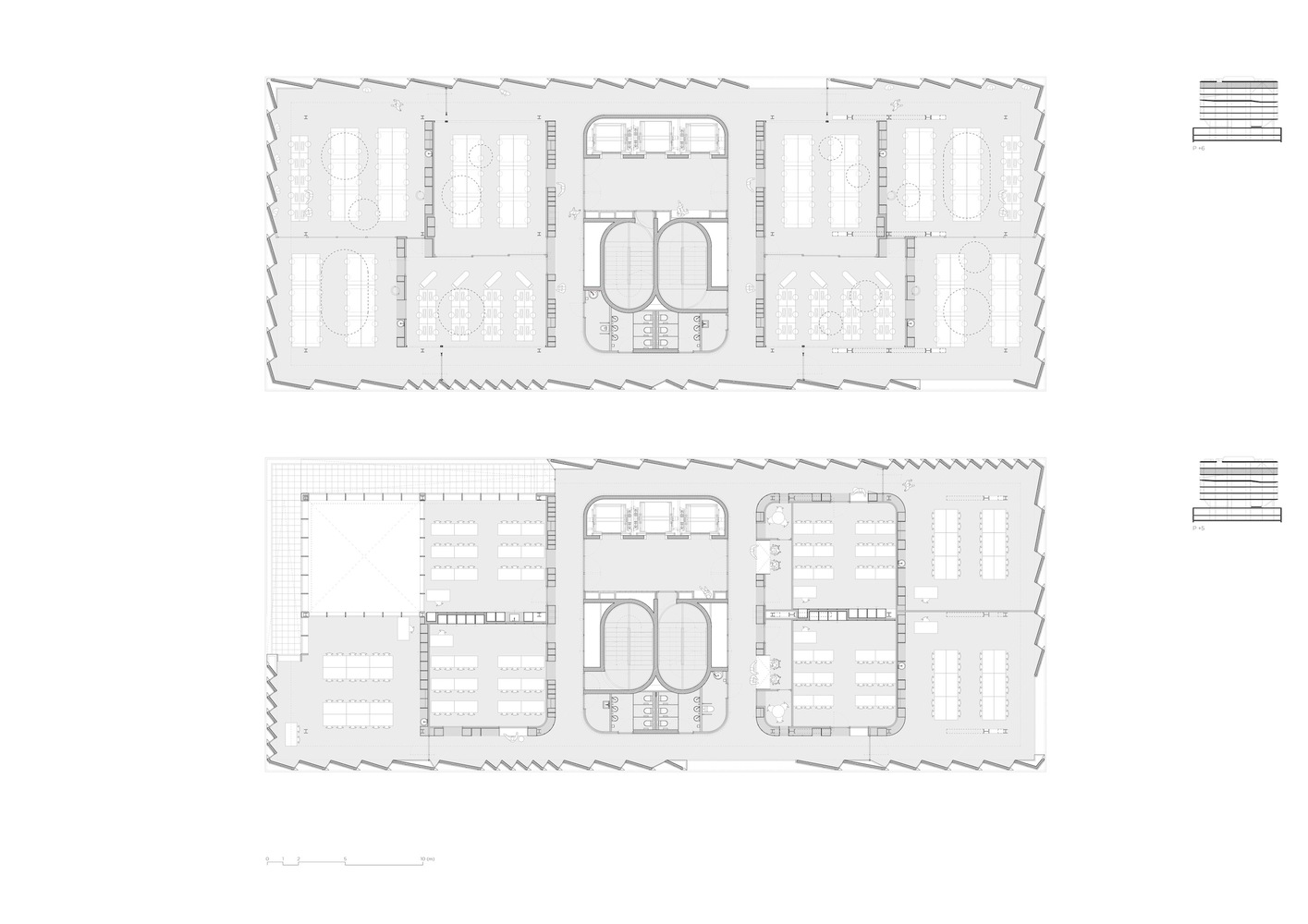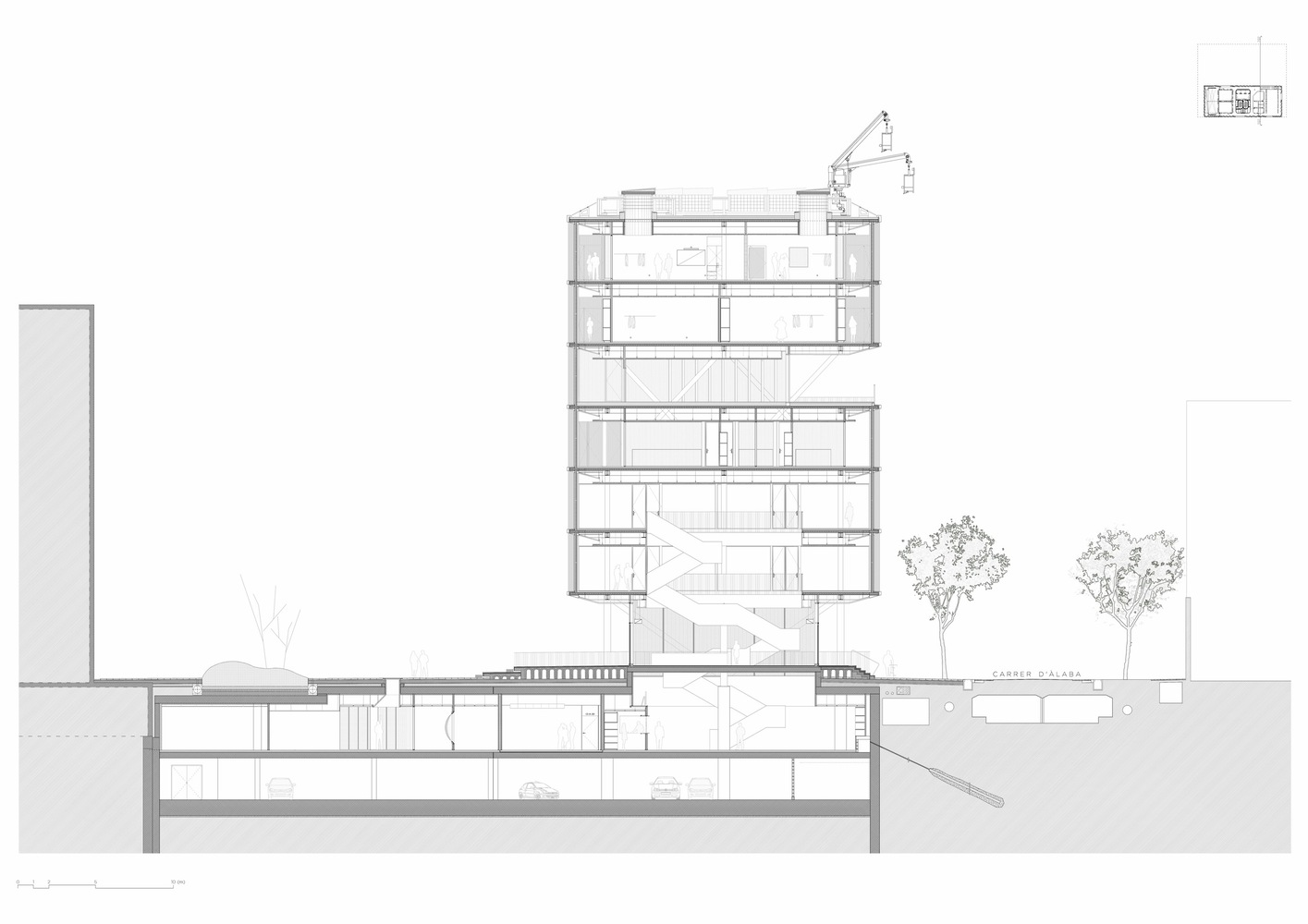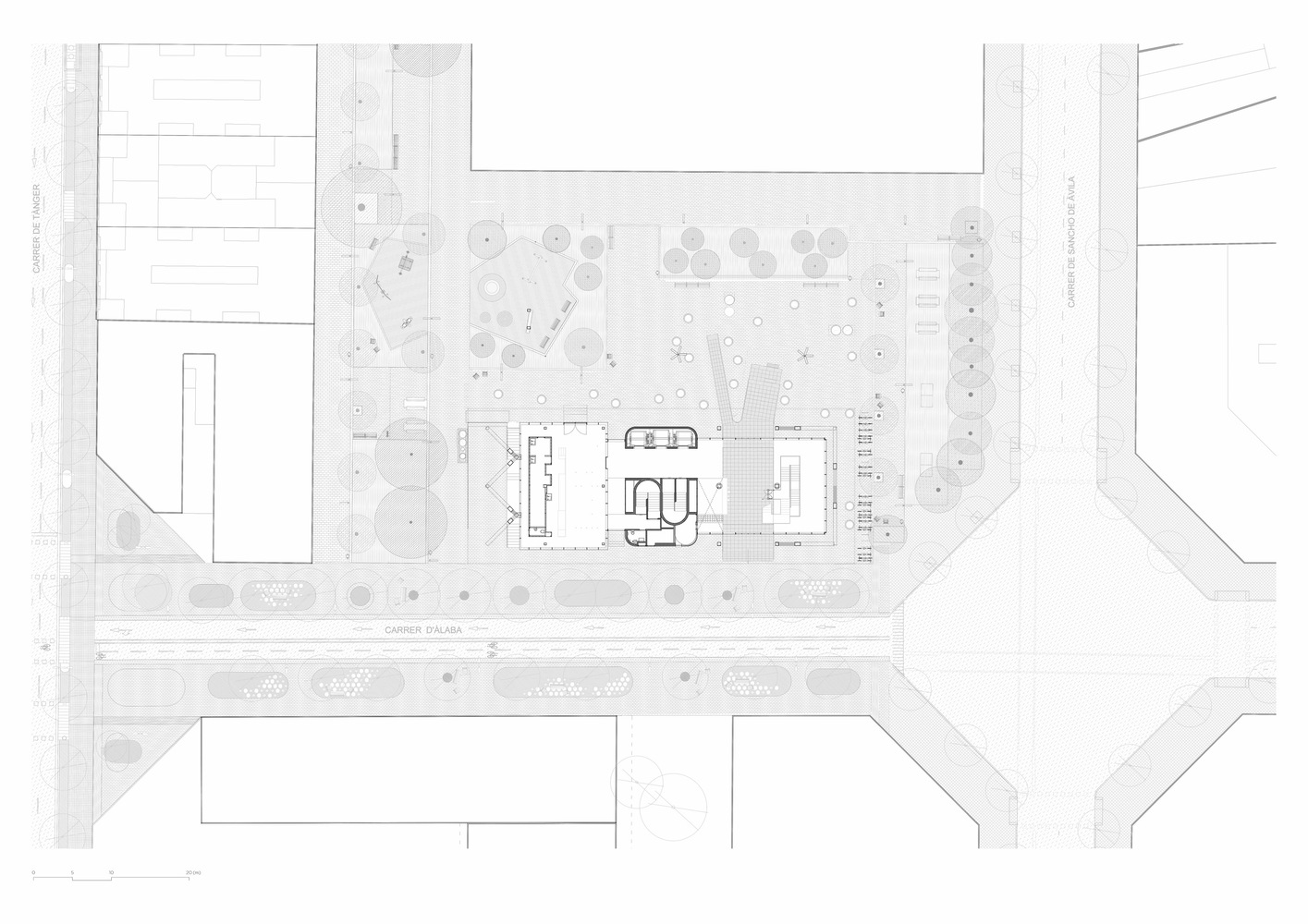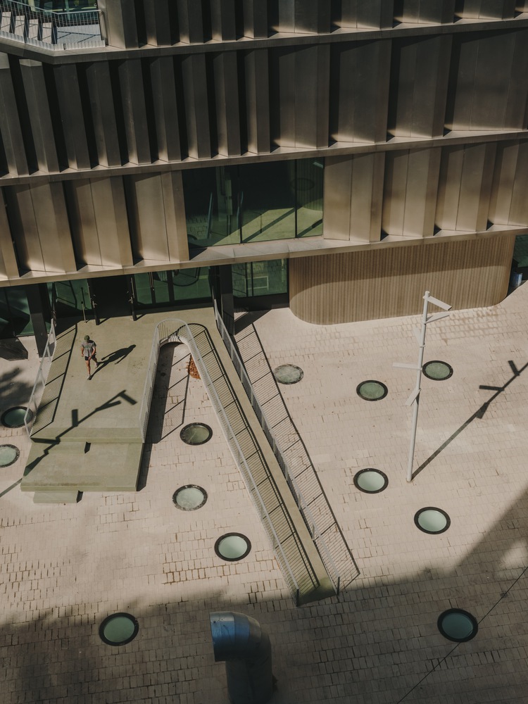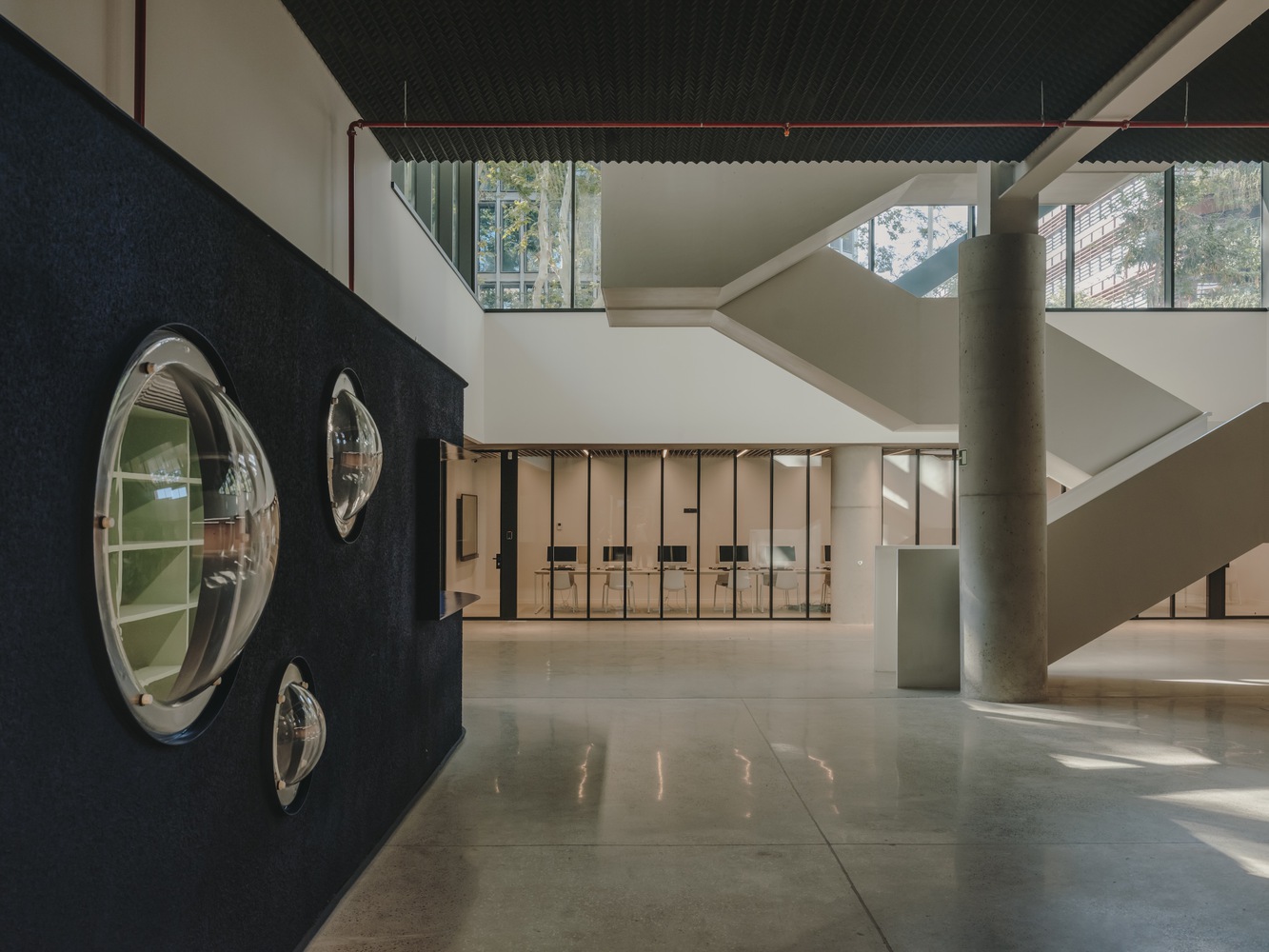 Underground, the building also incorporates the plaza footprint, resulting in a vast open space for students. Here, two large flexible halls for various activities coexist with workrooms, laboratories, and fabrication workshops, all illuminated by natural light filtering through the ground floor double-height spaces and skylights from the plaza above.