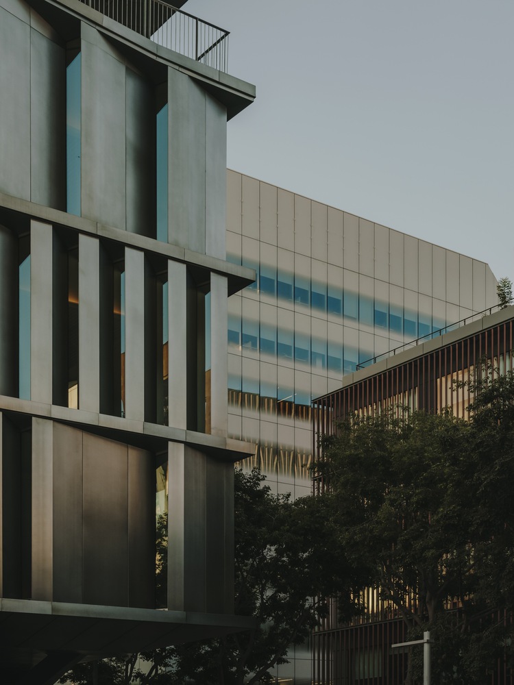 Below ground, a social journey for students unfolds, linking the ground floor and the first two levels through a metal staircase that crosses a quadruple height entrance foyer. Between the third and fifth floors, circulation continues externally along the recessed façade, encircling the library and linking to the "raised plaza" of the campus, located at the heart of the building (fourth floor). This space faces the sea, taking advantage of the breeze while sheltering from direct sunlight thanks to a protective overhang.