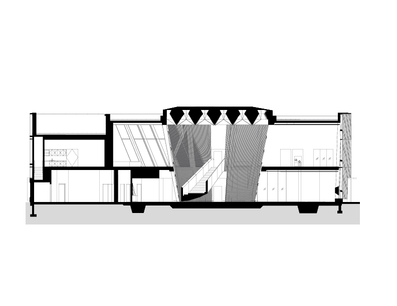 구성 및 배치: 아트리움을 중심으로 공간이 계층적으로 구성되어 있어, 상층부의 독서 공간과 지하층의 서고 및 직원 공간이 자연스럽게 구분됩니다. 아트리움은 방문자들이 쉽게 이동하고 방향을 찾을 수 있도록 유도하며, 건물의 순환 동선을 최적화합니다.