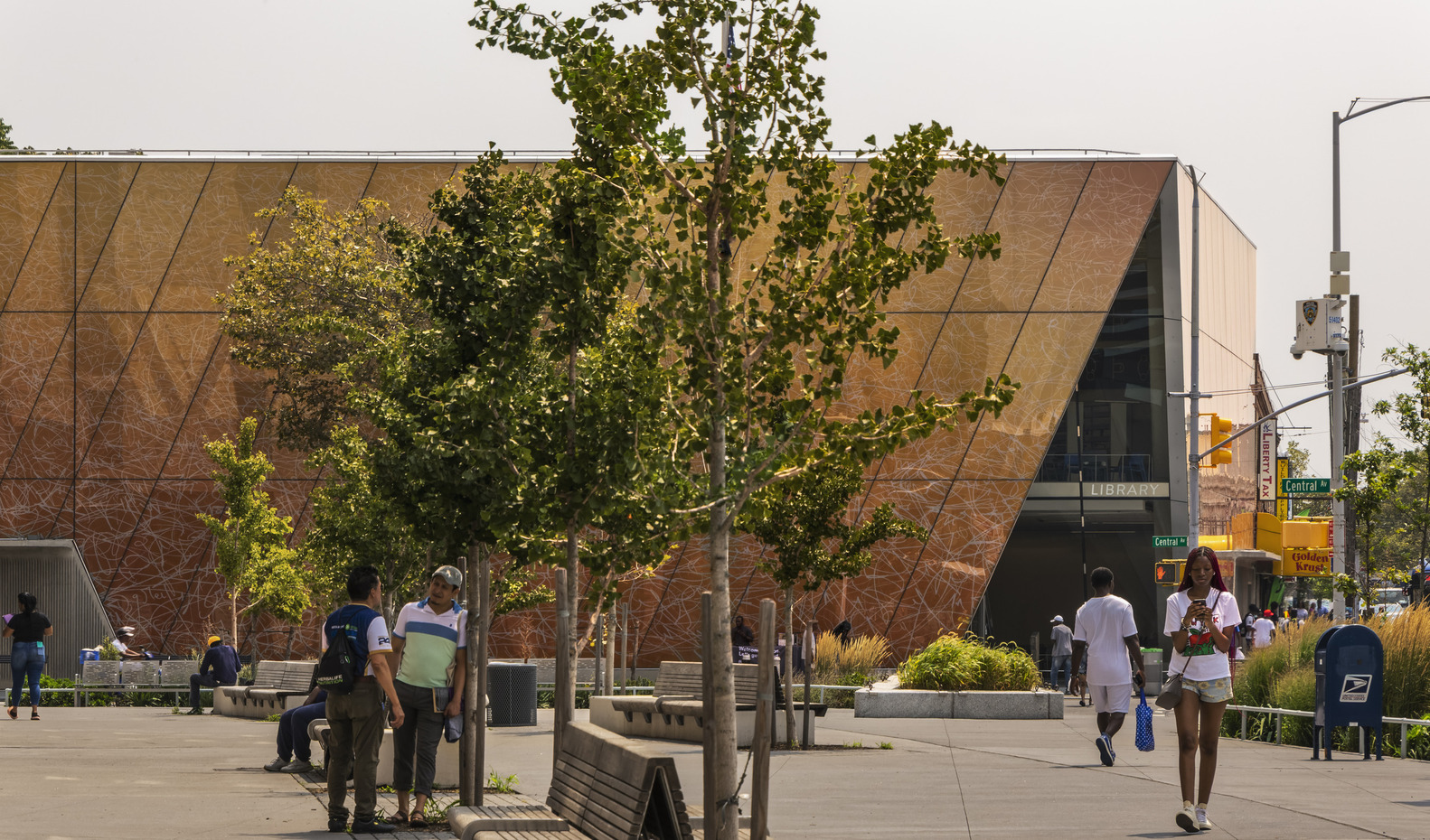 The idea for the library's simple form provides a calm contrast to the visual noise of surrounding retail outlets. At the same time, it reinterprets the traditional New York City public library typology as a repository for books, integrating the building with diverse collaboration and social spaces, including a teen room and private meeting centers. Doubling the area of library spaces, the design creates a renewed visual identity for one of the borough's most ethnically diverse communities. Programming includes after school study hours, story reading, and community events, as well as a new public garden. It also has offices, along with a book sorting area, a staff lounge, and lockers. The second floor includes both adult and children's reading areas, a meeting room, and a Small Business Center.