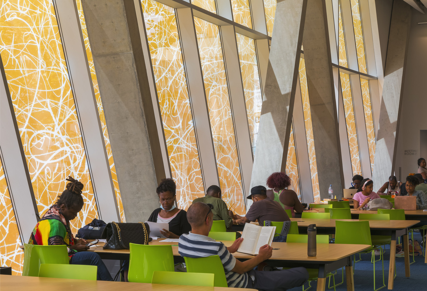 내부 디자인: 도서관 내부는 역피라미드형 아트리움을 중심으로 구성되어 있습니다. 이 구조는 자연광이 지하층까지 투과시켜, 밝고 개방적인 공간을 연출합니다. 디크로익 글라스 난간은 각도에 따라 색이 변하며, 칼레이도스코프와 같은 생동감을 공간에 부여합니다. 이러한 시각적 효과는 방문자에게 다양한 감각적 경험을 제공합니다.