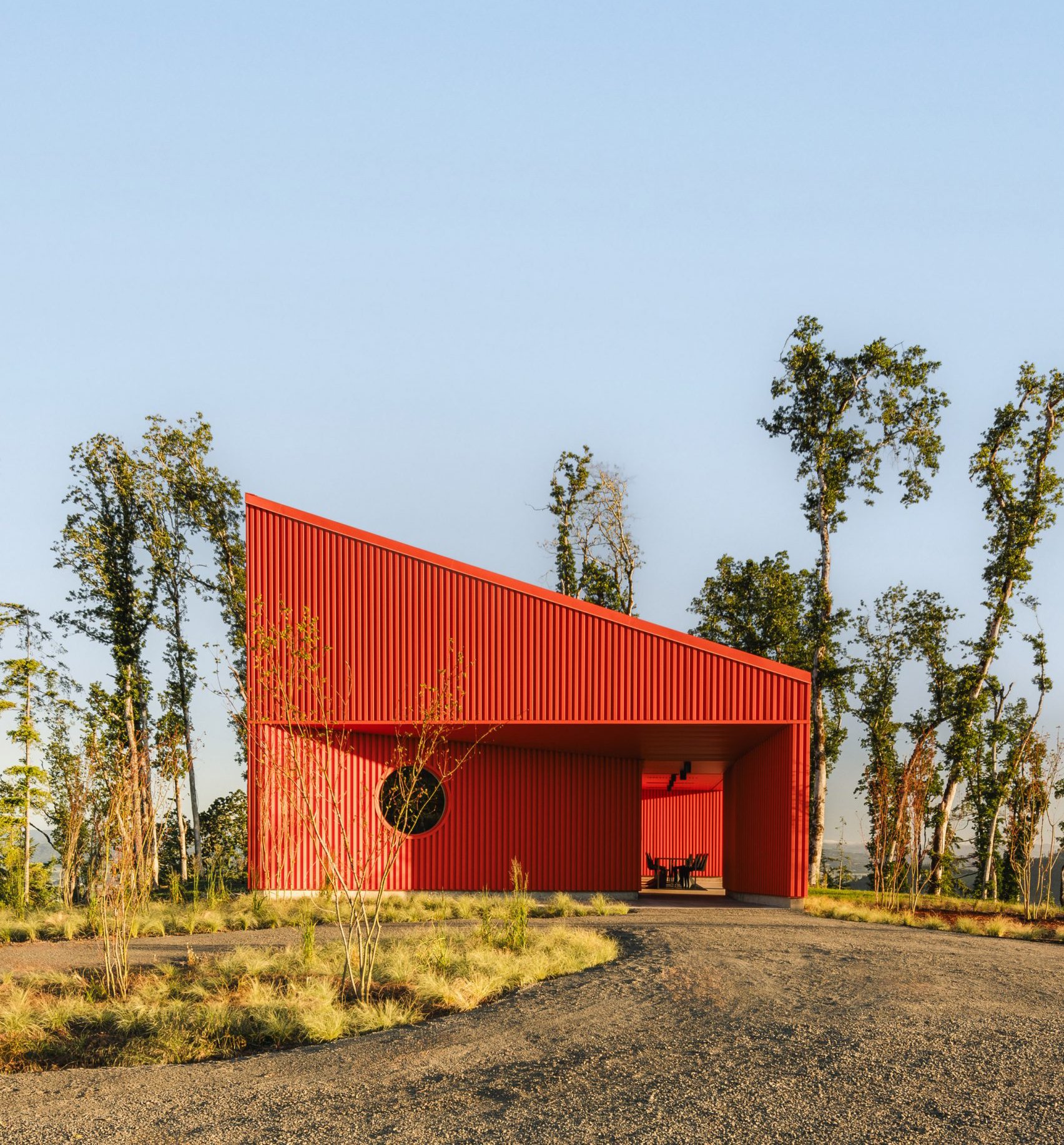 오리건주의 푸른 Willamette Valley에 자리 잡은 Corollary Wines 와이너리는 포틀랜드에 기반을 둔 Waechter Architecture가 설계한 독창적 건축물로, 붉은 금속 패널이 숲 속에서 마치 섬처럼 강렬하게 떠오릅니다. 이 와이너리는 대표 와인 레이블인 Cuvée One의 색에서 영감을 받아 브랜드의 개성과 자연과의 조화를 동시에 담아내고 있습니다.